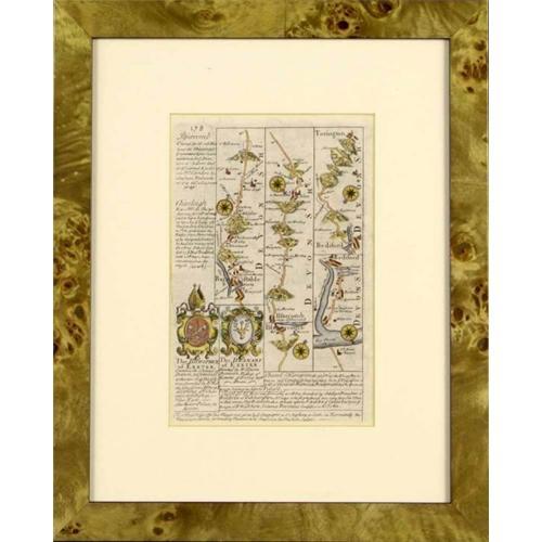 </font></strong>Road from Barnstable to Torrington by Emanuel Bowen after the earlier surveys by John Ogilby and published by John Owen between 1720 and 1764, passing through Pilton, Bradford, Prickworthy, Bittaden, Stoford, Ilfracomb, Stracum, Ham, Santon Court, Vertida, St.Ann's Chappel, Watterton, Northam, Bediford, Ware, Harwood to Torrington. This map has the Arms of the Bishoprick of Exeter and the Deanary of Exeter with descriptive text engraved on the face of the map. Copper engraved map with recent hand colour. Excellently framed for display.Size 11.5x18cms/4.5"x7". </font>