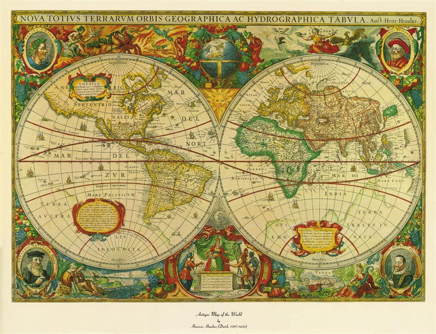 Henricus Hondius Antique Map of the World (Dutch, 1597-1651) - Medium: Fine (Art Reproduction) Giclee on Canvas - Image Size: Approximately 30.5 inches x 40 inches - Framed: Unframed on Unstretched Canvas