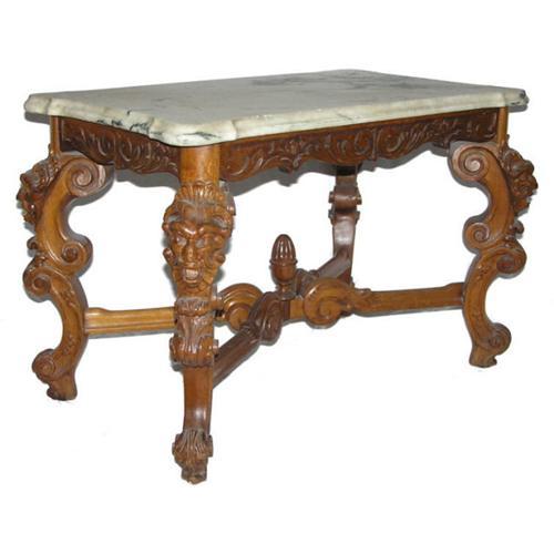 This beautiful marble-top low table, hall or window bench features elaborate carved decoration and elements of both 17th century (French rococo) and 18th century (English Georgian) design. The cabriole legs are formed by two opposite "C" scrolls with classical masks with ram horns at the shoulder. The x-shaped stretcher is formed by four straight members ending in large scrolls, and is punctuated with an acorn finial. The frieze is decorated with leafy scrolls. Believed to date from the late Victorian period, it is likely either of English or American origin. Measures 27" wide, 17" deep and 18.25" high.