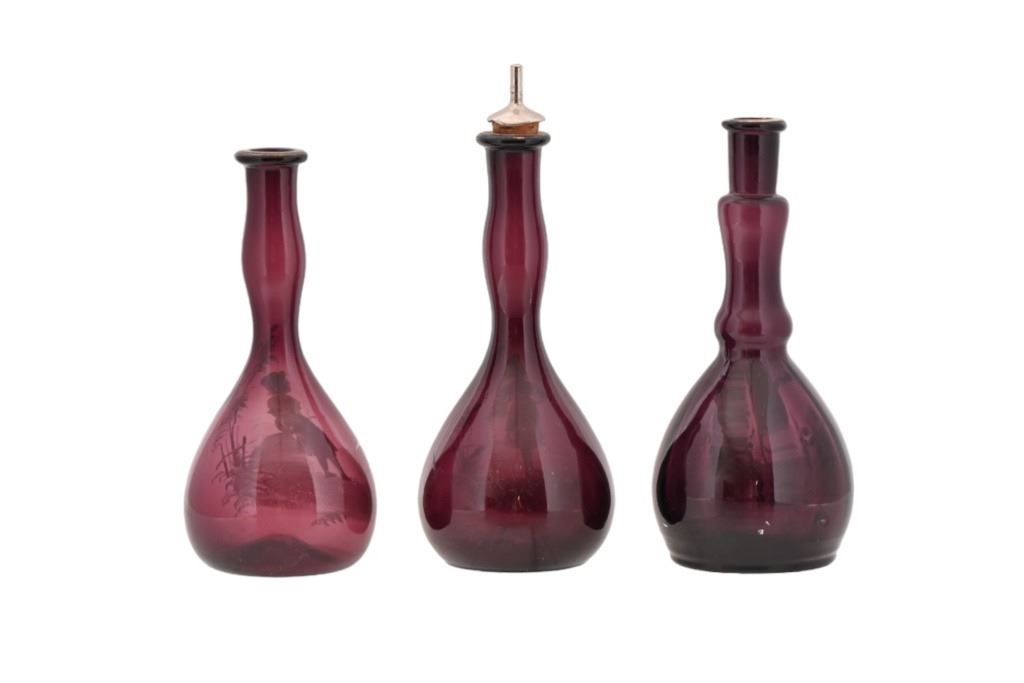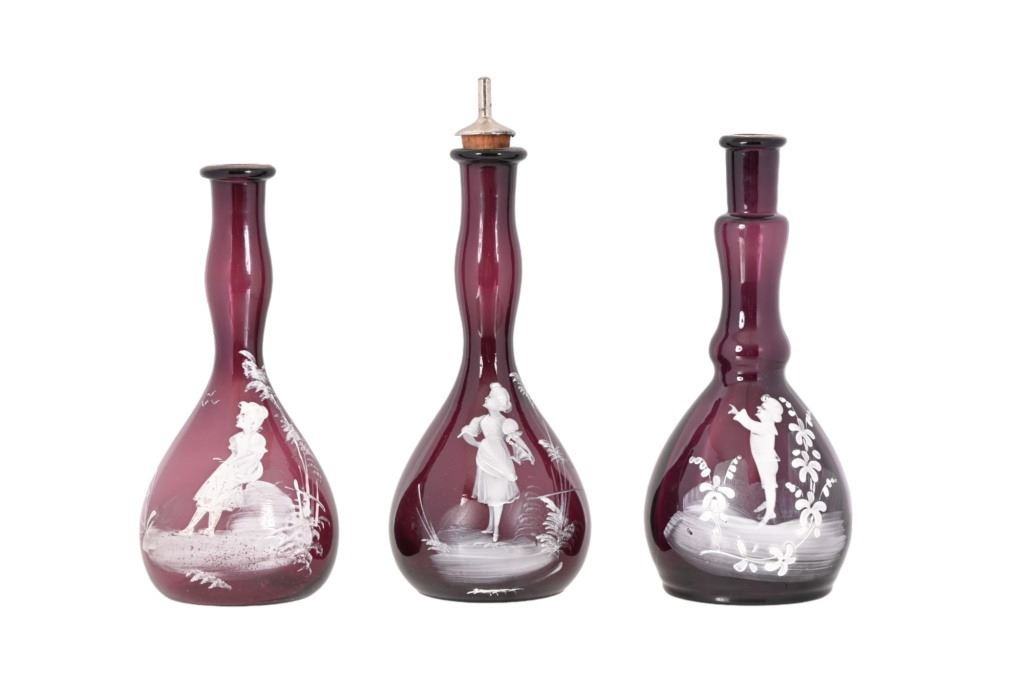 Hand painted. One has pour spout. 7.5 to 8 in. tall. Cranberry in color.