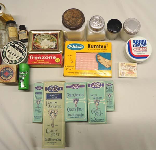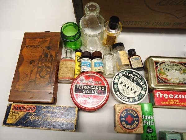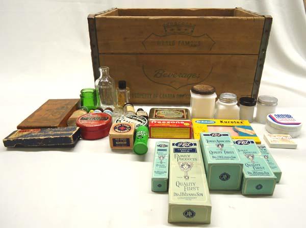 Antique Medicine Cabinet Made from Wooden Ginger Ale Box, measures approx. 16 1/3''L x 8 1/2''H x 11''W. Vintage numerous medicine bottles etc. ''JBL'' Toilet Articles (Boxes), Dr. Scholl's Jurotex Moleskin, Arrid Extra Dry Cream, White Cloverine Brand Salve, etc. Buyers Pay Actual Shipping and Handling Charges(see terms and conditions for more information).
