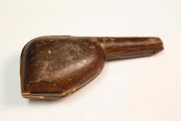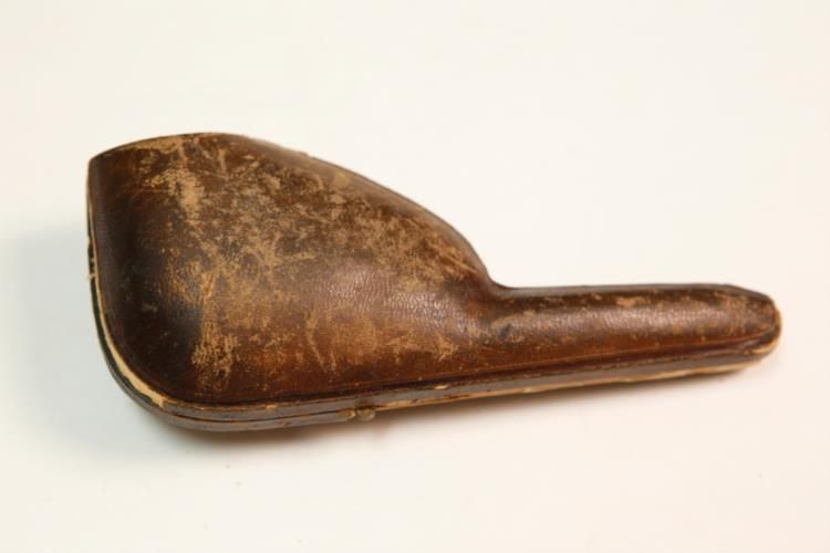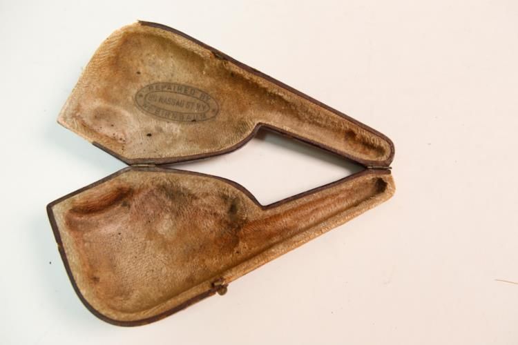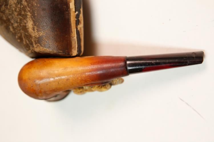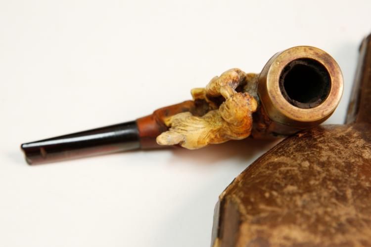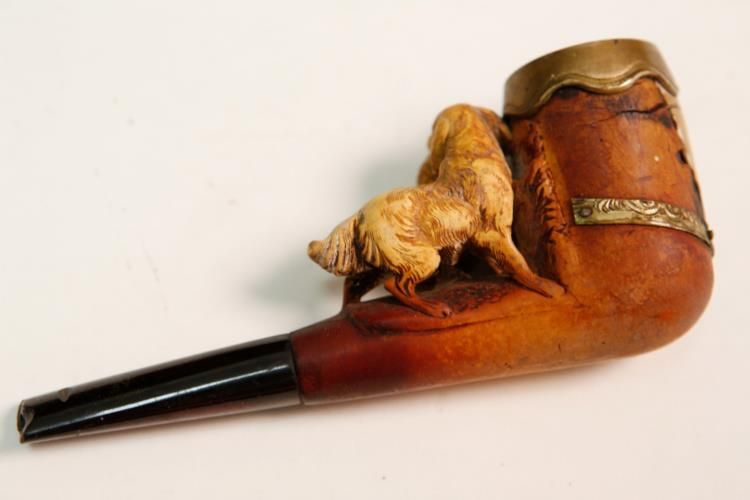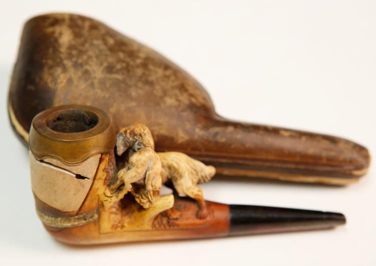 Antique Meerschaum Pipe Carved Hunting Dog Tobacco Case. Features a hunting dog retreiving a rabbit. Measures 5" in length and 2.25" in diameter at its widest. Comes with carrying case that reads: "Repaired by W Birnbaum 80 Nassau St. NY."