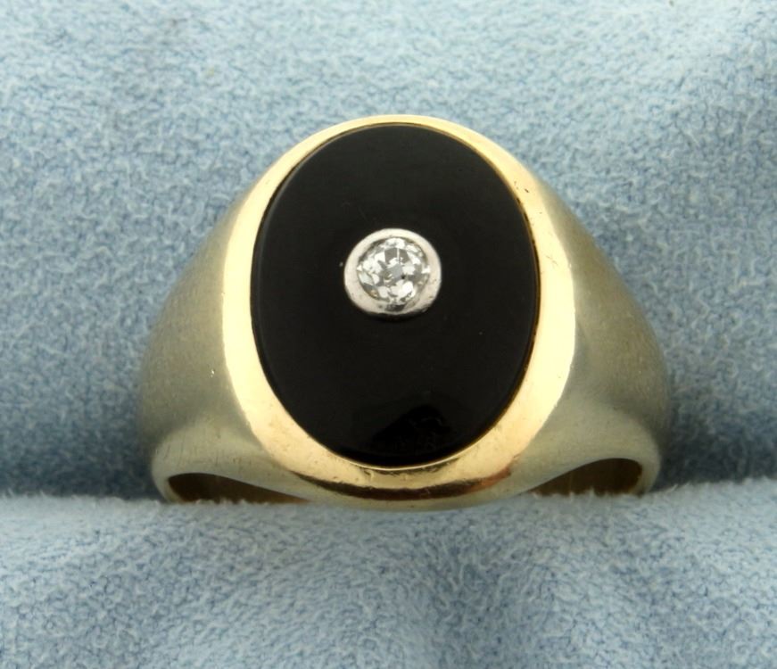 In 14k yellow gold, containing a .1ct old European cut diamond SI clarity/H color. Size 11 1/2. 11.5g.