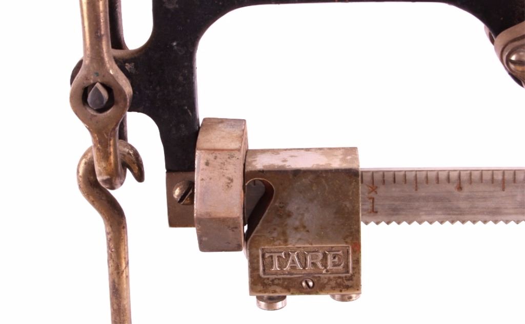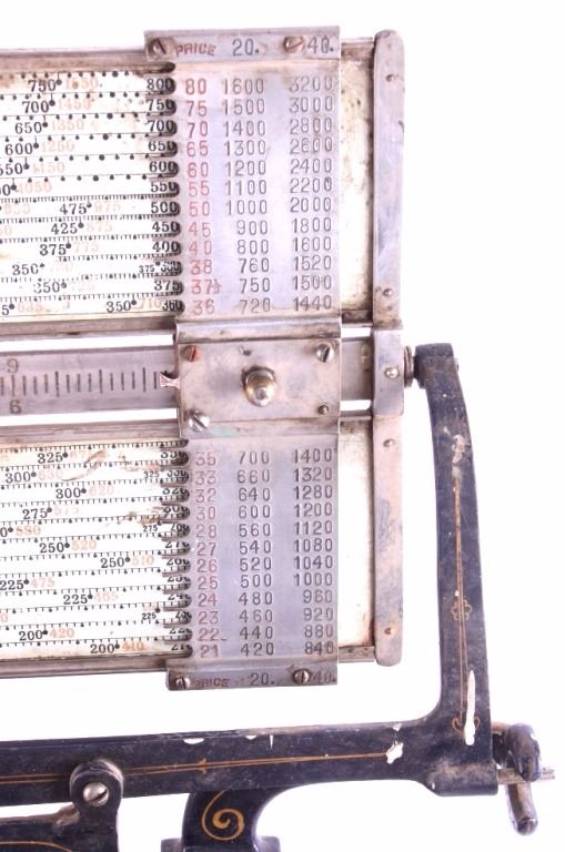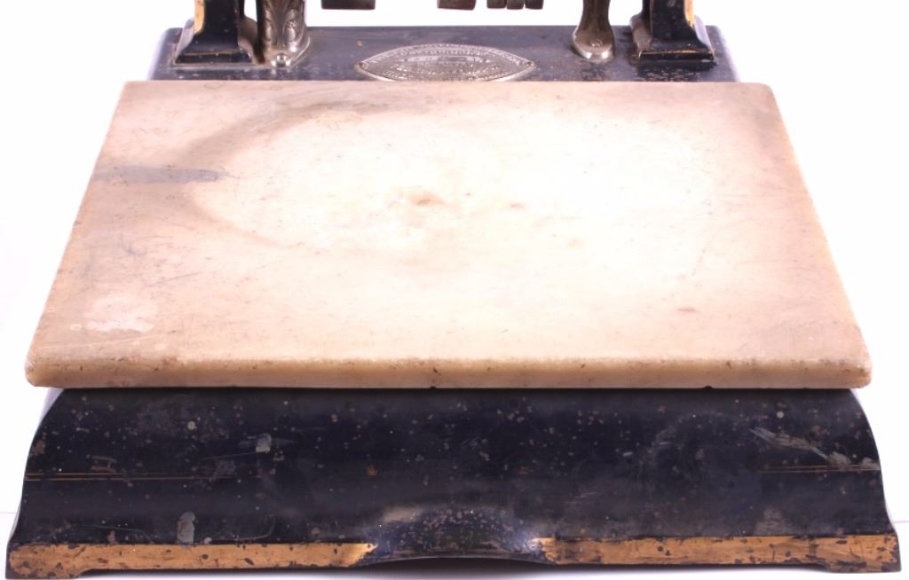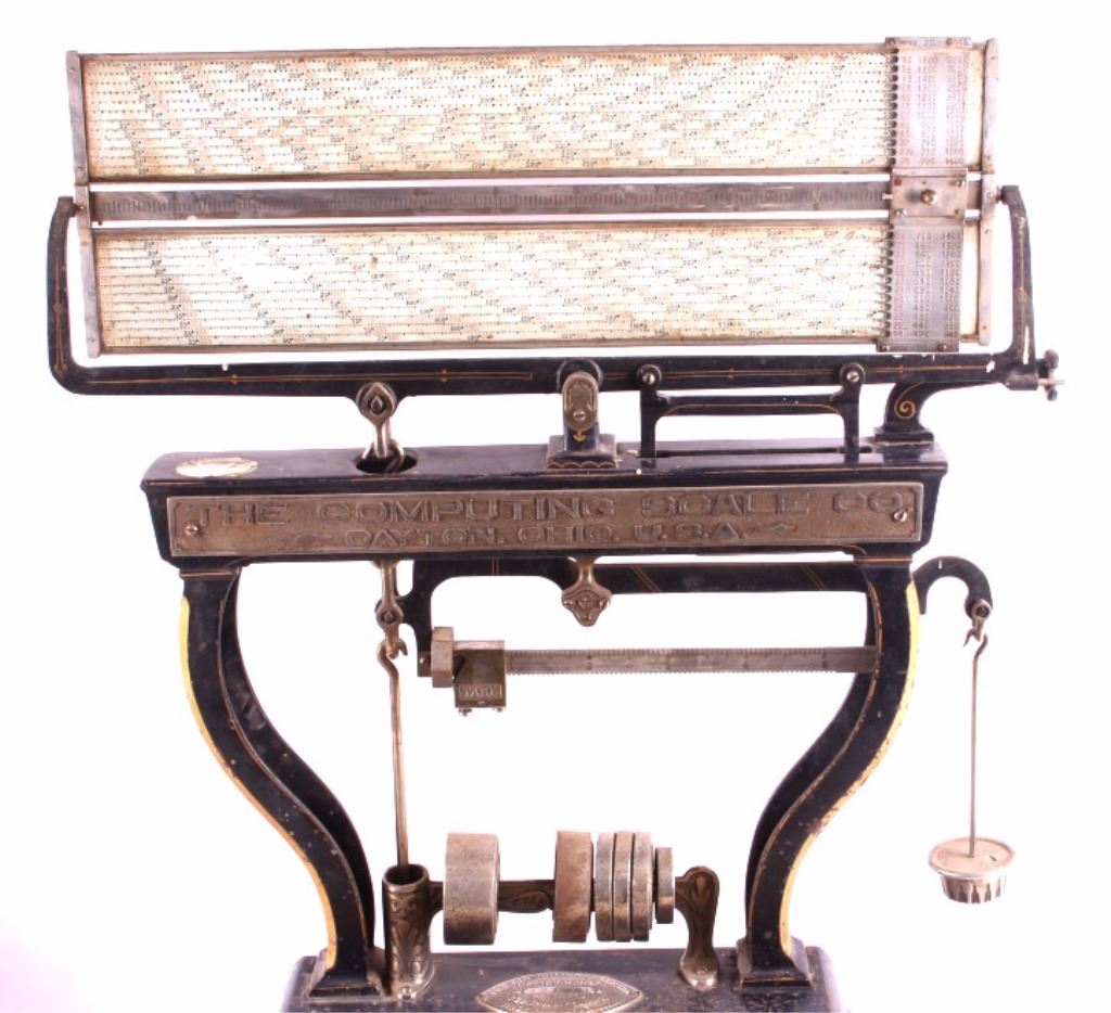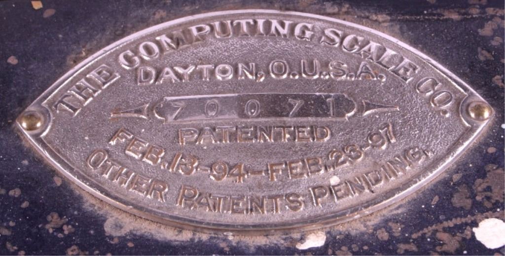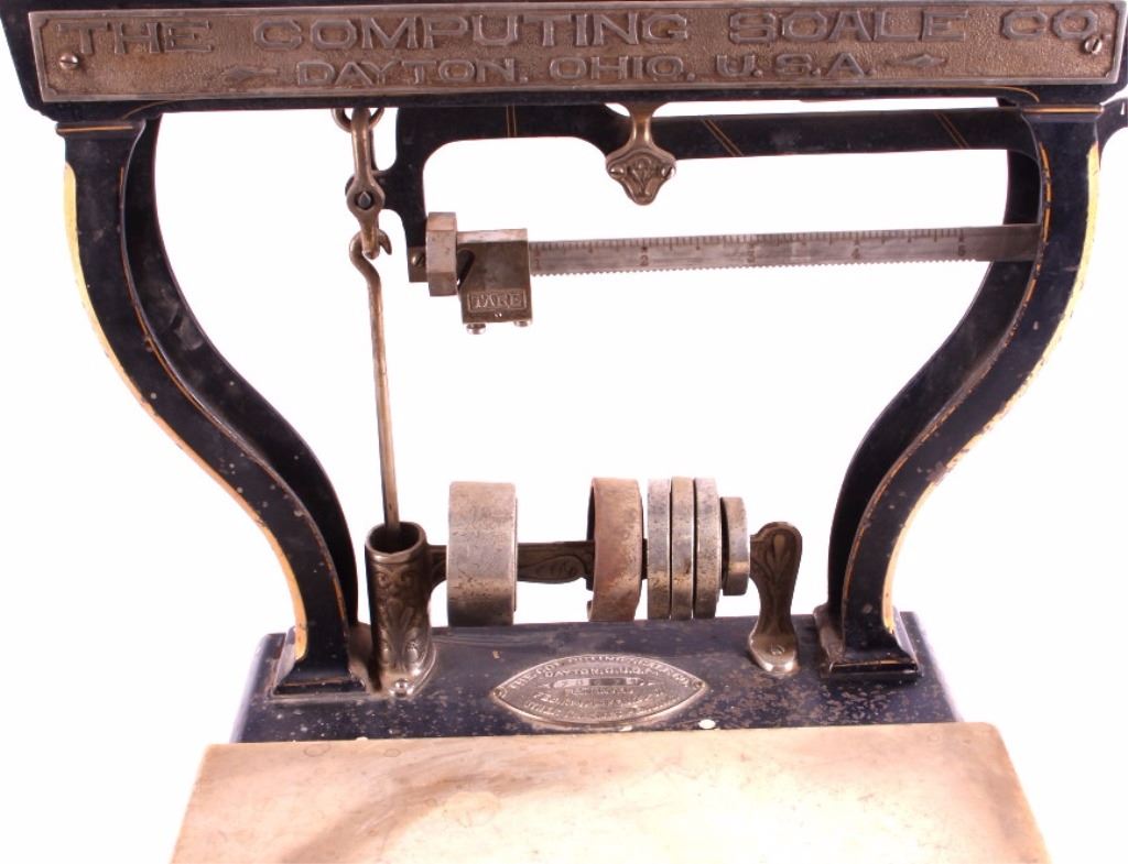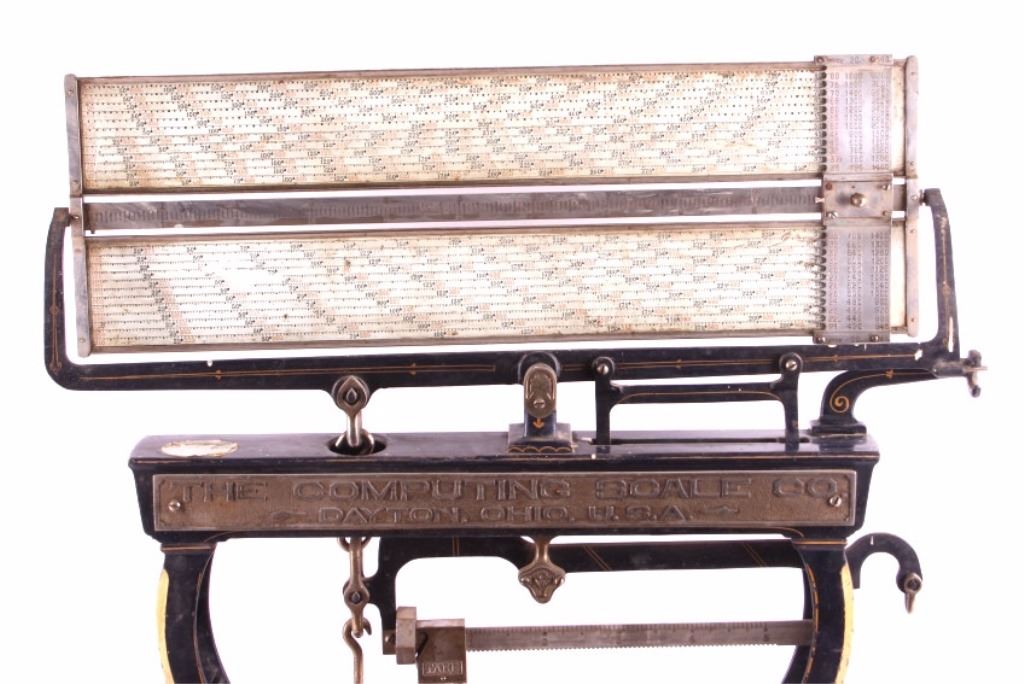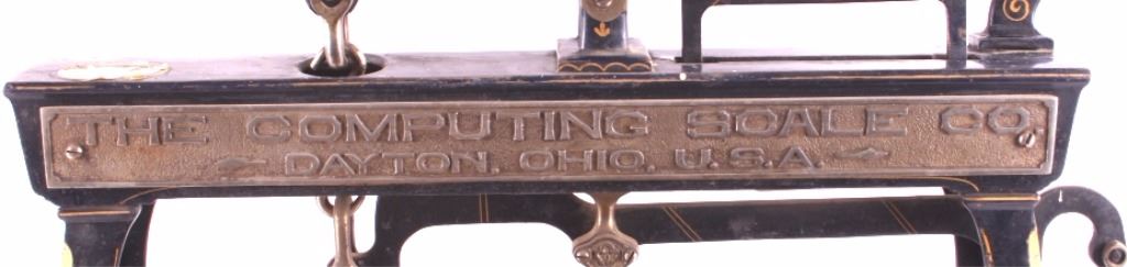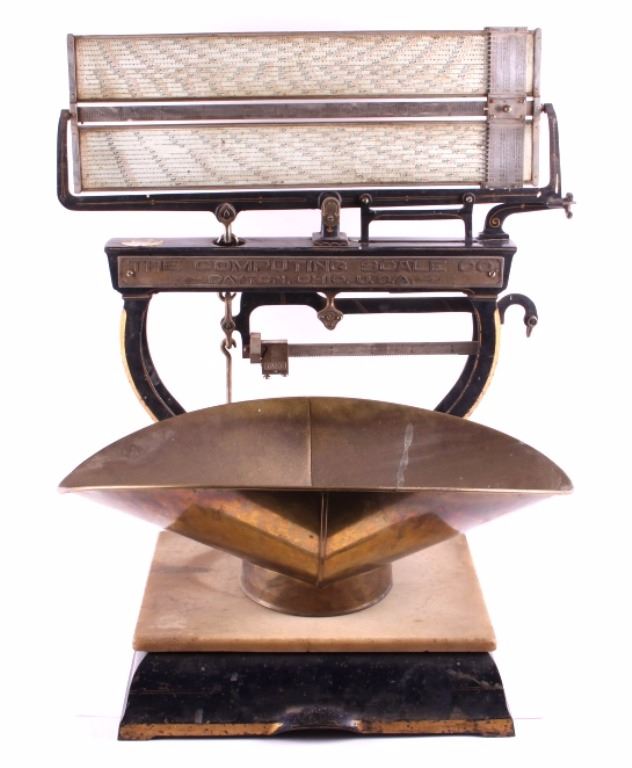 This is an antique mercantile computing scale. The scale has a cast iron frame with a marble platform in addition to a brass pan. The computing slide rule sits at the top of the scale. For its time, this was a highly efficient way for a merchant to weigh and sell goods. The scale is marked "The Computing Scale Co. Dayton, Ohio, U.S.A.". The scale is in good overall condition. It does show wear consistent with age and is in working condition. The scale measures 19" x 25" and is 27.5" tall.