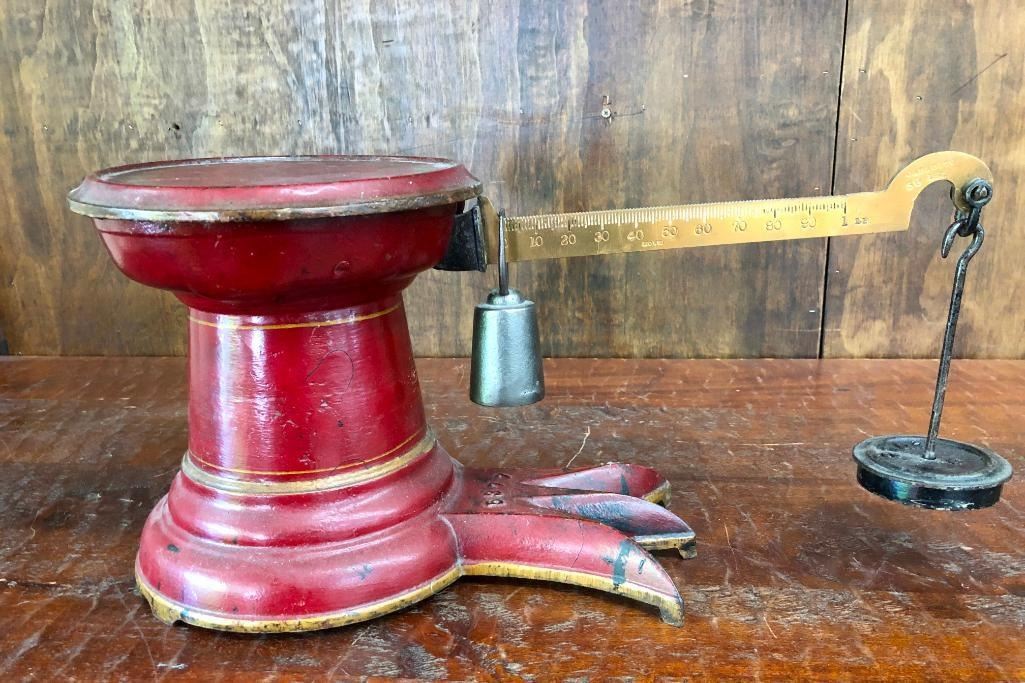 For your collection we offer an antique "three toe crows foot" scale by Howe. This scale seems to function and it features red paint with gold trim and it also comes with some counter weights. This old scale is perfect for a shop display or kitchen decor, or?. MAKER: Marked, Howe. APPROX AGE: Antique. SIZE: 19 inches wide x 9 inches tall. CONDITION: Pretty good for its age, normal wear expected. Please look closely at the pictures as they are an important part of our description and are hereby incorporated into the description, specifically with regards to condition. SHIPPING: There will be a $20 handling / packaging fee for shipping this lot. The actual cost of postage will be added on top of that. BUY IT NOW: If you would like to buy this item now, without waiting for the auction day to bid on it, we do offer this option (which is available up to 48 hours before the actual auction starts). The “Buy it Now†price is the high estimate of this lot (plus applicable fees and the Buyer's premium is discounted to 10% when using the Buy it Now option). If you would like to exercise this option, you must contact us by email (or phone as long as you talk to someone live). Reference this lot number and your intention to "Buy it Now."