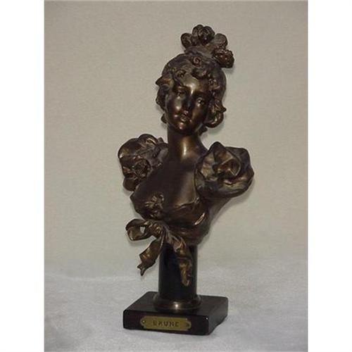A metal bust of a young lady wearing an empire style dress, 11 1/2" tall, 6 3/4" wide. A beautiful antique bust, plate on base reads "Brune".