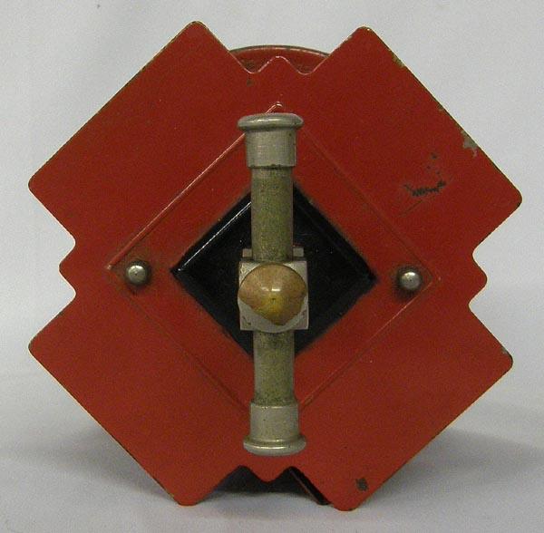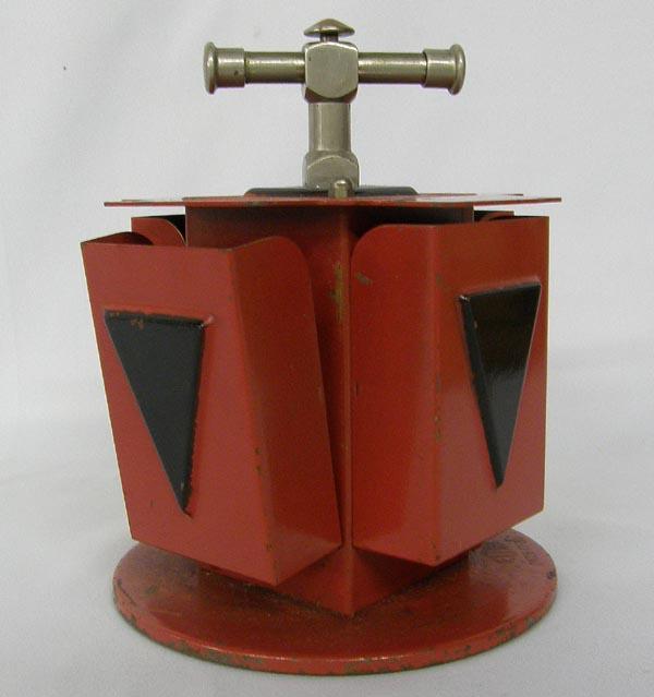 Antique Metal Playing Card Holder. Squeezing the top knob causes the four deck holders to angle out from the center. One of the deck holders is slightly loose. Measures 5.75''wx7''h. SHI $20.