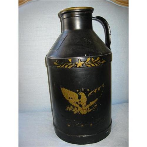 this attractive and collectible jug/foof container, is part of American Memorabilia. it was utilized as a food container,or liquid container. it has a black background with gold embossed or overlay. this jug is numbered, has American Eagle with stars embossed or overlayed on the front. it also has a rectangle tag attached to the side and reads : SEALTEST FOODS DIV. N.O.P. CORP. on the otherside. it has a round base regular metal (silver color) nothing reads on the base. again on the body also reads : AS CO 10 QTS. LIQ SEALED. assuming that it was used for liquid or food. multiple idea for decorative purpose, either makes a nice decorative lamp, or corner display. it is in good condition, some tear and wear on the base and the body. imperfection for being antique/vintage. soft golden color around the neck the same color as eagle and stars. it must be utilized in the military of some kind.