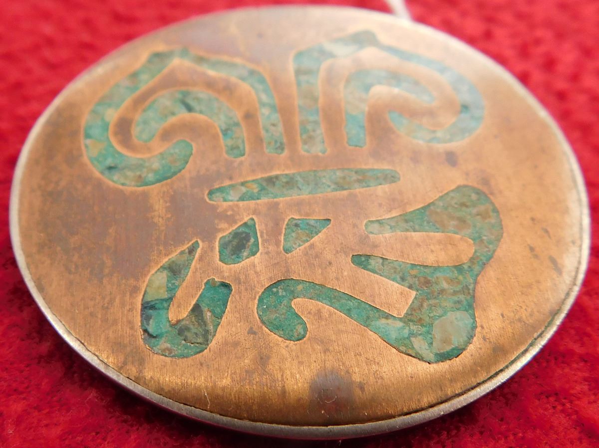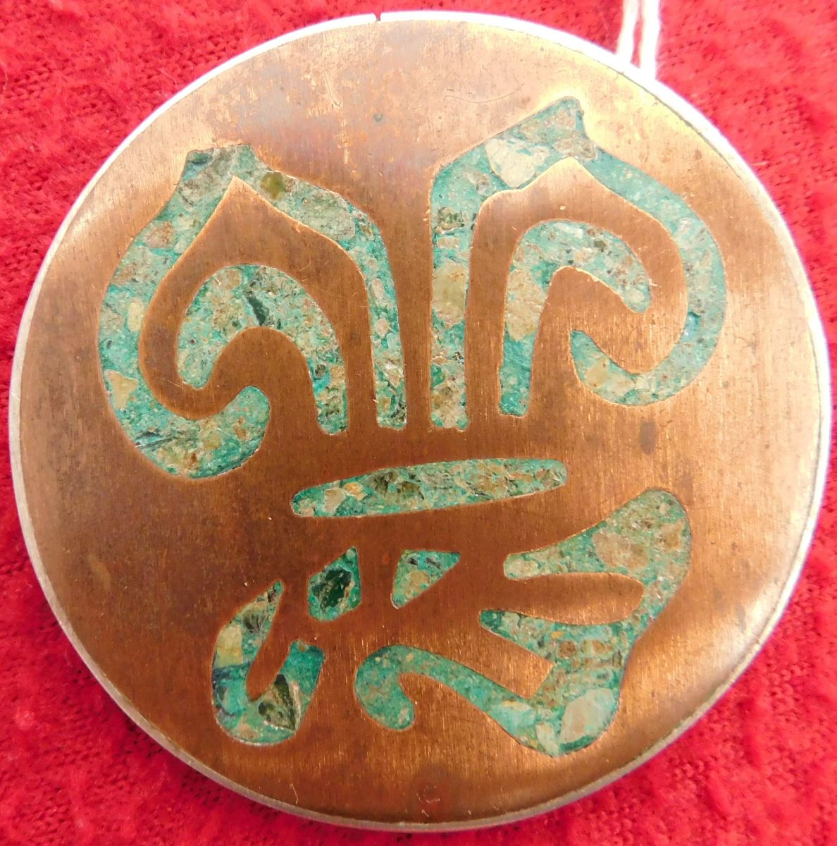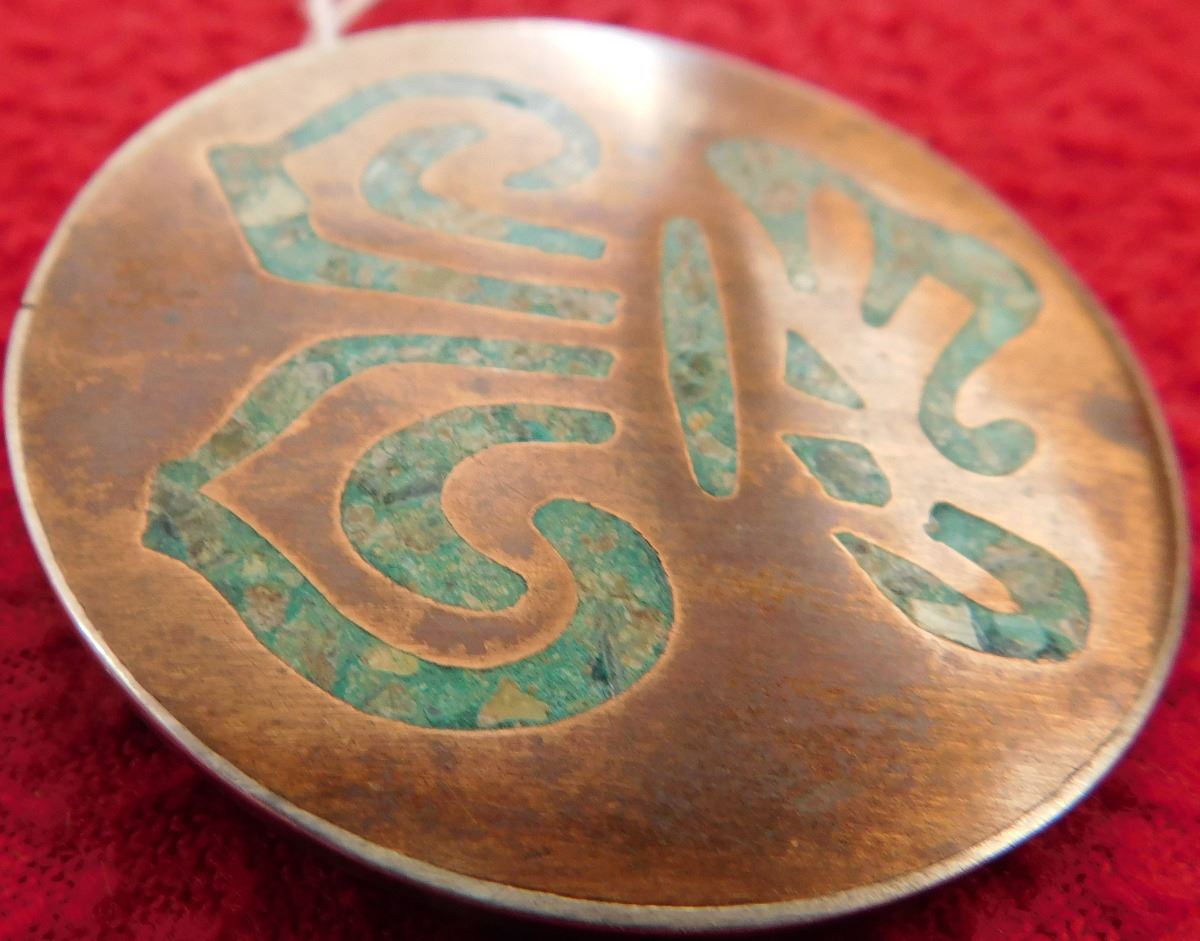 Antique Mexican Pin or Pendant, circa 1940s. Made of sterling silver, copper and greenstone, this item measures 1.75" x 1.75". Taxco, Metales Casados. Beautiful mixed media modernist pin or pendant. Weighs approx. 19.9 grams. Condition: Minor scratches, see images. Shipping: $18.50 w/insurance and signature.