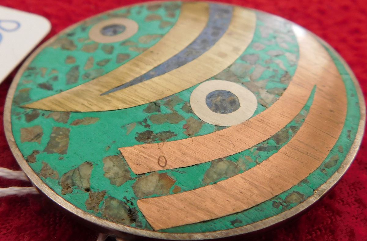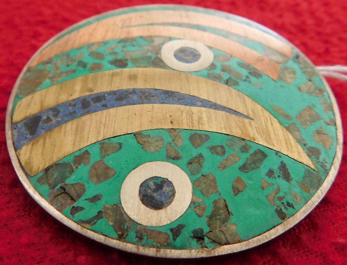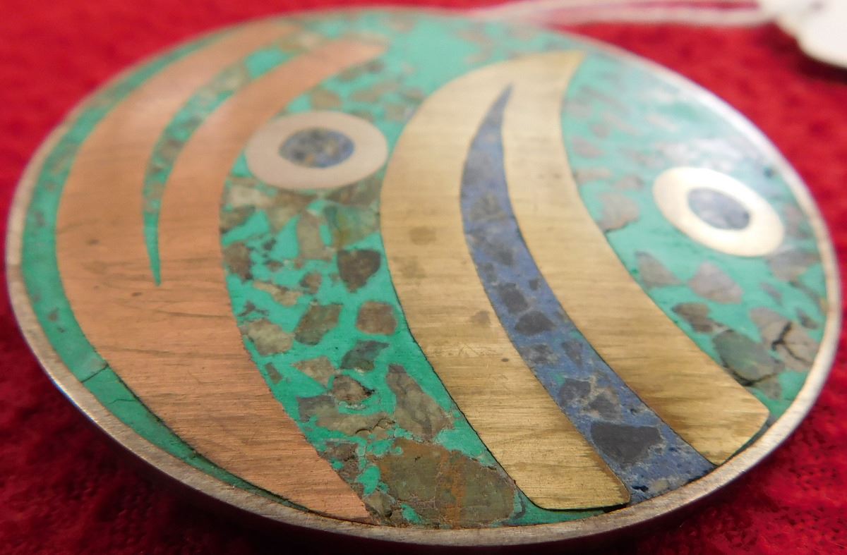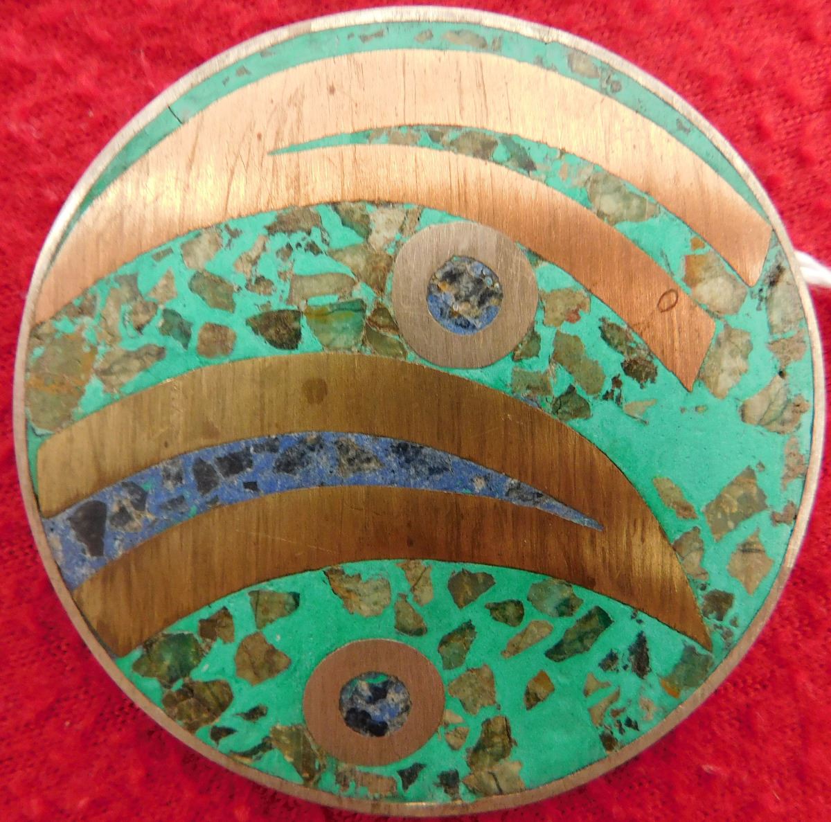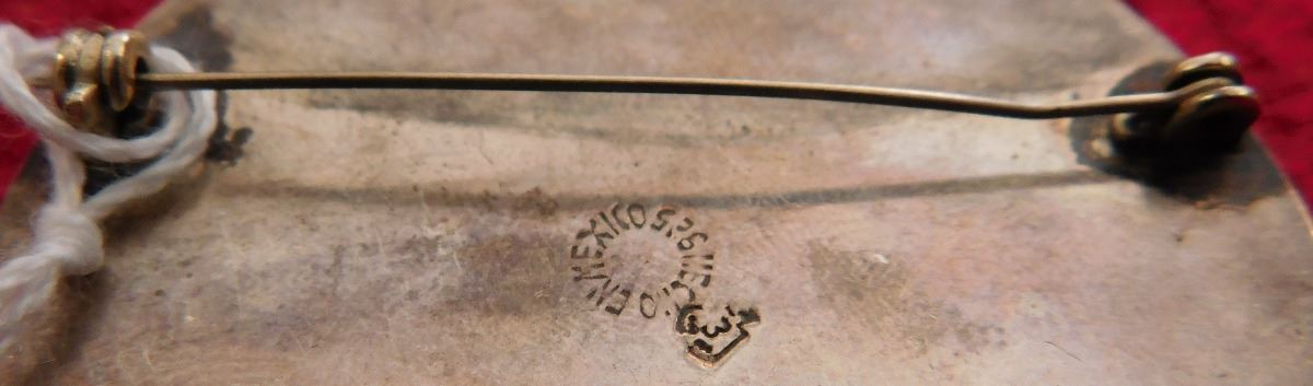 Antique Mexican Pin, circa 1940s. Made of sterling silver, copper, brass and stone, the item measures 2" x 2". Taxco, Mexico. Appears to have 2 eyes and 2 beaks on this modernist pin. Weighs approx. 22.9 grams. Condition: Minor scuffs, well-worn, see images. Shipping: $14.50 w/insurance and signature.