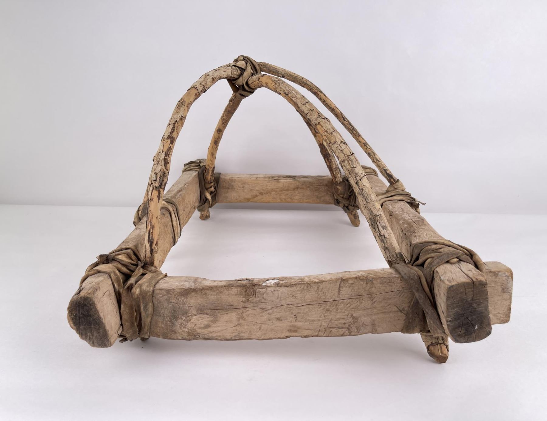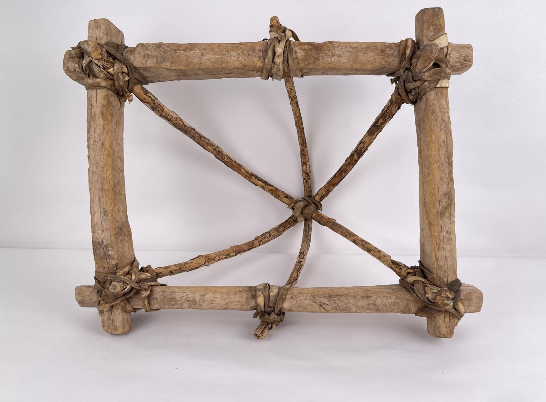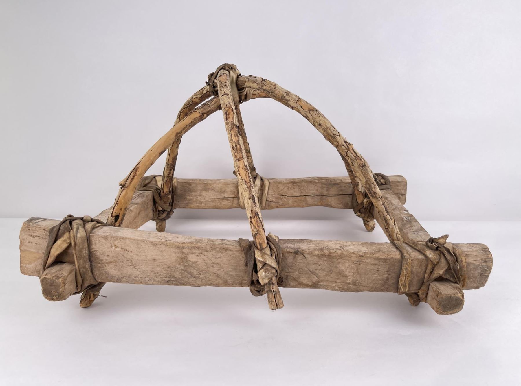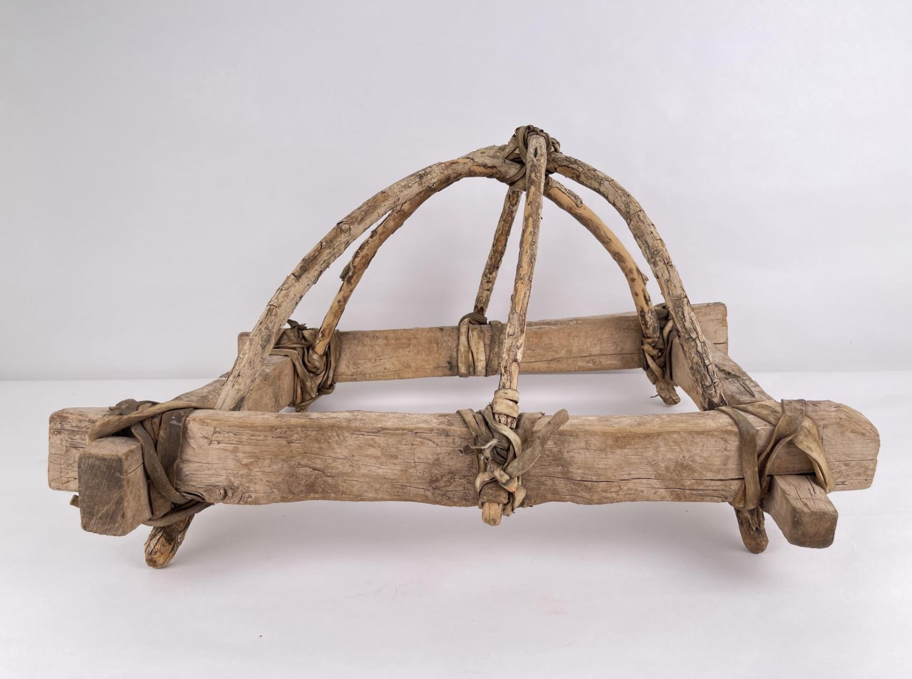 Antique Mesquite wood pack frame with tied rawhide. These were fastened to the side of a donkey to haul water olla. From Mexico. 26 1/2" by 20 1/8" by 14 1/4". Allard Auction Collection Inv: NO TAG