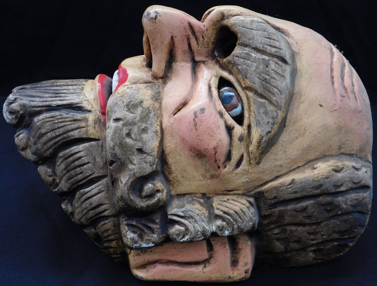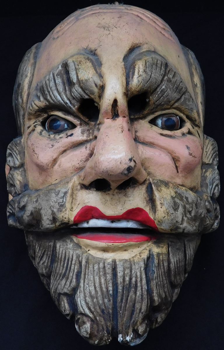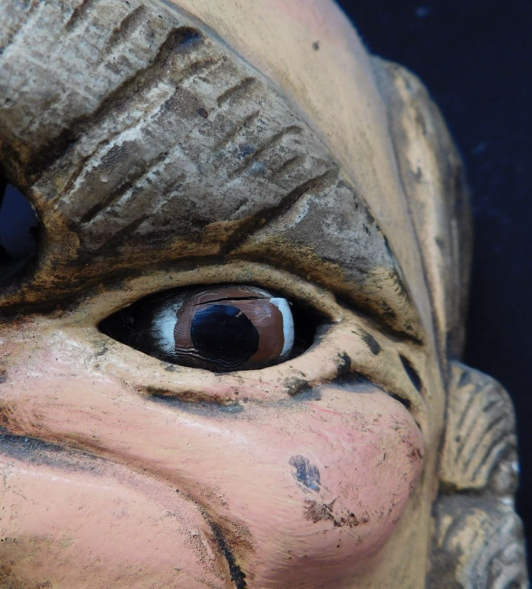 Antique Mexican Santo Mask, circa 1930s. Made of wood, paint. Item measures 7.5" x 10" x 7". Mexican, from Mexico City, MX. The figure depicted could be a Spaniard. Condition: One eyeball cracked, mask needs cleaning, see images. Shipping: $18.00.