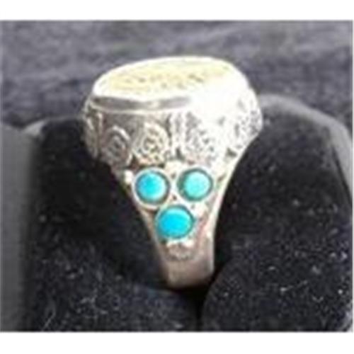 This is a very unique early Middle Eastern Ring, most likely a Men's Ring, hand crafted Sterling Silver with a thick 18kt Gold in scripted with possibly Arabic. On each side or three genuine Turquoise Stones. You can be sure that no one will have one like this. Estimated size is 6 and pleases contact a jeweler regarding resizing. Ring measures approximately 1" X 1"