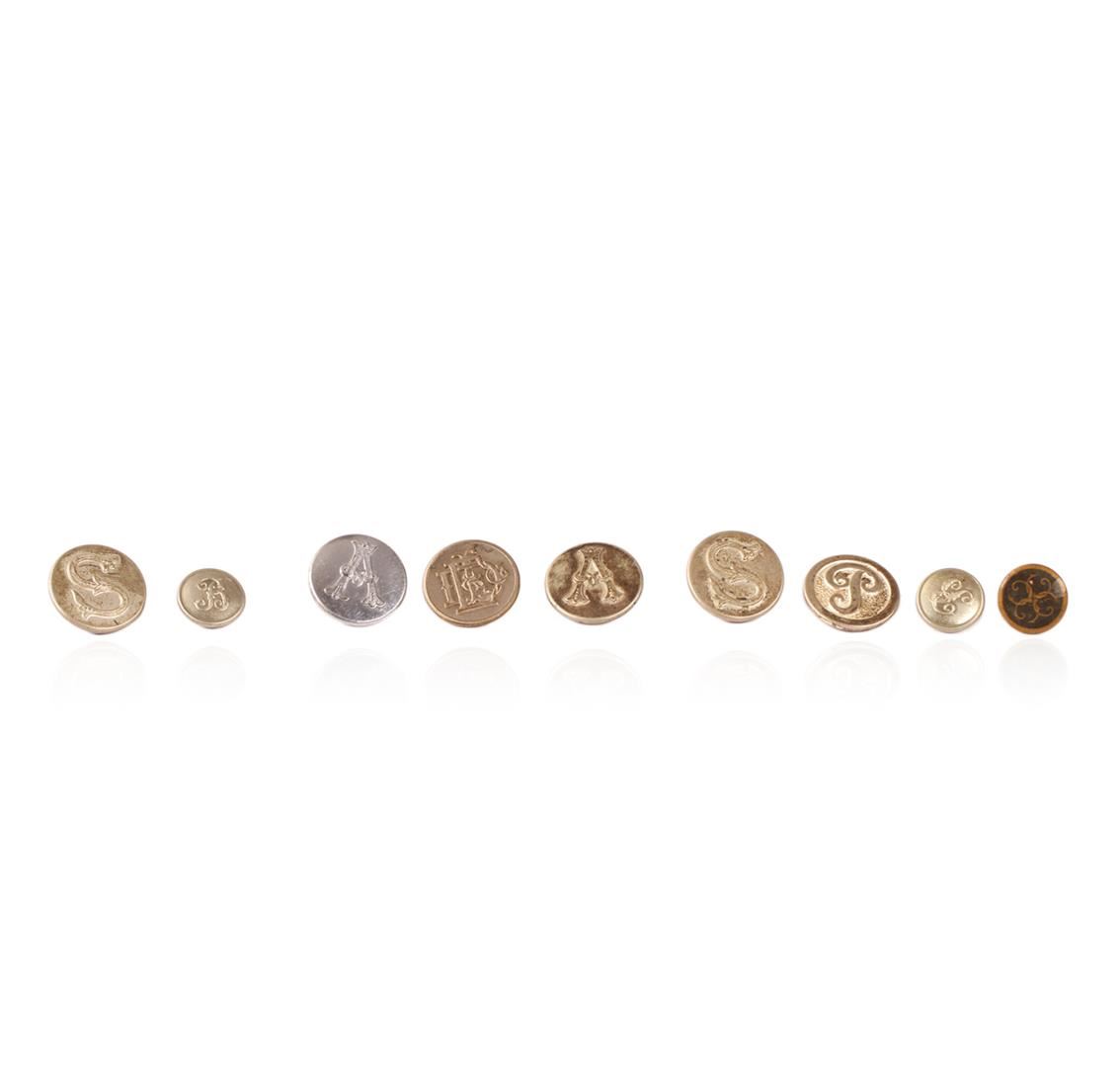 A lot of 20 antique military buttons featuring: 1 Infantry Officer button c. 1870's-90's Evans & Hassall Philadelphia. 6 Navy buttons gold wash one is 2 part construction. 1 black plastic Navy 4 hole sew button upright foul anchor. 1 State of New York Scovill Waterbury "Excelsior" button. 2 "B" buttons made in England 2 part construction. 2 "A" buttons superior quality made in England. 2 "s" buttons superior quality made in England. 1 EDI & Co button superior quality. 1 "P" button superior quality. 1 vintage pin Chicago Continental Casualty Company CCCC button stud. 1 Army General Service WW1 copper Great Seal Scoville Waterbury. 1 US Navy Civil War 1830-1852 cuff button 13 stars.