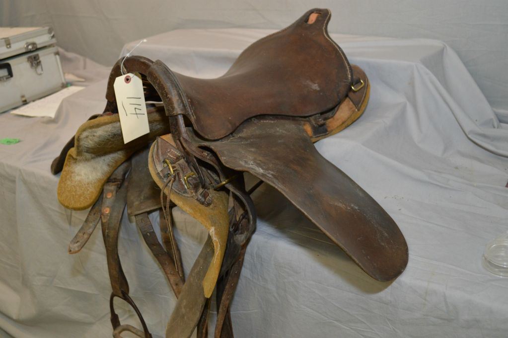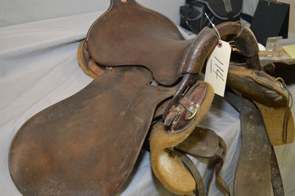 Antique Military Saddle ( stamped CLH ) possible Calgary Light Horse ?, c/w wooden stand