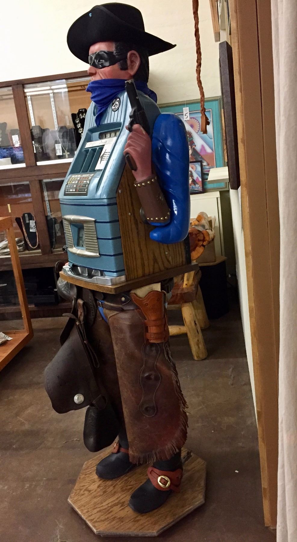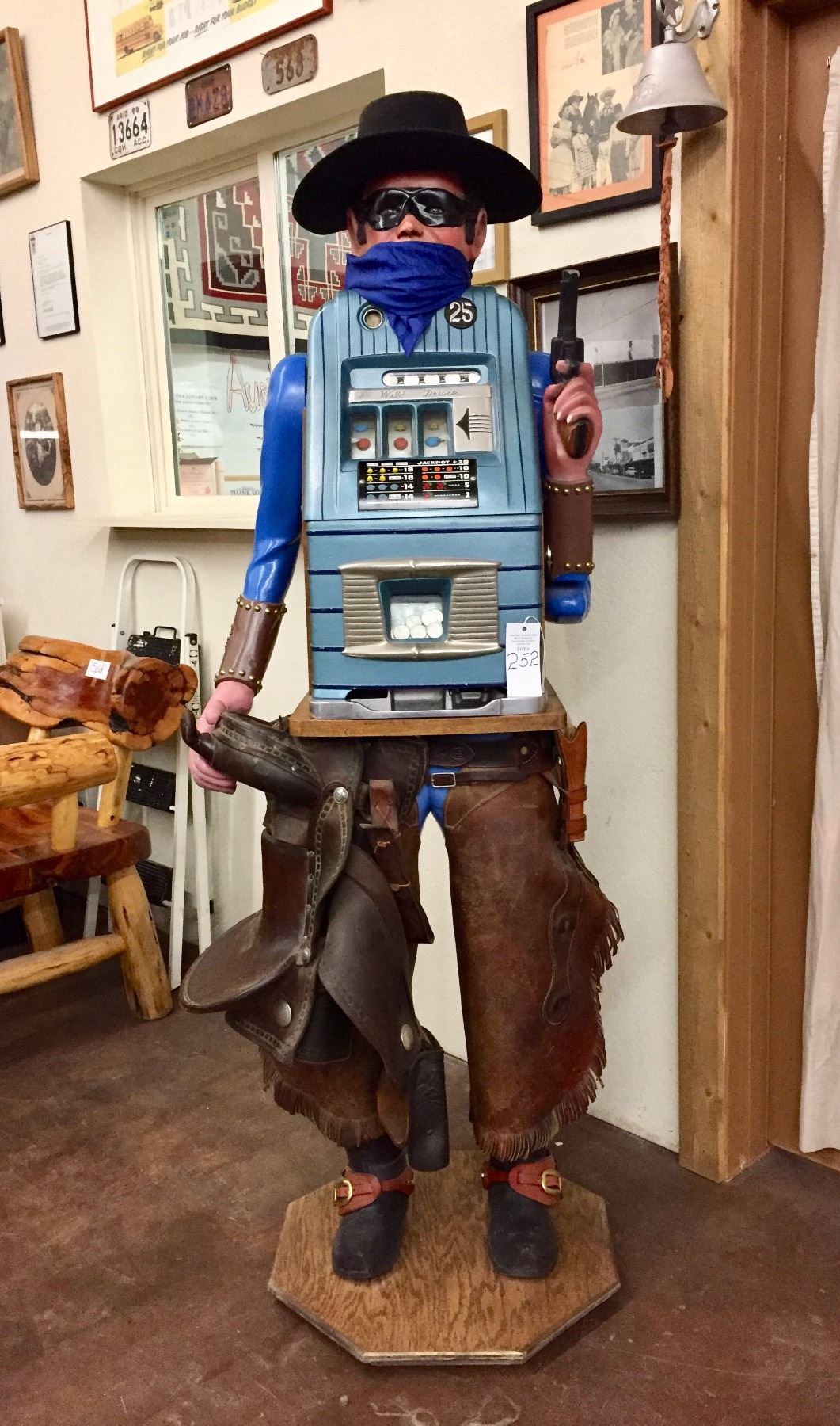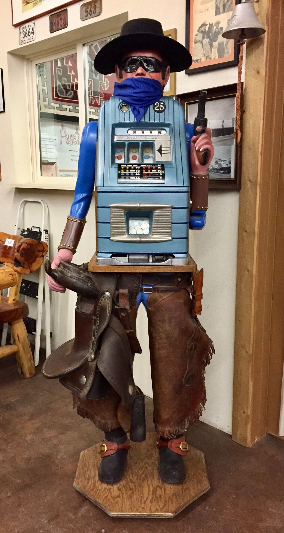 Description: An incredible hand-carved, life-sized bandit, .25 cent slot machine!! With chaps, a hat, spurs, saddle and gun. He stands on a wooden base. Maker: Carved by Richard DeLong. Approx. Age: Circa 1940’s. Size: Stands SIX FEET tall x 24 1/2” w. Condition: Good for its age, normal wear expected. Please look closely at the pictures - they are an important part of our description. Shipping: LOCAL PICKUP ONLY. NO SHIPPING AVAILABLE.