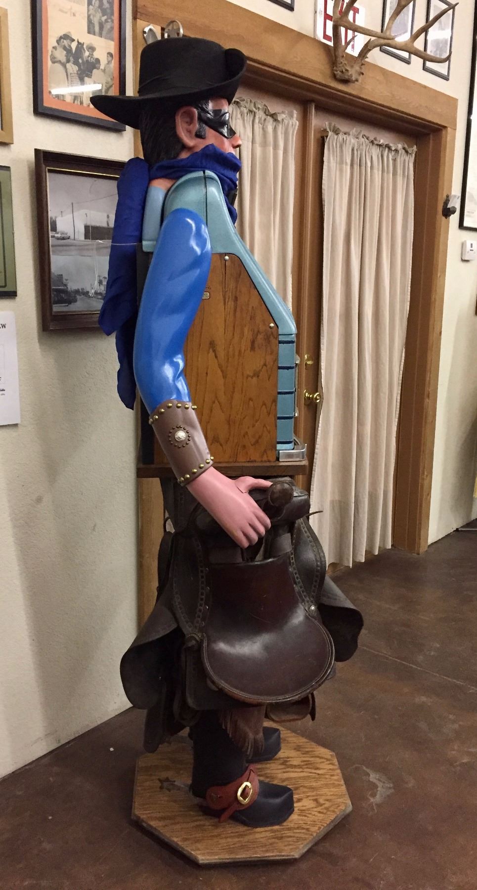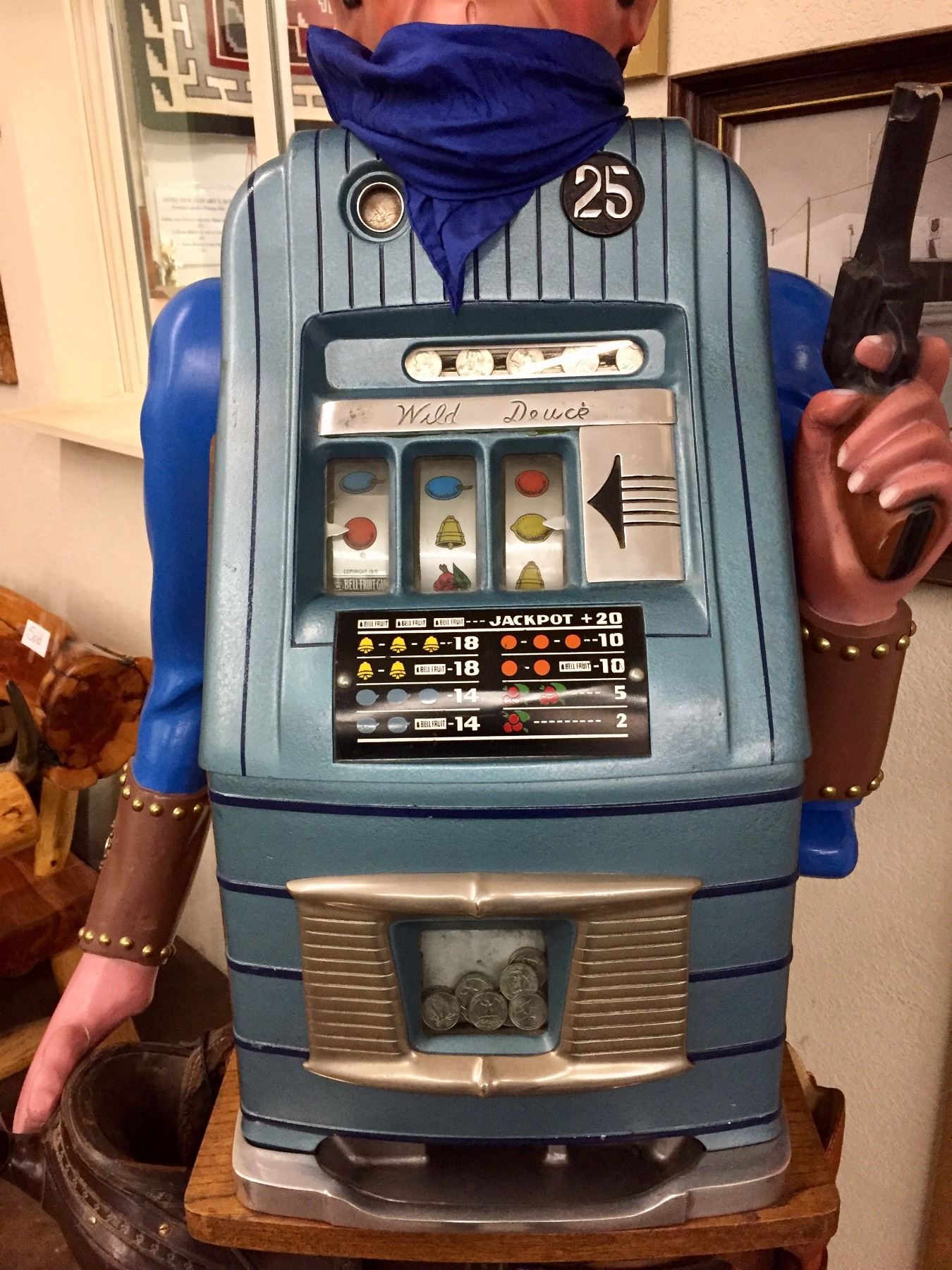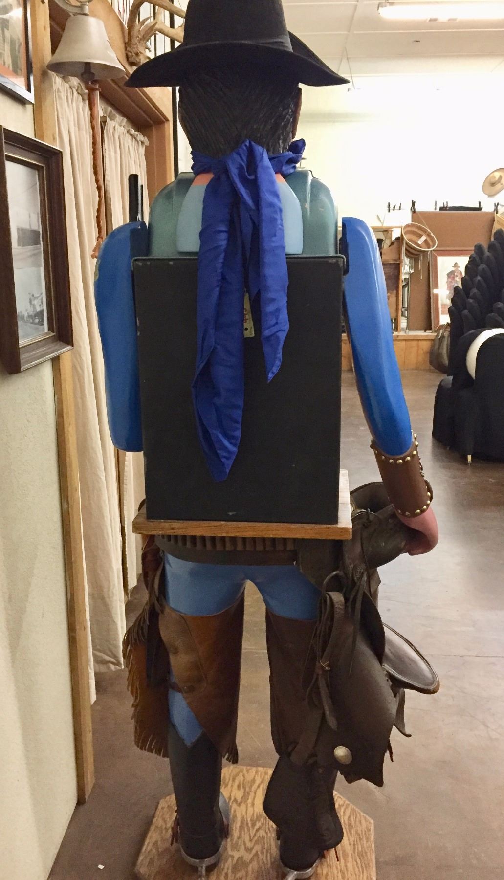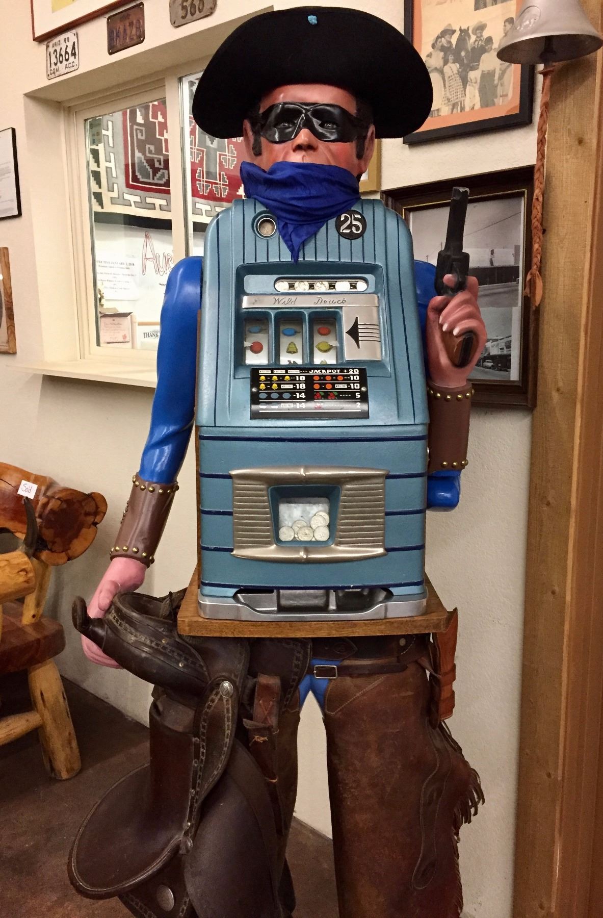 Description: An incredible hand-carved, life-sized bandit, .25 cent slot machine!! With chaps, a hat, spurs, saddle and gun. He stands on a wooden base. Maker: Carved by Richard DeLong. Approx. Age: Circa 1940’s. Size: Stands SIX FEET tall x 24 1/2” w. Condition: Good for its age, normal wear expected. Please look closely at the pictures - they are an important part of our description. Shipping: LOCAL PICKUP ONLY. NO SHIPPING AVAILABLE.