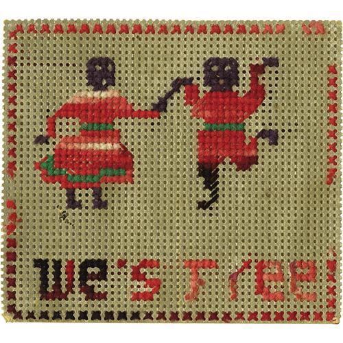 <B>Antique Mini-Sampler "We's Free"</B></I> Can you imagine the joy felt by a slave who is told that they are now free -- no longer "owned" by another person. What a celebration must have occurred. Here is a small (approximately 4.25" x 4") sampler done mostly in bright red colors. It shows an African-American man and woman dancing above the words "We's Free." What a great piece of Black Americana as well as true folk art. Excellent quality, worthy of the finest collections.<BR><BR><b>Shipping:</b> Miscellaneous Collectibles, Smal (<a target="_blank" href="http://www.heritageauctions.com/common/shipping.php">view shipping information</a>)