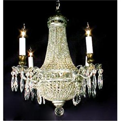 Probably the world?s smallest chandelier! This little crystal chandelier with its four branches and gracefully draping crystal beads is absolutely elegant. The frame is silver on bronze or silver on some other type of metal. It has the top and central band set with squares of cut crystals. They are set almost like jewelry. This little tiny chandelier ? is classical in every respect. I suspect that it dates from the early 1900?s. It is just so precious and magnificent. It is wired and is ready to install. It measures 19? high with a 19? diameter. It is finished with a cut crystal ball. You can use any size chain you wish making it any length.