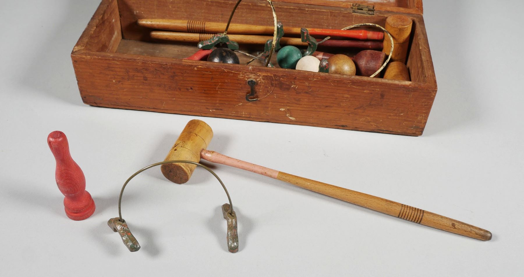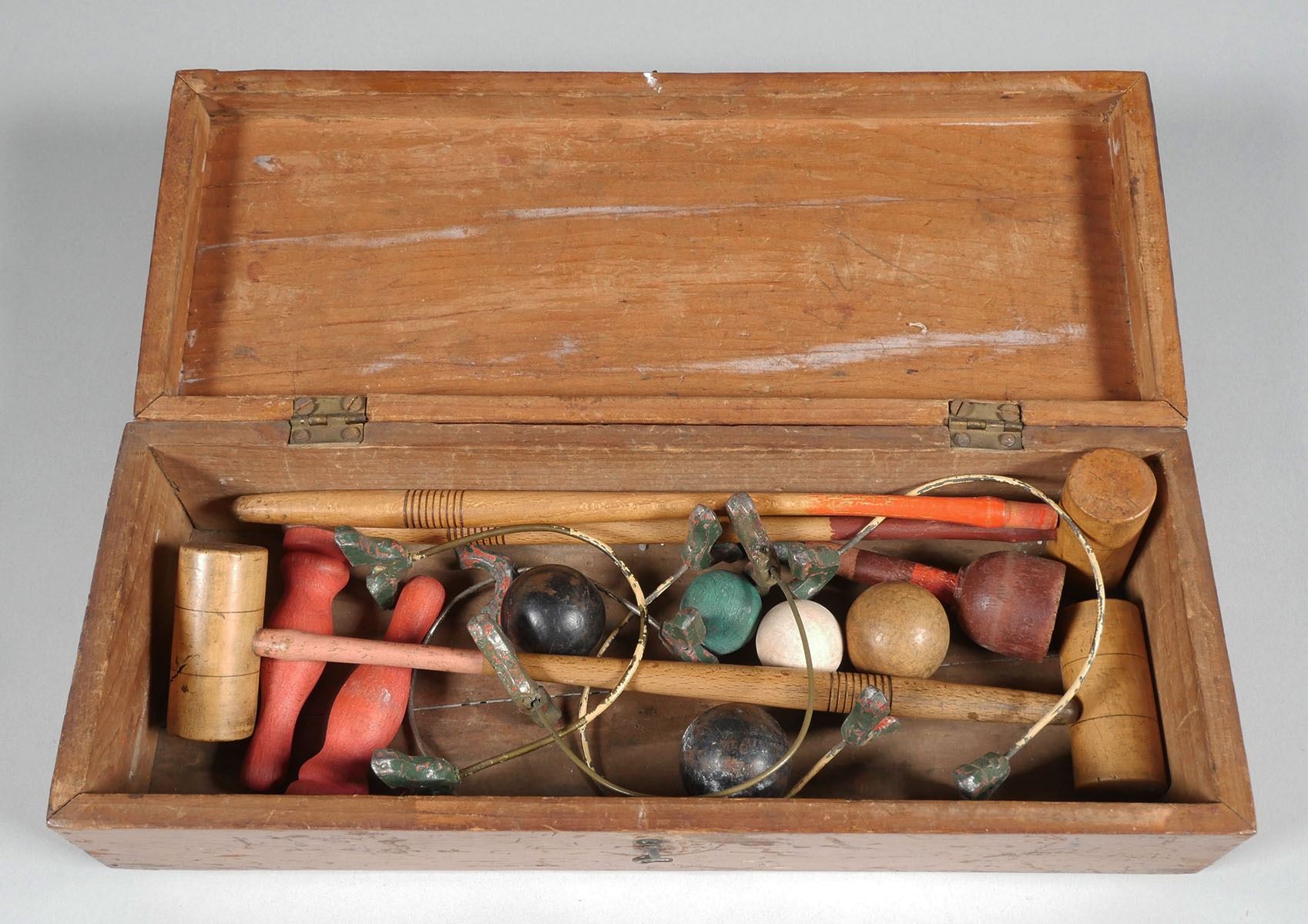 Early 20th century or late 19th century miniature croquet set. Box measures 11-3/4" wide. See images for detail.