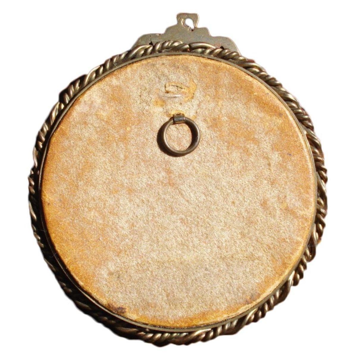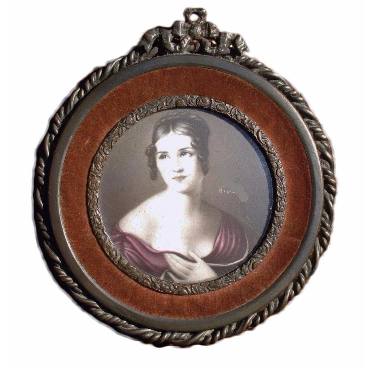 Antique miniature portrait of a lady presented in a bronze metal & velvet picture frame with curved glass & attached ring on the back for hanging. 11"D.