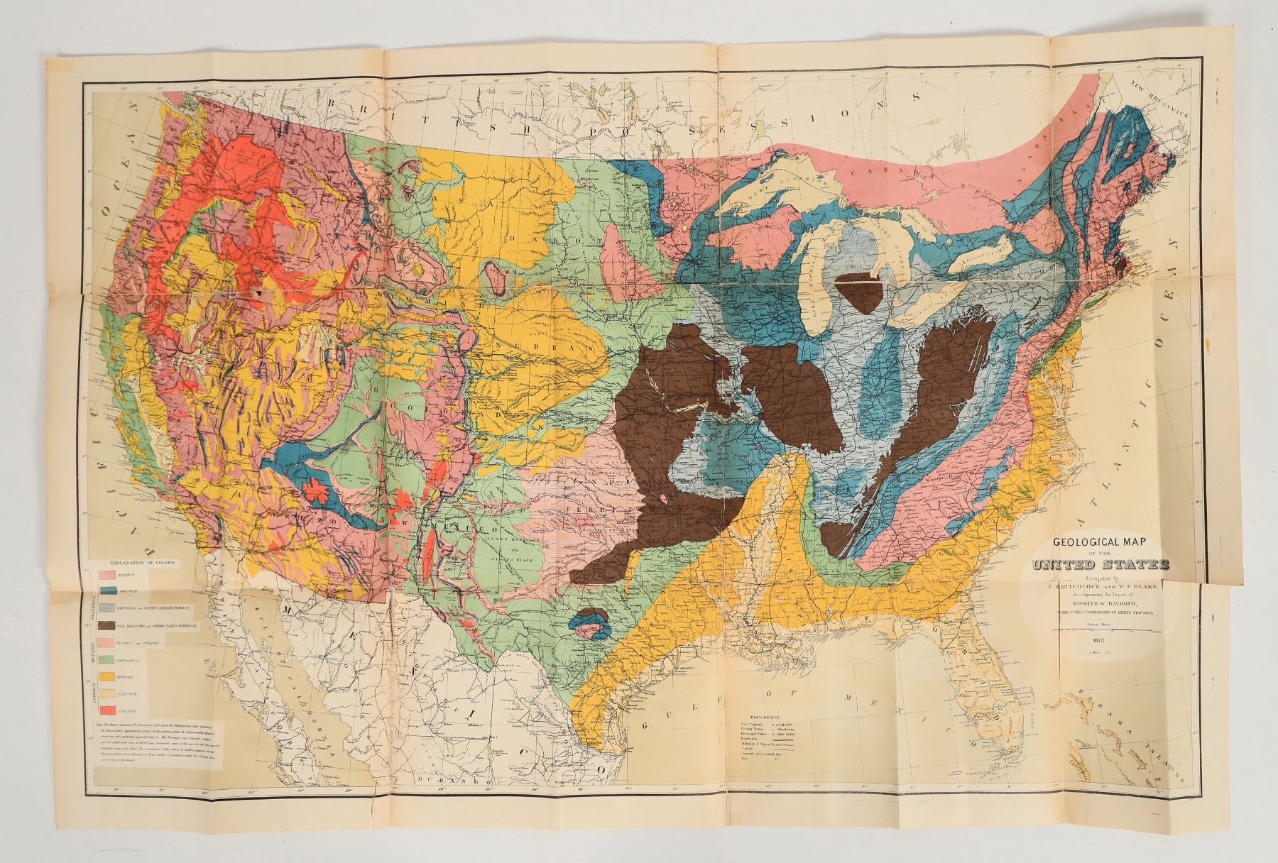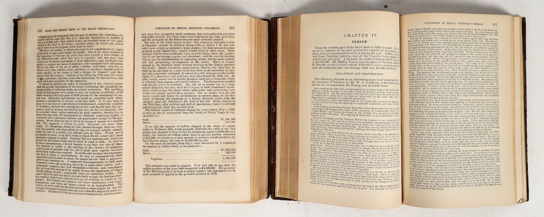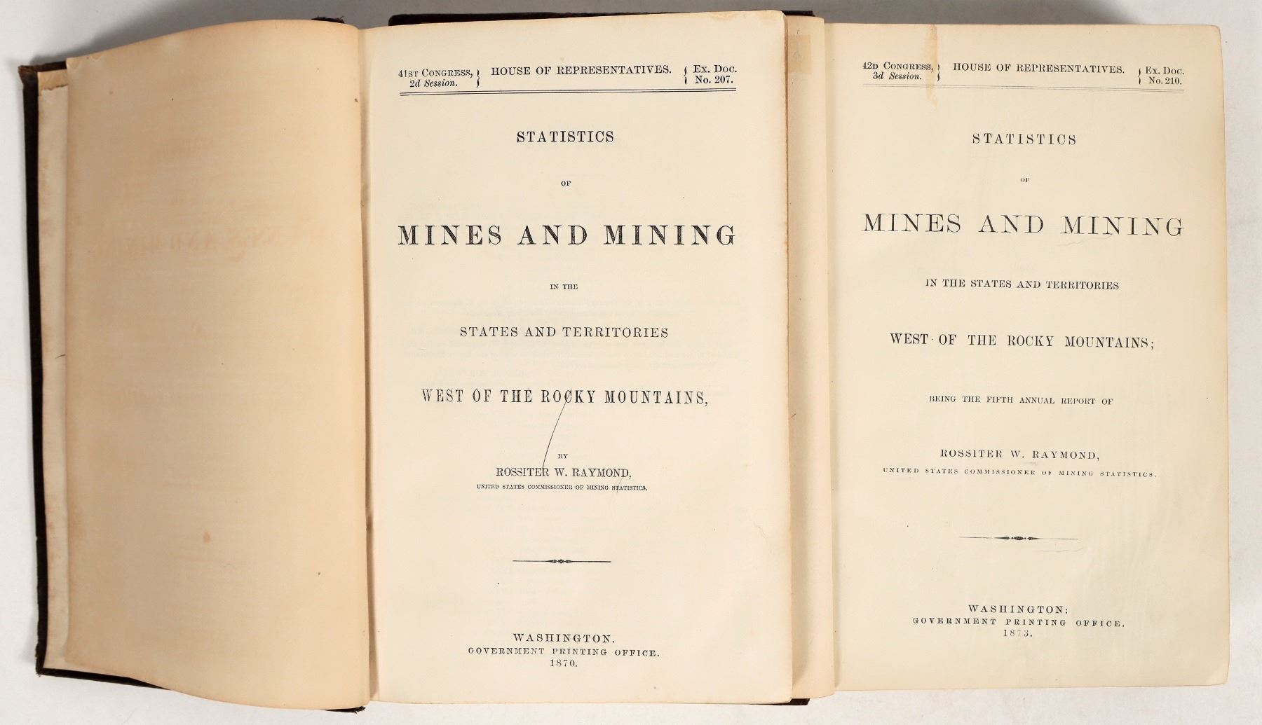 Pair of Mining reference books, both aligned to minerals and mining west of the Rockies. Book one is titled "Mineral Resources West of the Rocky Mountains," published in 1873 by Rossiter W. Raymond, via the Washington: Government Printing Office. Subtitled as the Fifth Annual Report of Statistics of Mines and Mining in the States and Territories west of the Rocky Mountains. Clocking in at 485 pages, there are multiple tables, fold-out maps, and an accessory full-size Geo map of the US (map exhibits tape repairs). Book two is titled "Mining Statistics West of the Rocky Mountains 1870," by Raymond also. This is a larger tome, at 800 pages, by the same publisher. Book two exhibits some minor spine damage. Book one is in near excellent condition. Both books have solid pages retention, corners in good to very good shape. Incredible period references!