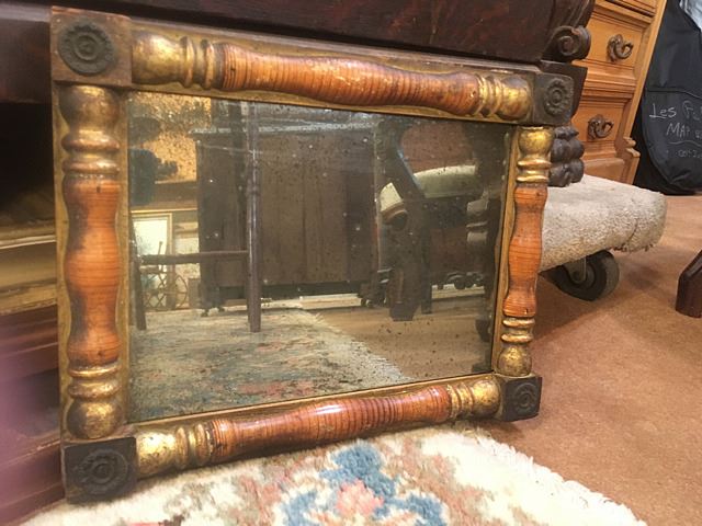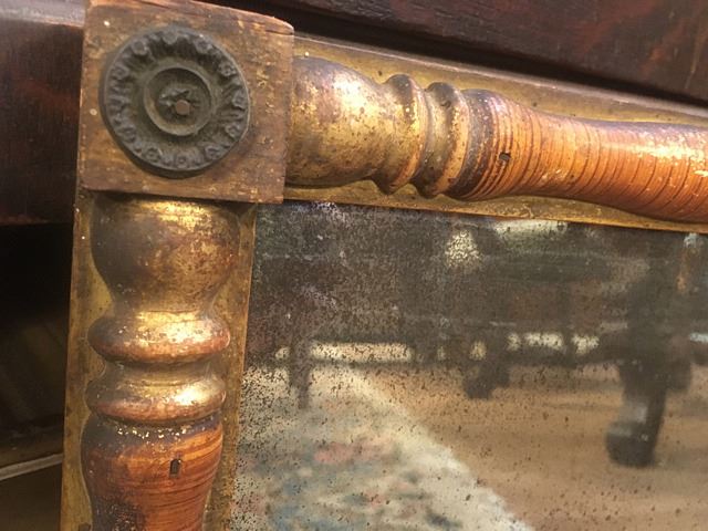 Antique mirror with gold gilt and wooden frame, corner medallions, measures approx. 12" wide