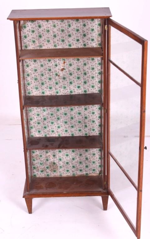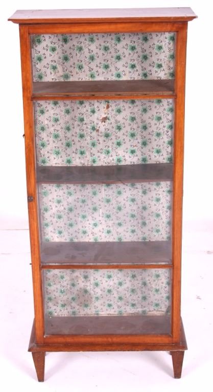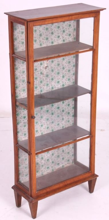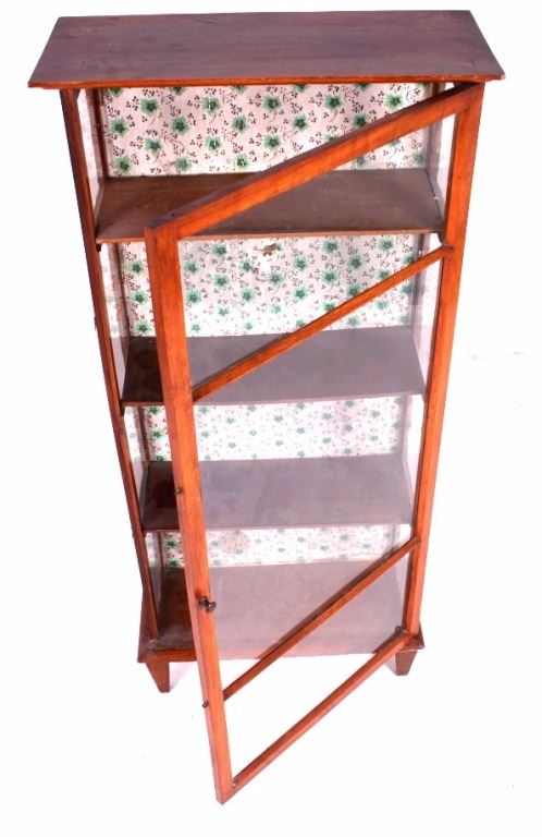 This is an antique mission style curio cabinet. This is a nice little display cabinet with four shelves. The case is compact in size and would fit into any room. The case measures 44 1/2"H x 19 3/4"W x 8 1/4" Deep.