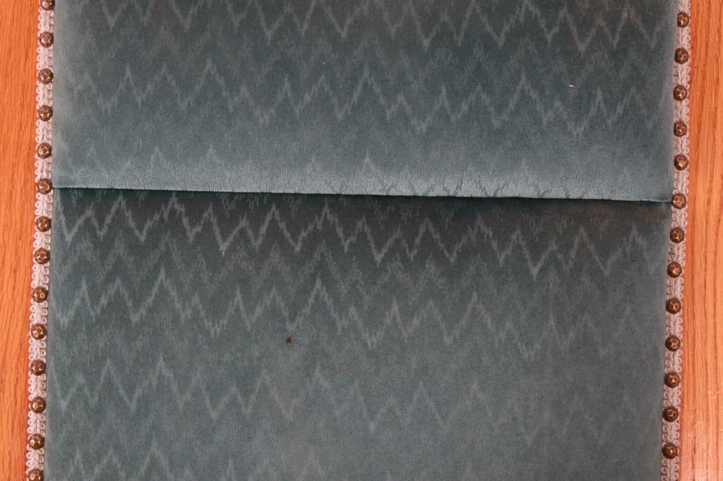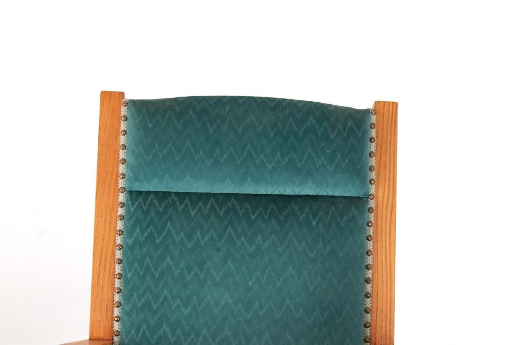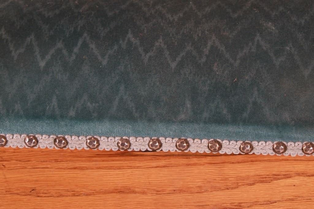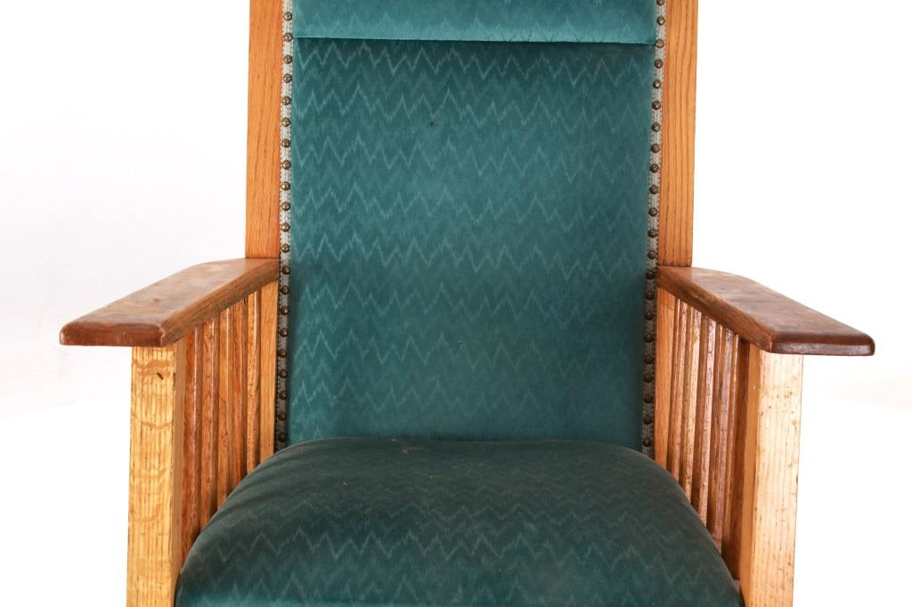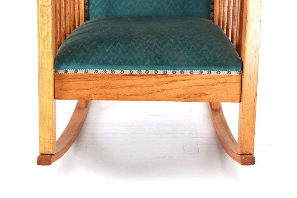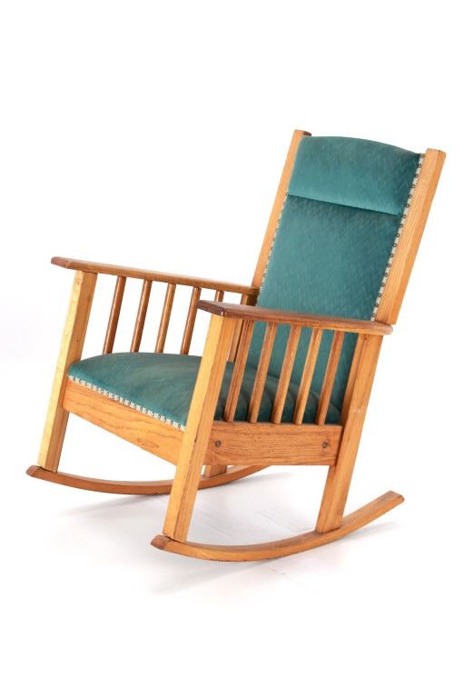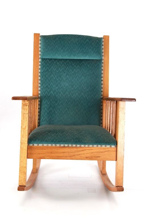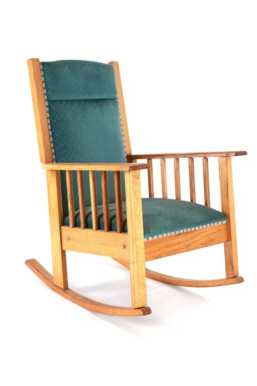 Featured in this lot is an antique oak blue upholstered rocking chair in a classic Mission pattern. The rocking chair features a wonderfully and professionally crafted oak frame with a blue upholstered chair back and seat. and rocks back and forth. The overall condition of this upholster rocking chair is good with no obvious signs of damage. It is capable of rocking back and forth as expected. The chair's measurements are 38 1/4" x 29" x 29". The collective weight of this upholstered rocking chair is ___.*