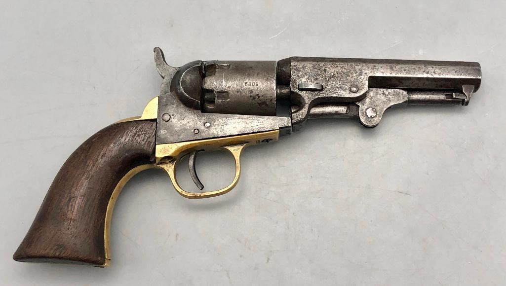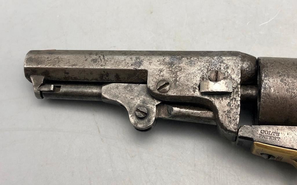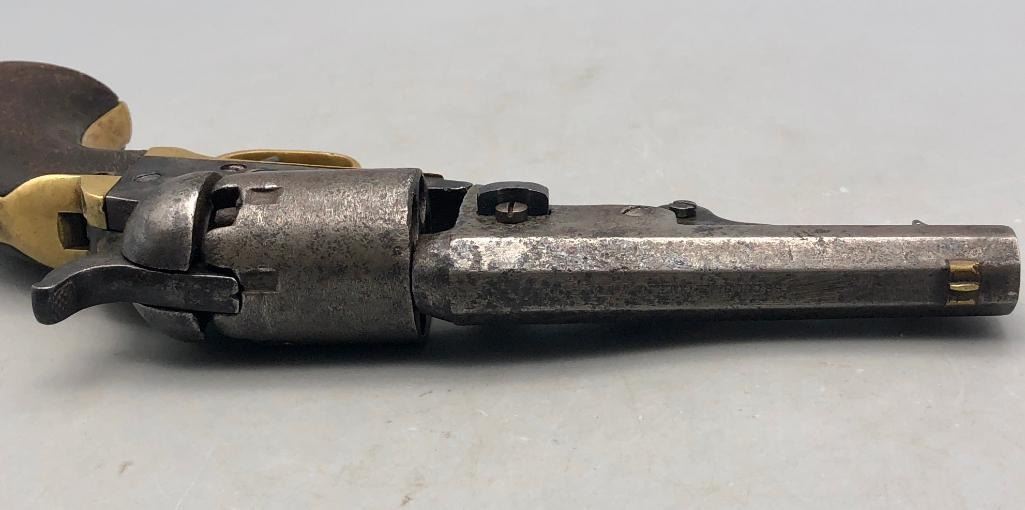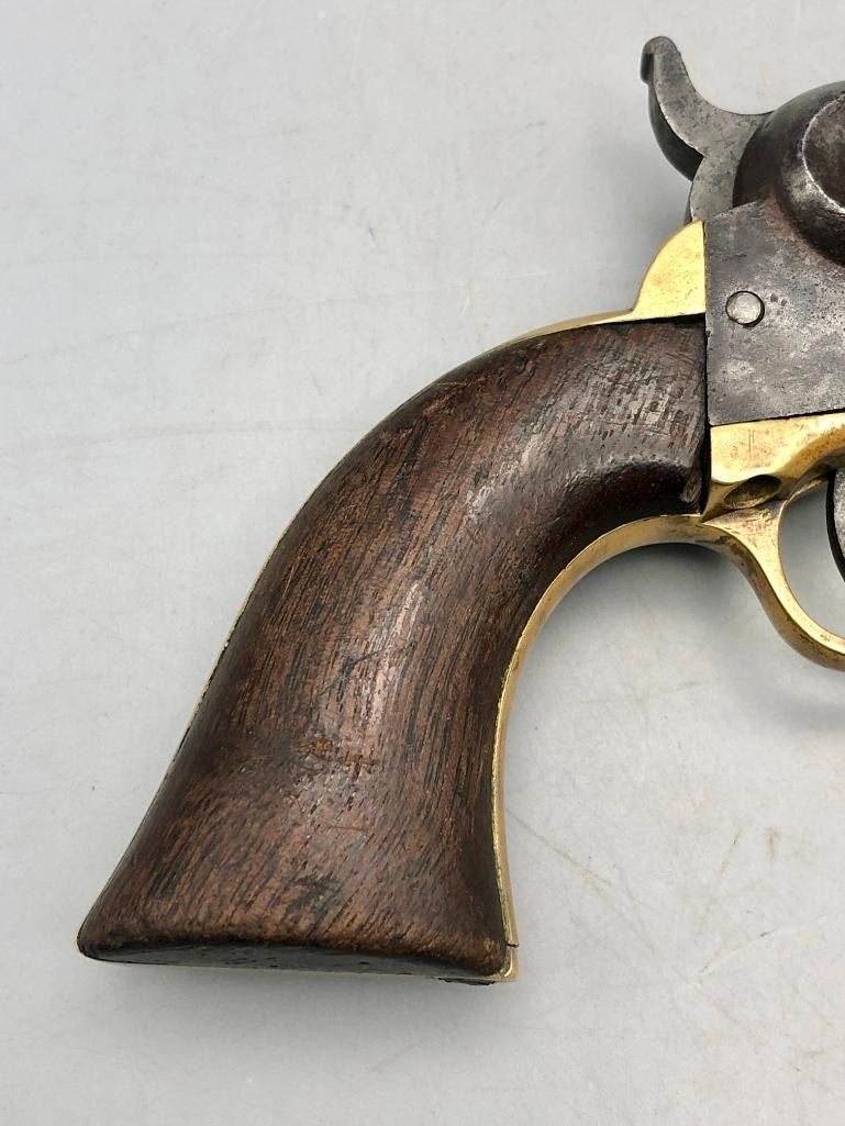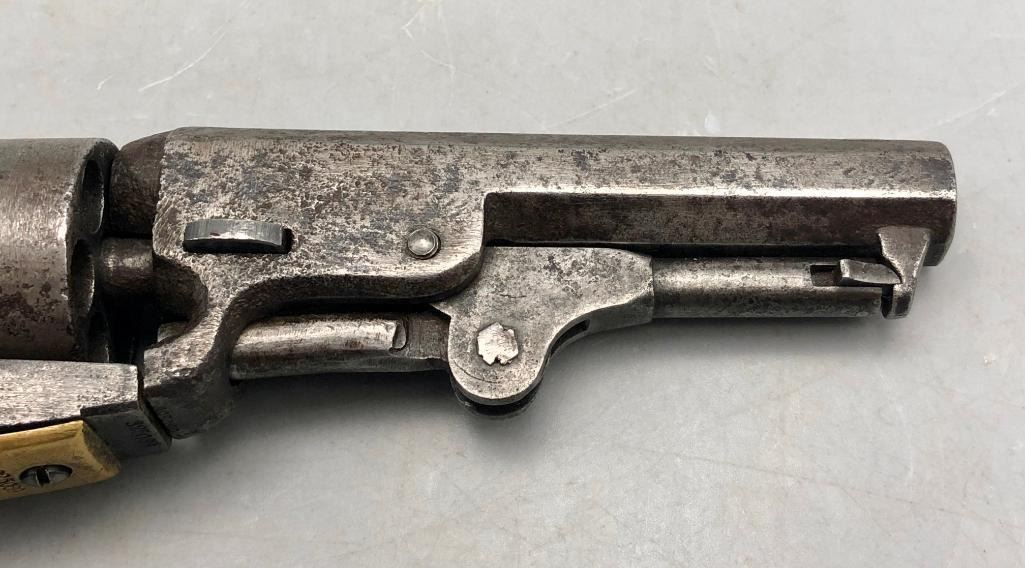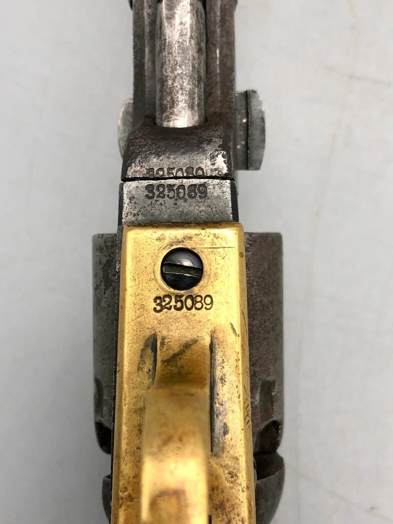 Up for consideration is this antique model 1849 Colt pocket pistol. This revolver is in decent condition, showing signs of wear from age and use. The finish is nearly gone, and shows pitting throughout. It has matching serial numbers and original wood grips. There is some wear to the wood grips. It has the one-line New York barrel address. It cycles properly, however we have not fired it. Keep in mind this is an antique and not warranted safe to shoot, and it should not be attempted without the aid of an expert. A perfect addition to any collection! Maker: Colt. Serial No. 325089. Approx. Age: 1871. Size: Barrel length is 4 inches. 31 Caliber Condition: Fair to poor for its age, wear expected. Please look closely at the pictures - they are an important part of our description. Shipping: There will be a $15 handling / packaging fee for shipping this lot. The actual cost of postage will be added on top of that. BUY IT NOW: If you would like to buy this item now without waiting for the auction to end (this option is only available up to 48 hours before the auction starts to close), the “Buy it Now” price is the high estimate of this lot. If you would like to end the auction early and pay the high estimate (plus applicable fees), please contact us by phone or email and reference this lot number. *****ANTIQUE - This firearm DOES NOT REQUIRE an FFL Transfer*****