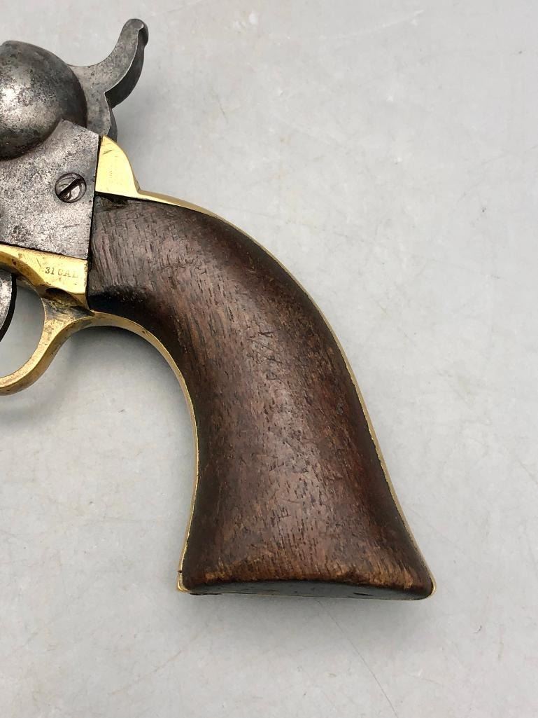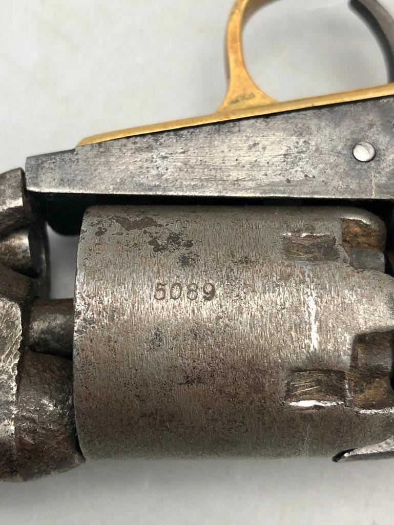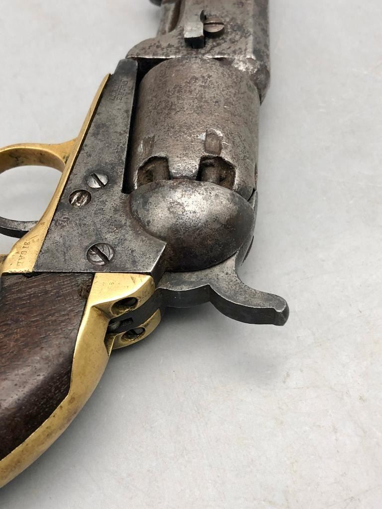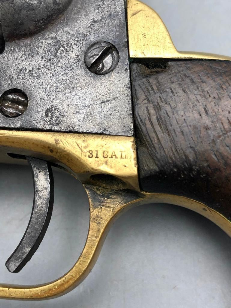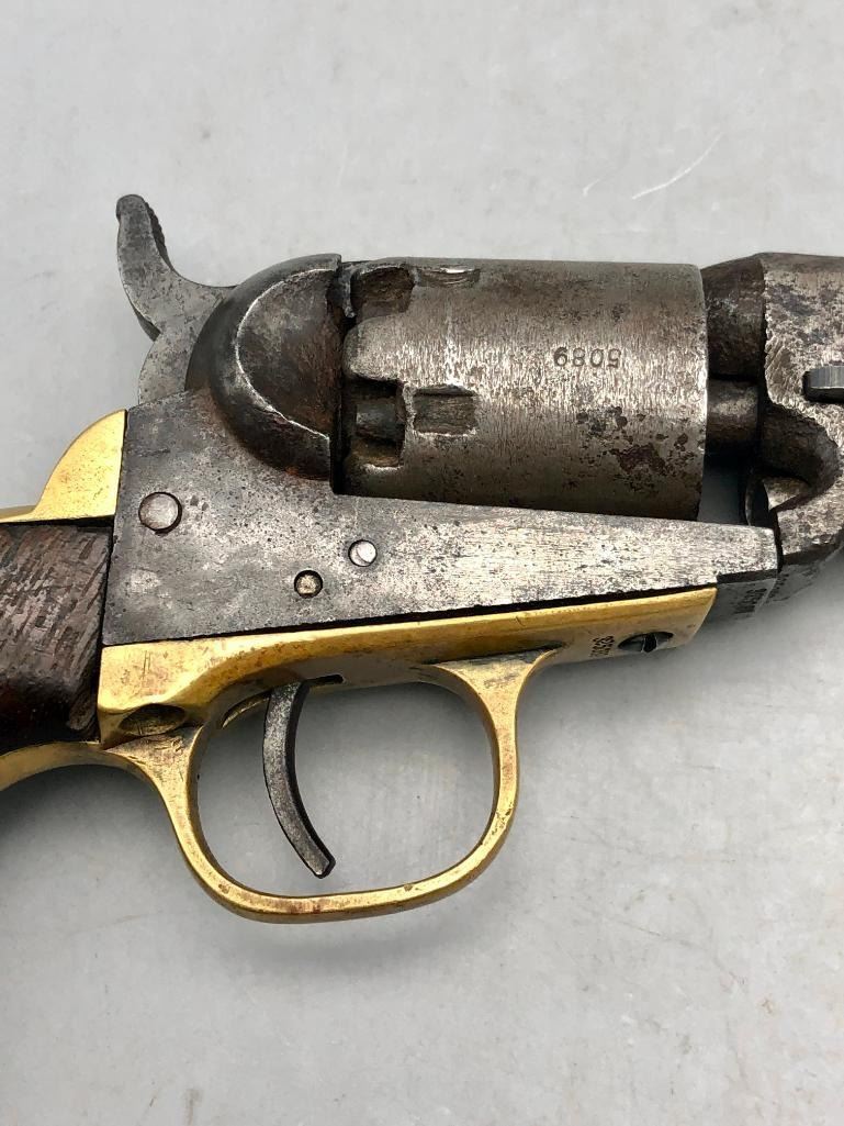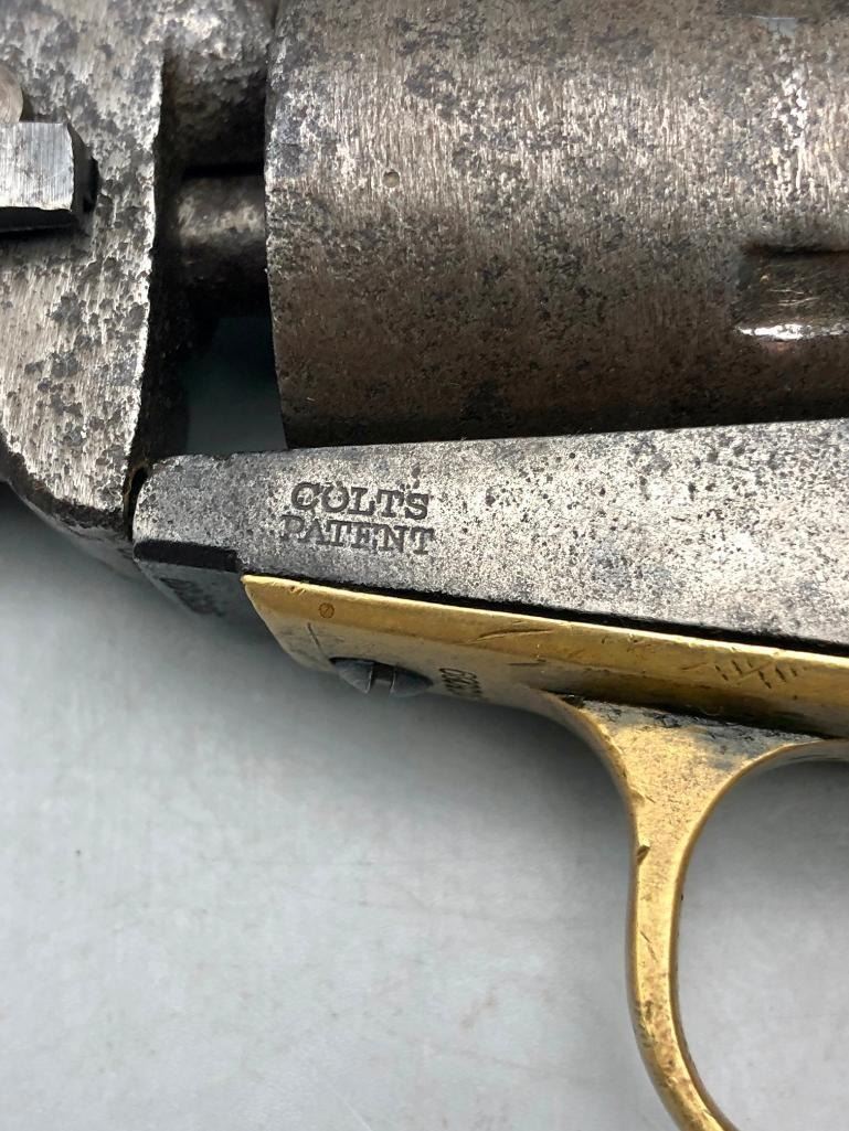 Up for consideration is this antique model 1849 Colt pocket pistol. This revolver is in decent condition, showing signs of wear from age and use. The finish is nearly gone, and shows pitting throughout. It has matching serial numbers and original wood grips. There is some wear to the wood grips. It has the one-line New York barrel address. It cycles properly, however we have not fired it. Keep in mind this is an antique and not warranted safe to shoot, and it should not be attempted without the aid of an expert. A perfect addition to any collection! Maker: Colt. Serial No. 325089. Approx. Age: 1871. Size: Barrel length is 4 inches. 31 Caliber Condition: Fair to poor for its age, wear expected. Please look closely at the pictures - they are an important part of our description. Shipping: There will be a $15 handling / packaging fee for shipping this lot. The actual cost of postage will be added on top of that. BUY IT NOW: If you would like to buy this item now without waiting for the auction to end (this option is only available up to 48 hours before the auction starts to close), the “Buy it Now” price is the high estimate of this lot. If you would like to end the auction early and pay the high estimate (plus applicable fees), please contact us by phone or email and reference this lot number. *****ANTIQUE - This firearm DOES NOT REQUIRE an FFL Transfer*****