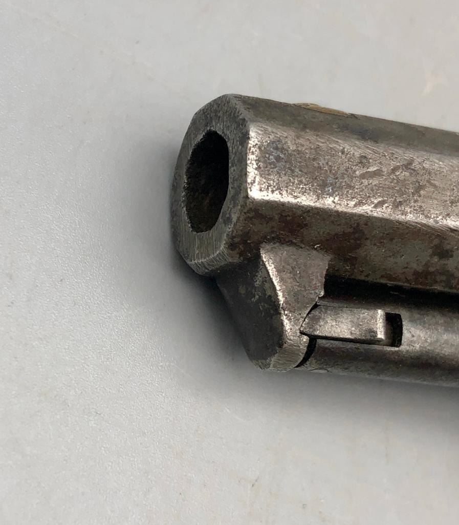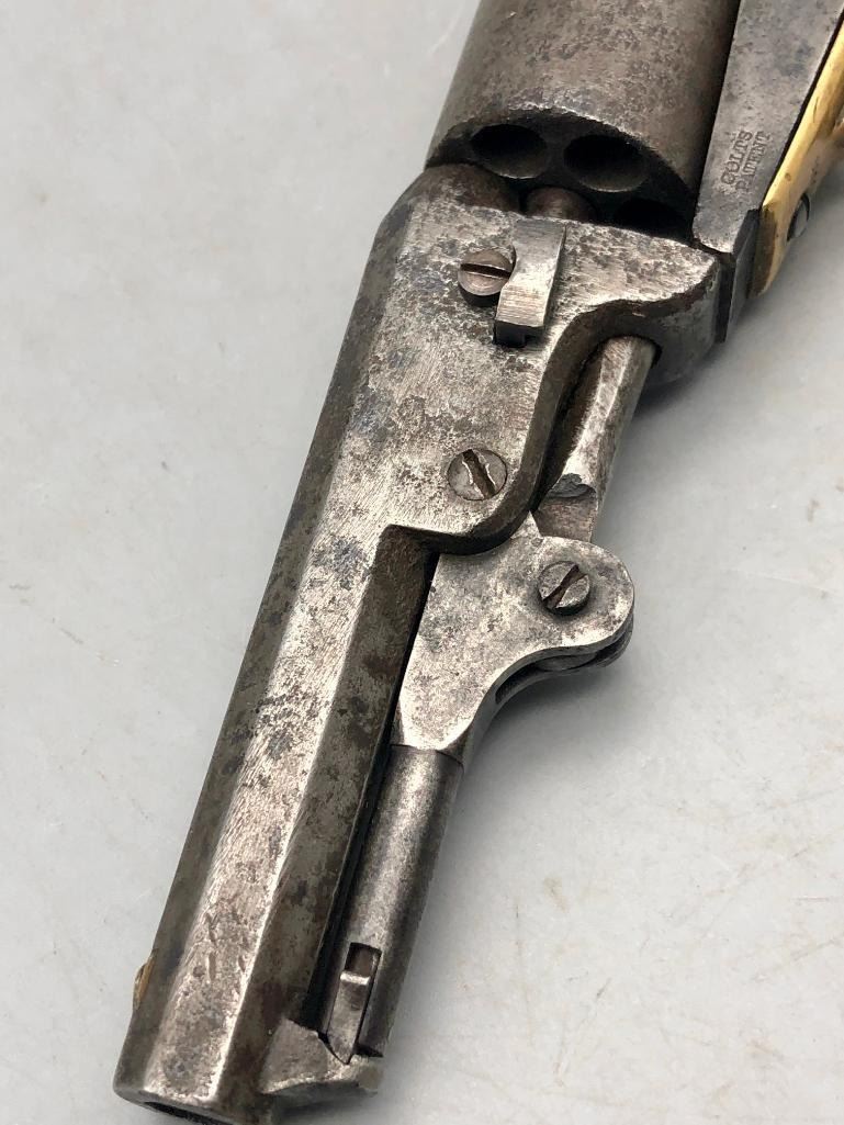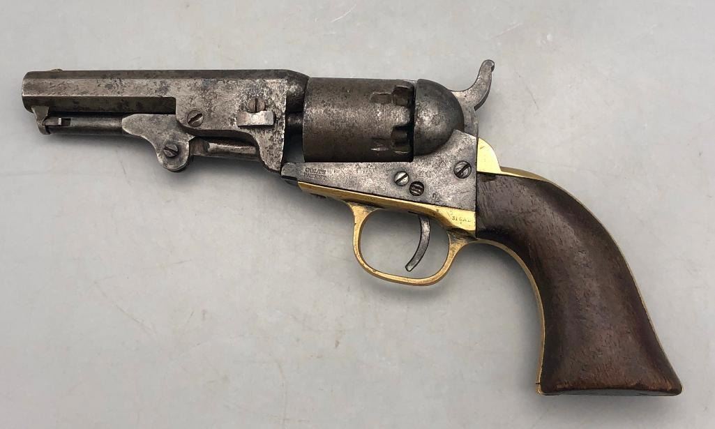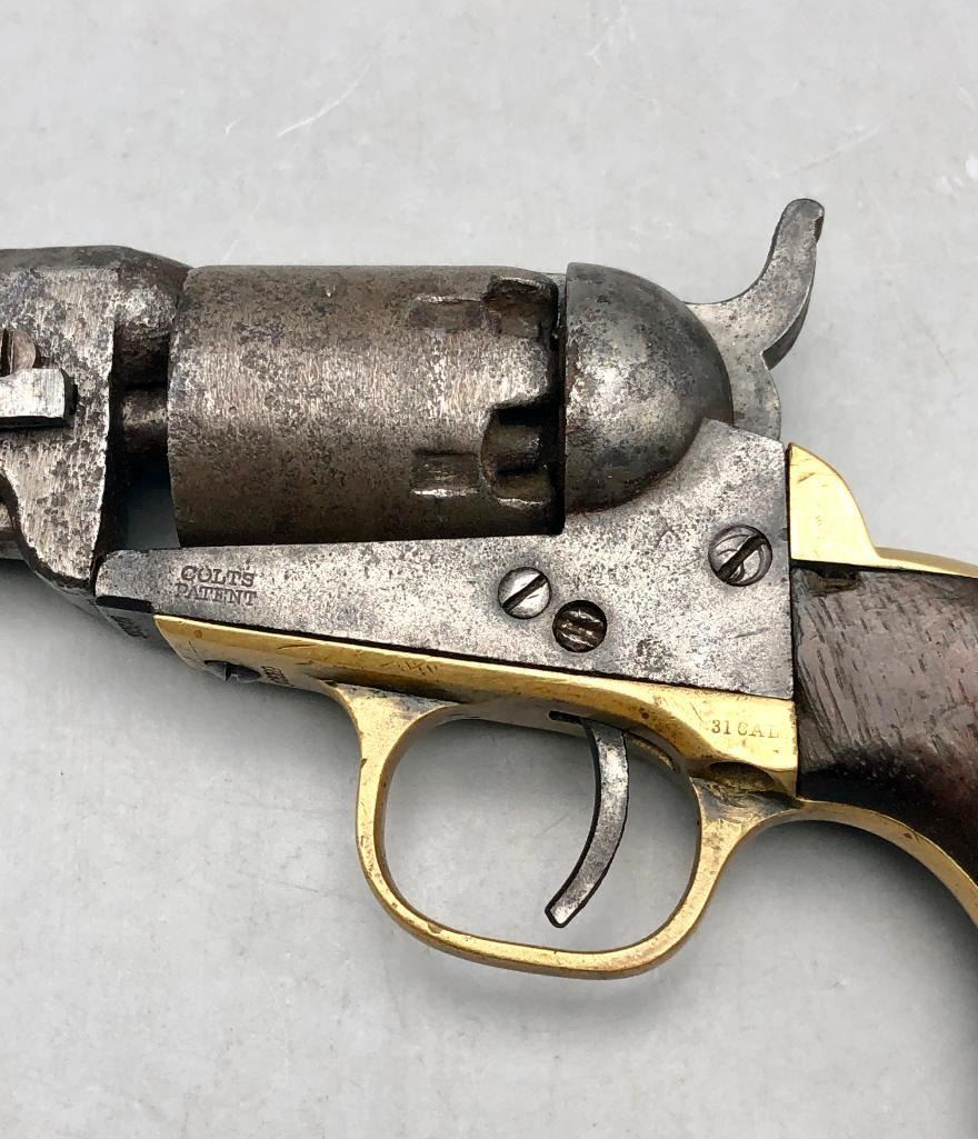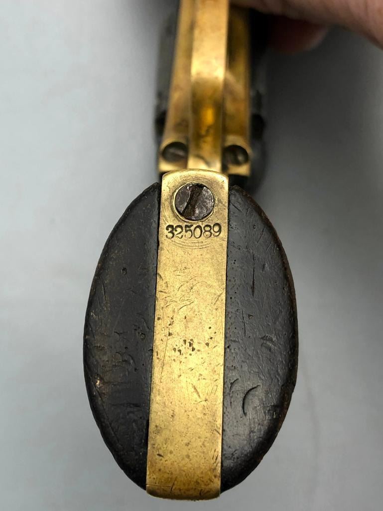 Up for consideration is this antique model 1849 Colt pocket pistol. This revolver is in decent condition, showing signs of wear from age and use. The finish is nearly gone, and shows pitting throughout. It has matching serial numbers and original wood grips. There is some wear to the wood grips. It has the one-line New York barrel address. It cycles properly, however we have not fired it. Keep in mind this is an antique and not warranted safe to shoot, and it should not be attempted without the aid of an expert. A perfect addition to any collection! Maker: Colt. Serial No. 325089. Approx. Age: 1871. Size: Barrel length is 4 inches. 31 Caliber Condition: Fair to poor for its age, wear expected. Please look closely at the pictures - they are an important part of our description. Shipping: There will be a $15 handling / packaging fee for shipping this lot. The actual cost of postage will be added on top of that. BUY IT NOW: If you would like to buy this item now without waiting for the auction to end (this option is only available up to 48 hours before the auction starts to close), the “Buy it Now” price is the high estimate of this lot. If you would like to end the auction early and pay the high estimate (plus applicable fees), please contact us by phone or email and reference this lot number. *****ANTIQUE - This firearm DOES NOT REQUIRE an FFL Transfer*****