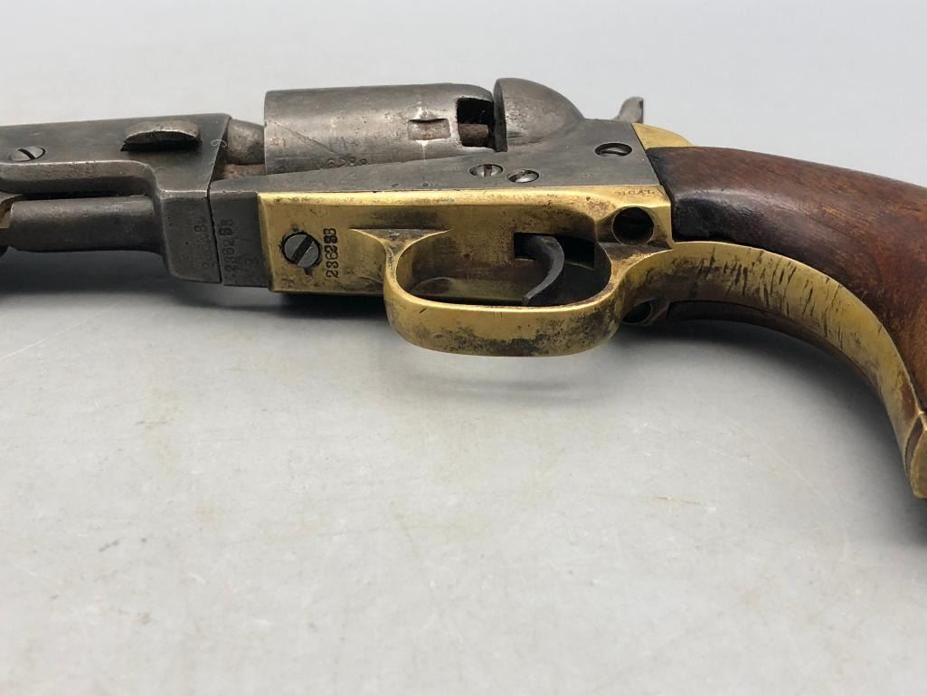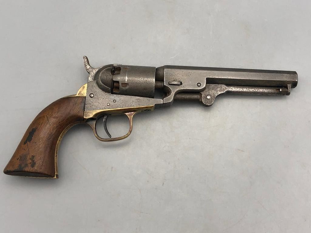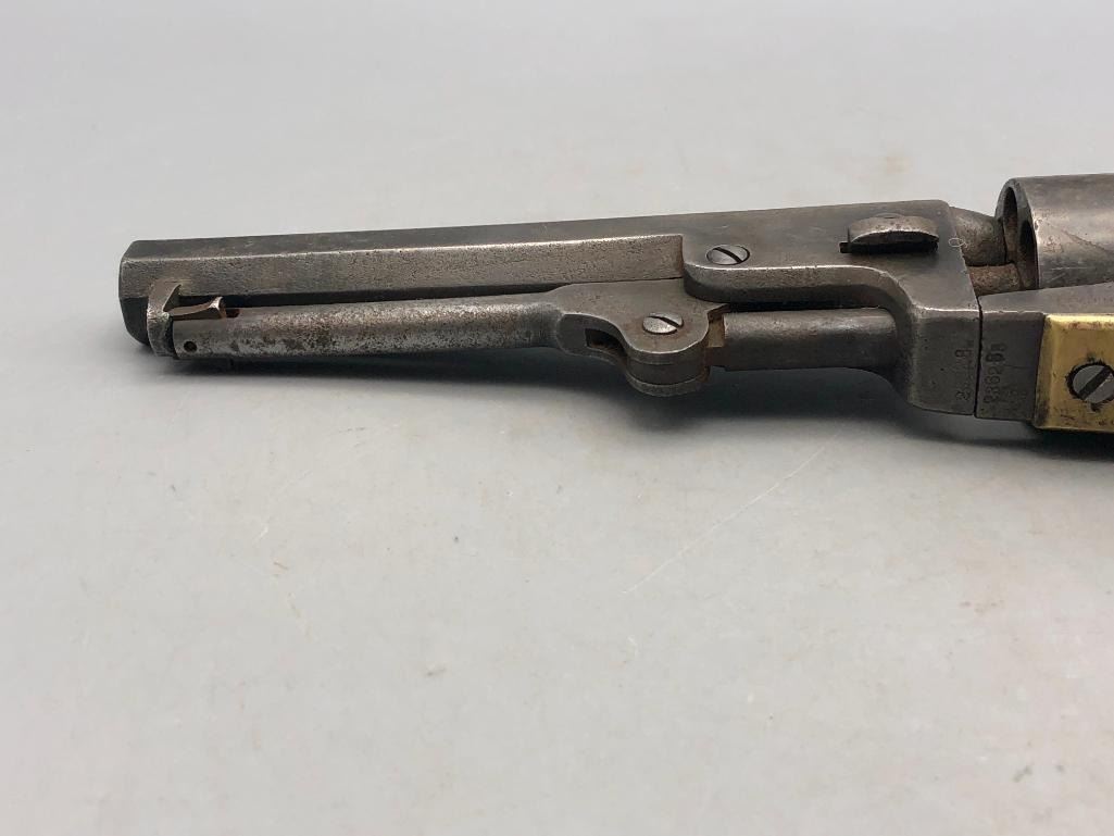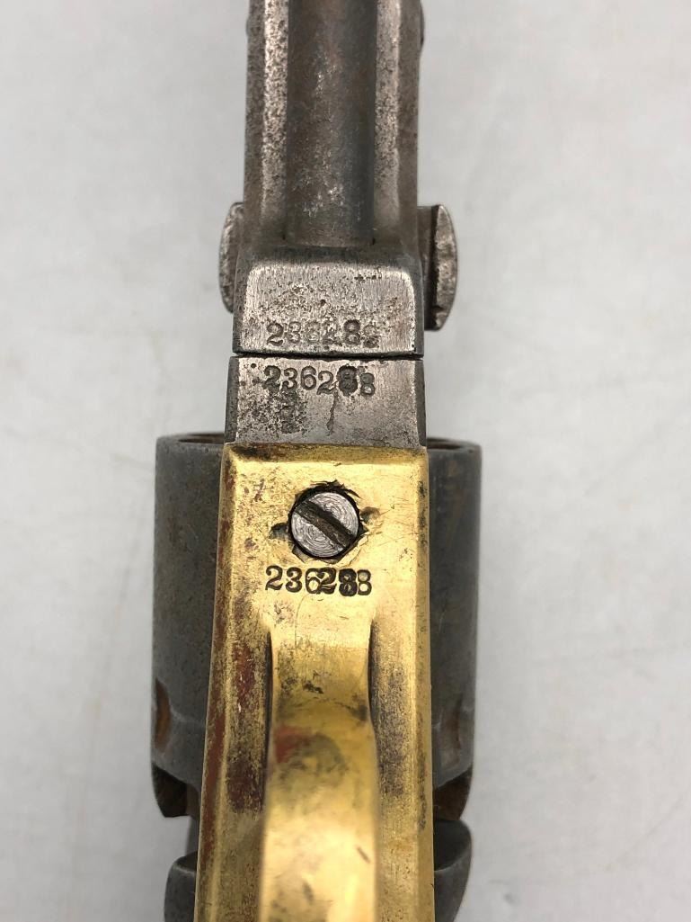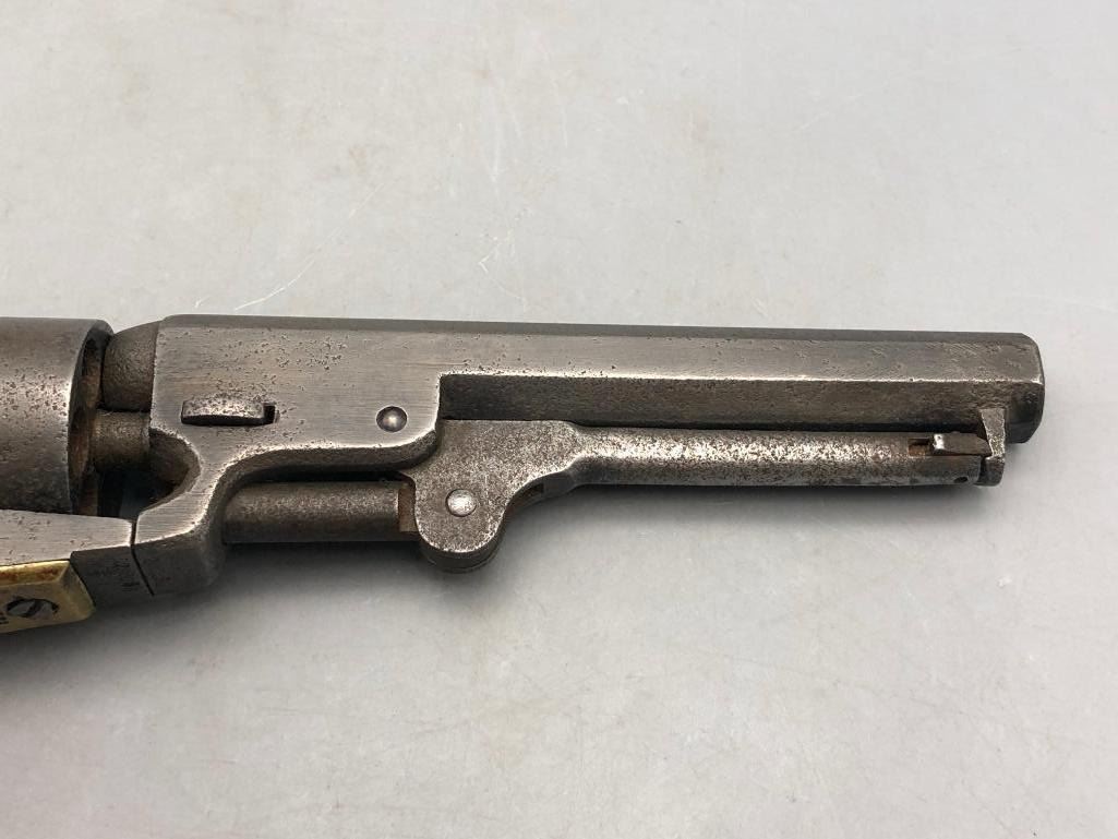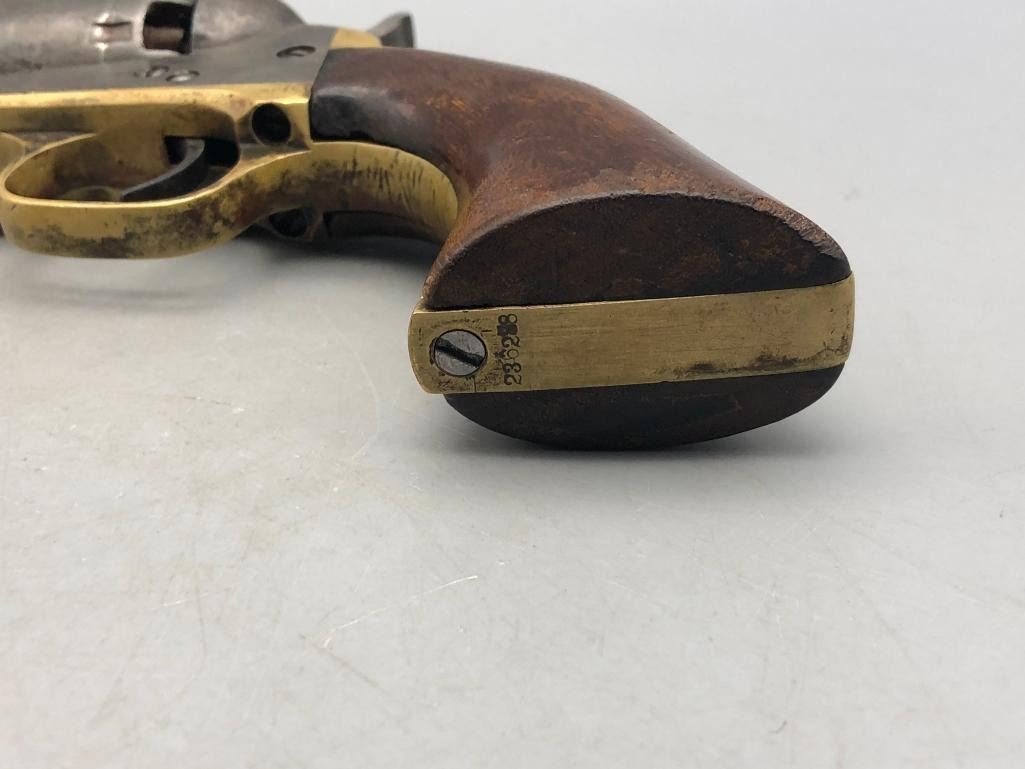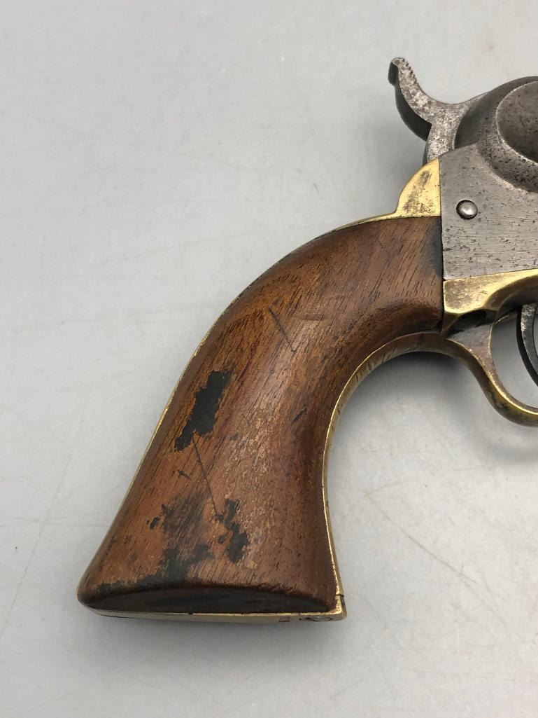 Presented for sale in this lot is a antique model 1849 Colt pocket pistol. This revolver is in decent condition for its age, showing signs of wear from age and use. It has a nice patina, and shows some pitting. It has original wood grips, and matching serial numbers. There is some wear to the wood grips. It has the one-line New York barrel address. It cycles properly, however we have not fired it. Keep in mind this is an antique and not warranted safe to shoot and it should not be attempted without the aid of an expert. Maker: Colt. Serial No. 236283. Approx. Age: 1863. Size: Barrel length is 5 inches. Condition: Fair to poor for its age, wear expected. Please look closely at the pictures - they are an important part of our description. Shipping: There will be a $15 handling / packaging fee for shipping this lot. The actual cost of postage will be added on top of that. BUY IT NOW: If you would like to buy this item now without waiting for the auction to end (this option is only available up to 48 hours before the auction starts to close), the “Buy it Now” price is the high estimate of this lot. If you would like to end the auction early and pay the high estimate (plus applicable fees), please contact us by phone or email and reference this lot number. *****ANTIQUE - This firearm DOES NOT REQUIRE an FFL Transfer*****