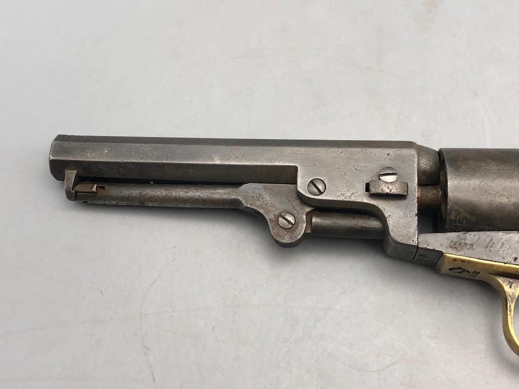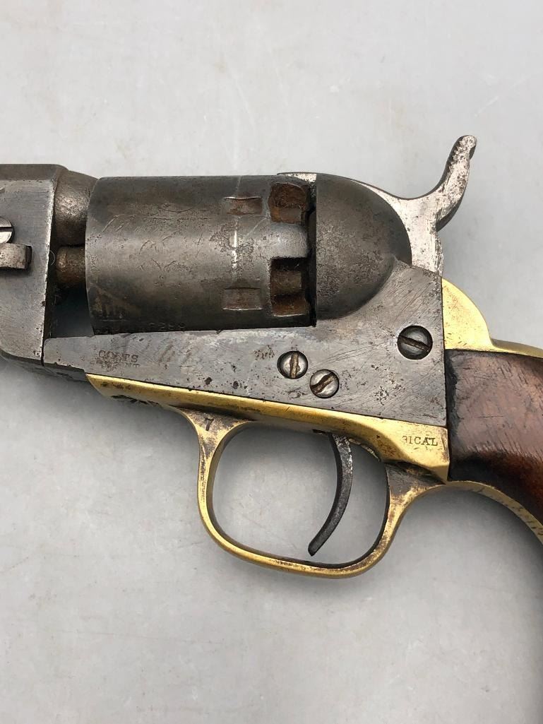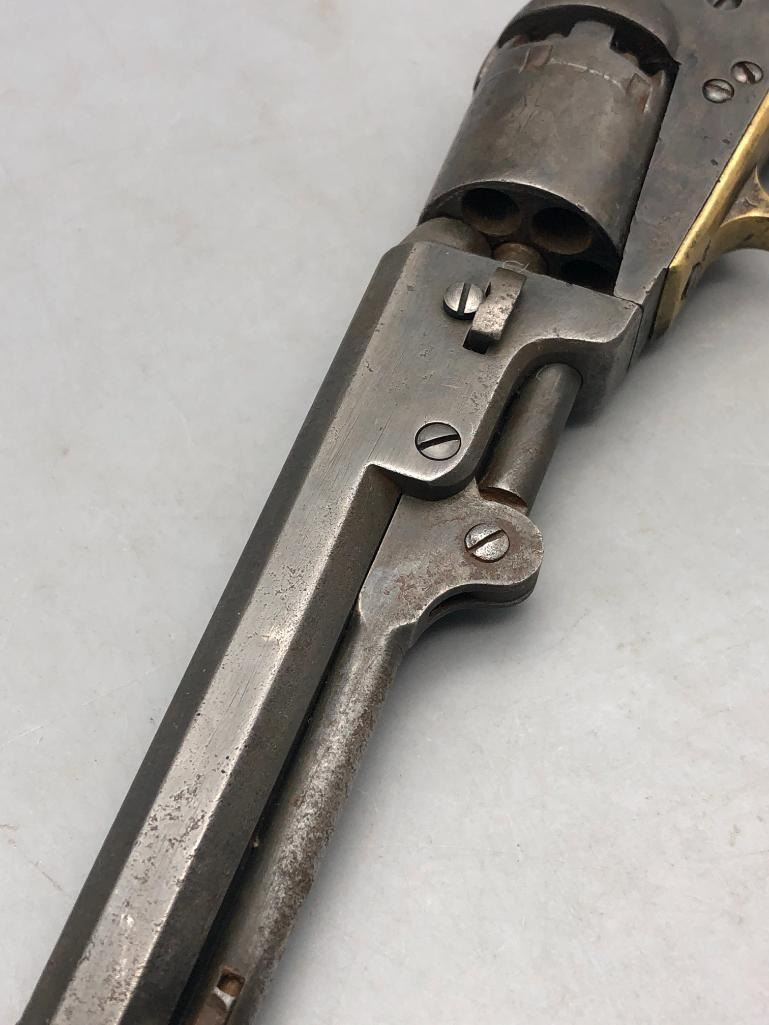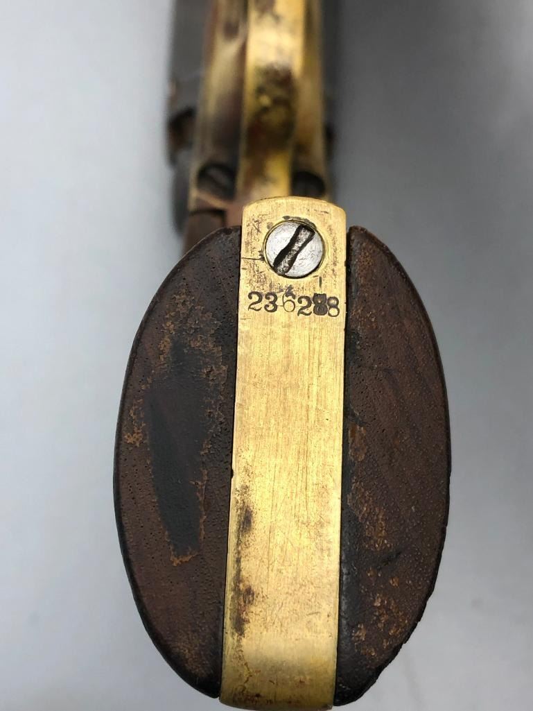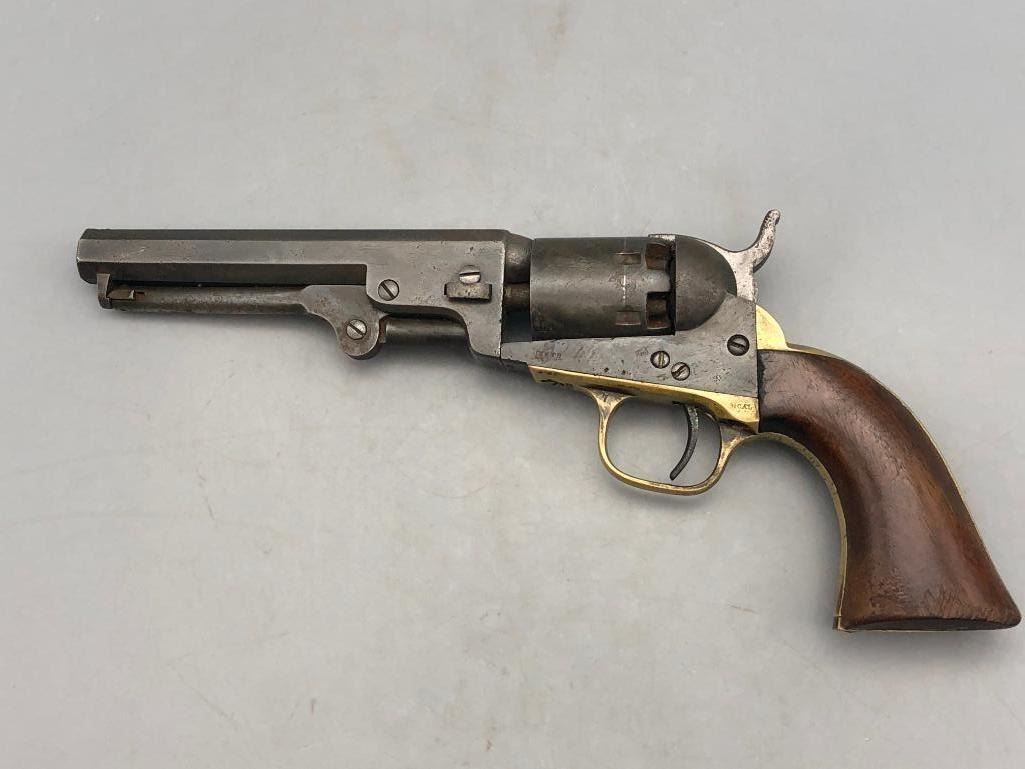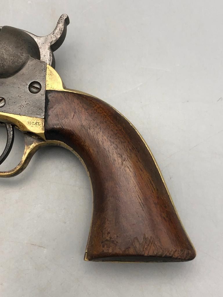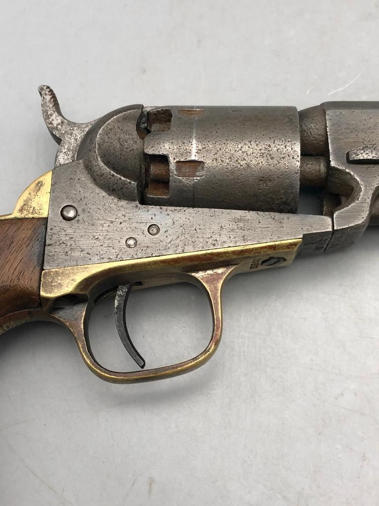 Presented for sale in this lot is a antique model 1849 Colt pocket pistol. This revolver is in decent condition for its age, showing signs of wear from age and use. It has a nice patina, and shows some pitting. It has original wood grips, and matching serial numbers. There is some wear to the wood grips. It has the one-line New York barrel address. It cycles properly, however we have not fired it. Keep in mind this is an antique and not warranted safe to shoot and it should not be attempted without the aid of an expert. Maker: Colt. Serial No. 236283. Approx. Age: 1863. Size: Barrel length is 5 inches. Condition: Fair to poor for its age, wear expected. Please look closely at the pictures - they are an important part of our description. Shipping: There will be a $15 handling / packaging fee for shipping this lot. The actual cost of postage will be added on top of that. BUY IT NOW: If you would like to buy this item now without waiting for the auction to end (this option is only available up to 48 hours before the auction starts to close), the “Buy it Now” price is the high estimate of this lot. If you would like to end the auction early and pay the high estimate (plus applicable fees), please contact us by phone or email and reference this lot number. *****ANTIQUE - This firearm DOES NOT REQUIRE an FFL Transfer*****