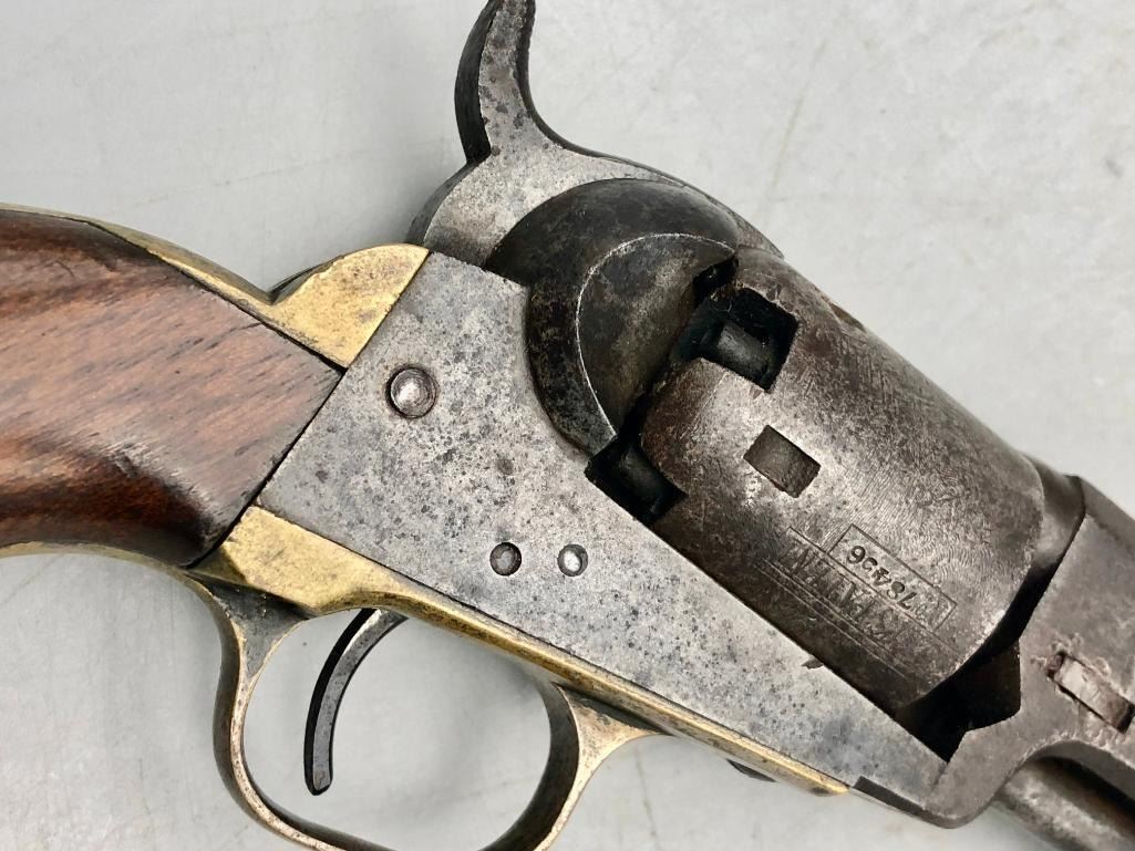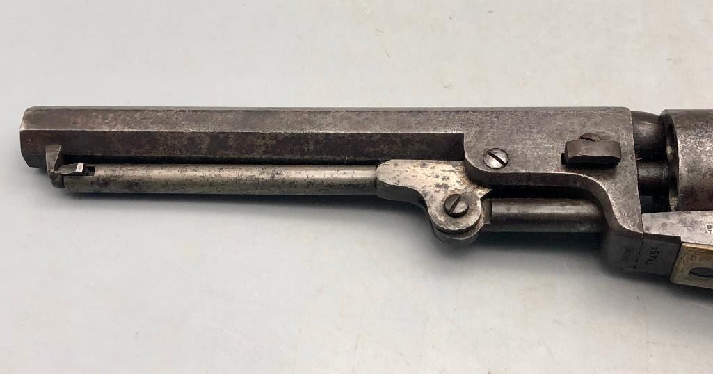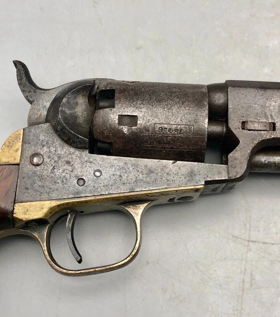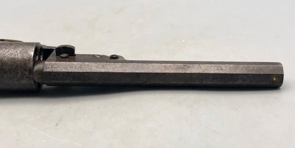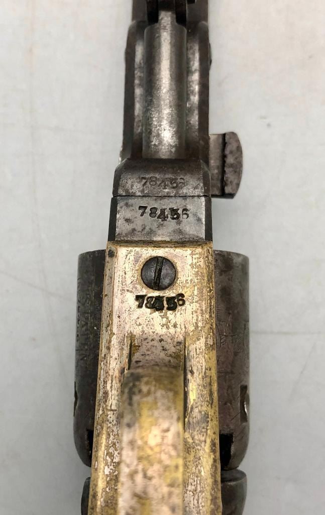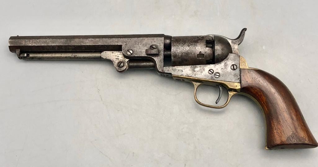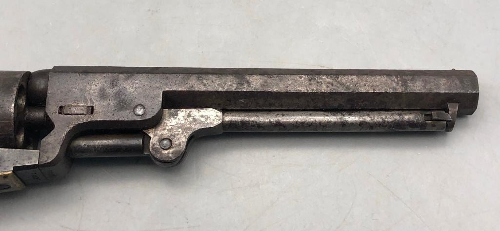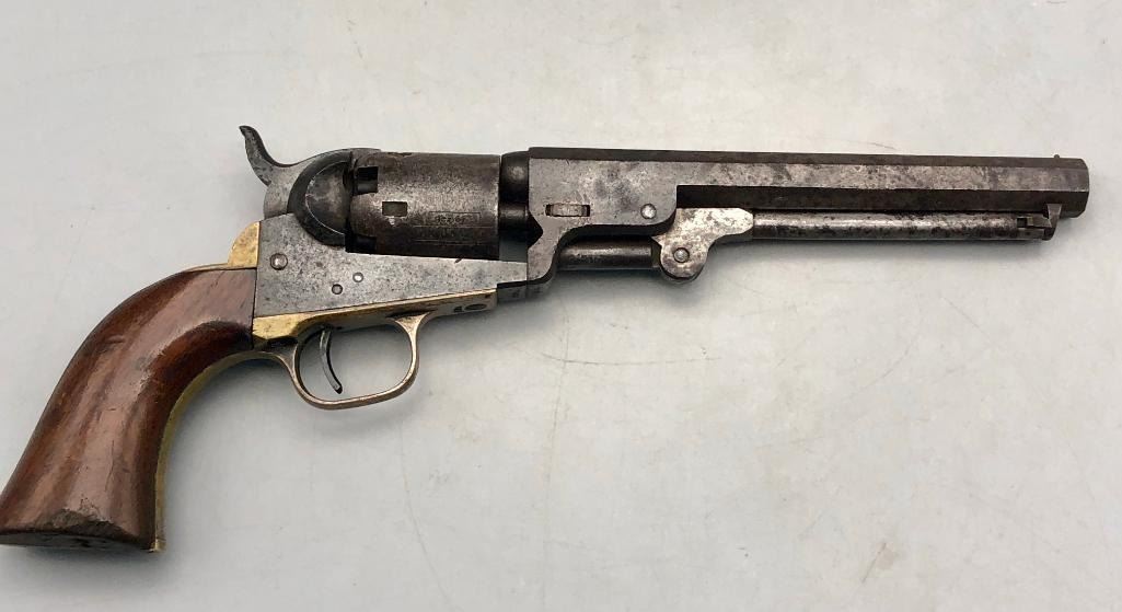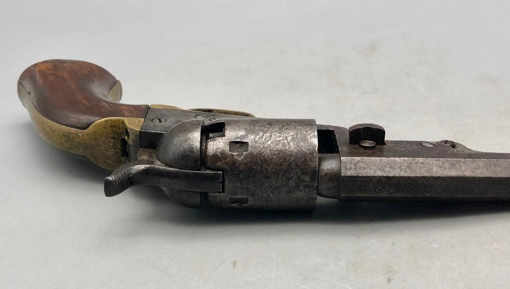 Offered for sale in this lot is an antique model 1849 Colt pocket pistol. This revolver is in decent condition for an antique pistol, showing signs of wear. The finish is nearly gone, there is some pitting, and has some wear to the corners of the wood grips. The serial numbers are all matching, even on the cylinder, and has the original wood grips. There is some of the original engraving still present on the cylinder. It has the two-line New York barrel address. This revolver cycles properly, however we have not fired it. Keep in mind this is an antique and not warranted safe to shoot without the aid of an expert. Maker: Colt. Serial No. 78456. Approx. Age: 1853. Size: Barrel length is 7 inches. Condition: Fair to poor for its age, wear expected. Please look closely at the pictures - they are an important part of our description. Shipping: There will be a $15 handling / packaging fee for shipping this lot. The actual cost of postage will be added on top of that. BUY IT NOW: If you would like to buy this item now without waiting for the auction to end (this option is only available up to 48 hours before the auction starts to close), the “Buy it Now” price is the high estimate of this lot. If you would like to end the auction early and pay the high estimate (plus applicable fees), please contact us by phone or email and reference this lot number. *****ANTIQUE - This firearm DOES NOT REQUIRE an FFL Transfer*****