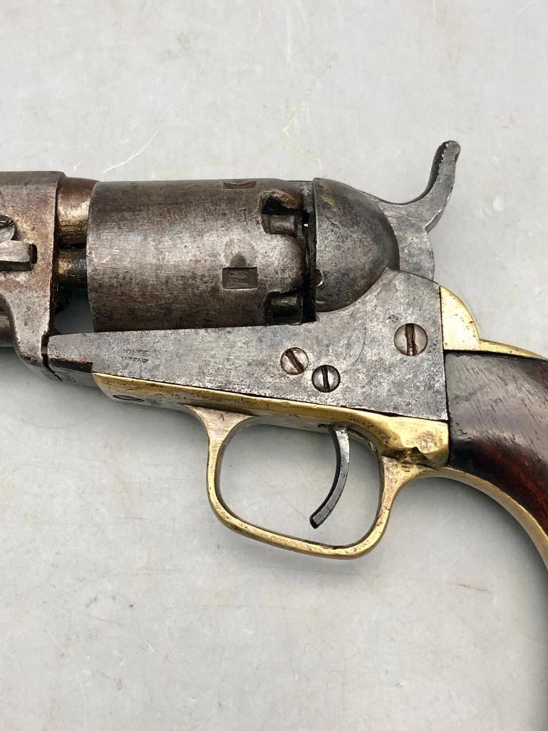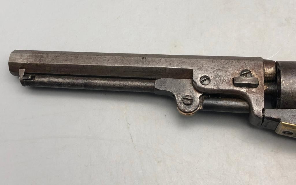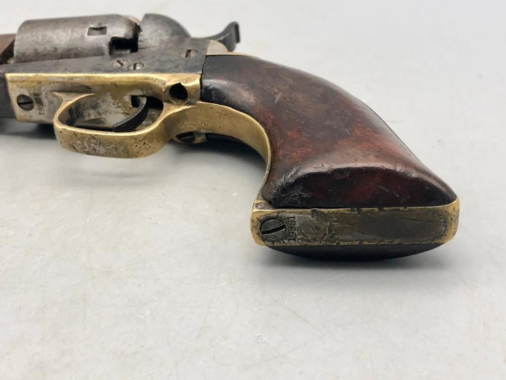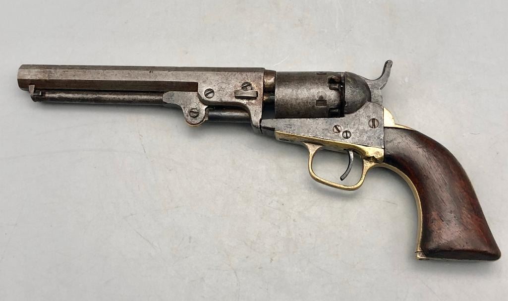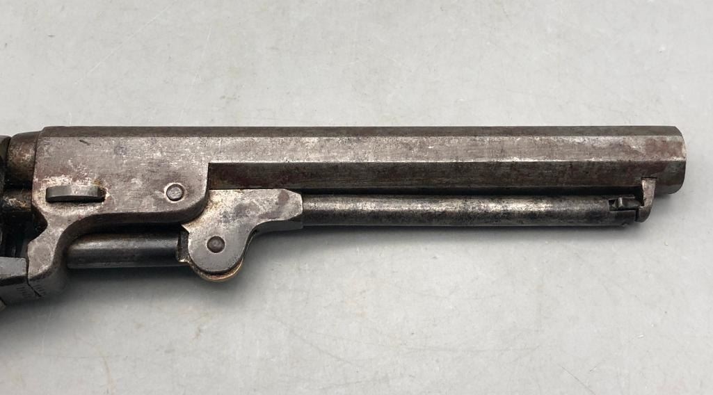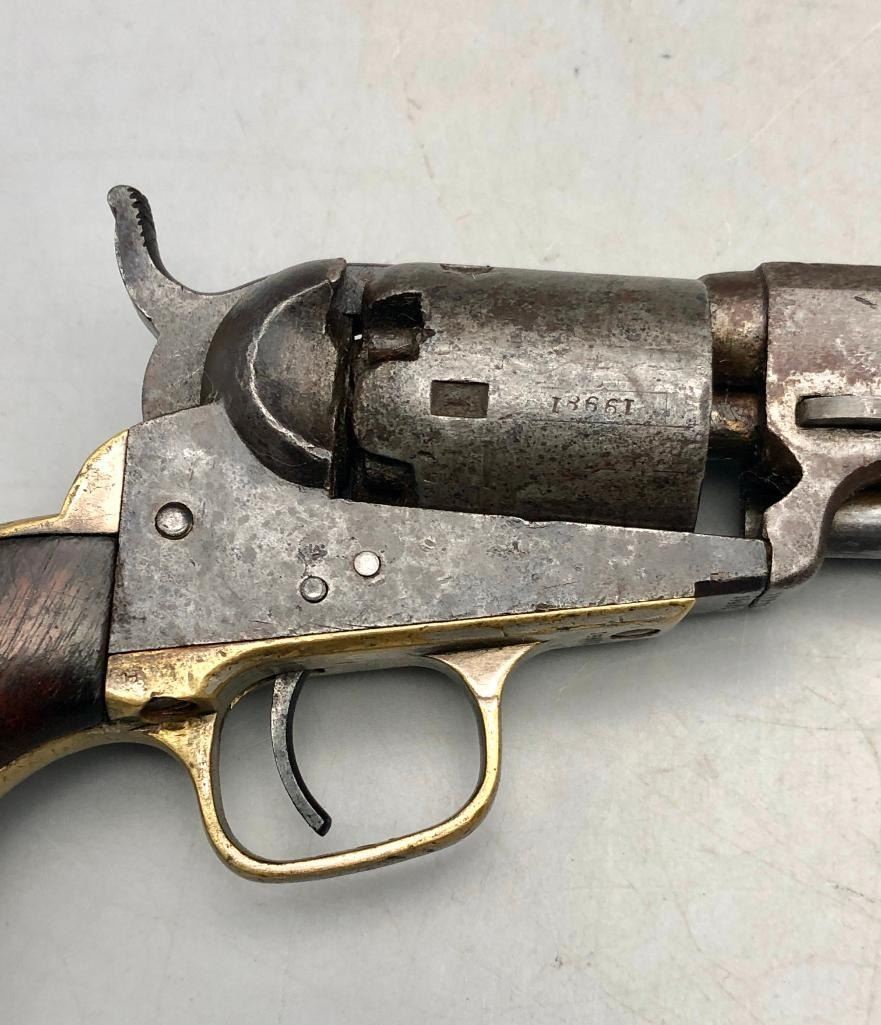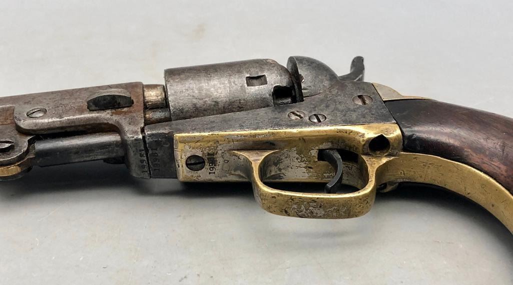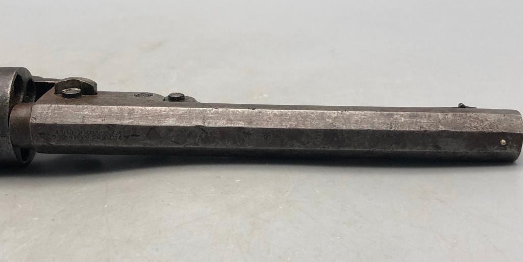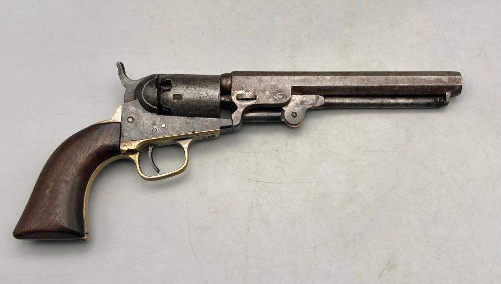 Presented for sale in this lot is an antique Colt pocket pistol. This revolver is in decent condition, showing signs of wear, typical for a pistol this age. The finish is nearly gone, it has some pitting, some minor rust, and some dings throughout. It has original wood grips and matching serial numbers. It has the two-line New York barrel address. It cycles properly, however we have not fired it. Keep in mind this is an antique and not warranted safe to shoot, without the aid of an expert. Maker: Colt. Serial No. 19981. Approx. Age: 1851. Size: Barrel length is 6 inches. Condition: Fair to poor for its age, wear expected. Please look closely at the pictures - they are an important part of our description. Shipping: There will be a $15 handling / packaging fee for shipping this lot. The actual cost of postage will be added on top of that. BUY IT NOW: If you would like to buy this item now without waiting for the auction to end (this option is only available up to 48 hours before the auction starts to close), the “Buy it Now” price is the high estimate of this lot. If you would like to end the auction early and pay the high estimate (plus applicable fees), please contact us by phone or email and reference this lot number. *****ANTIQUE - This firearm DOES NOT REQUIRE an FFL Transfer*****