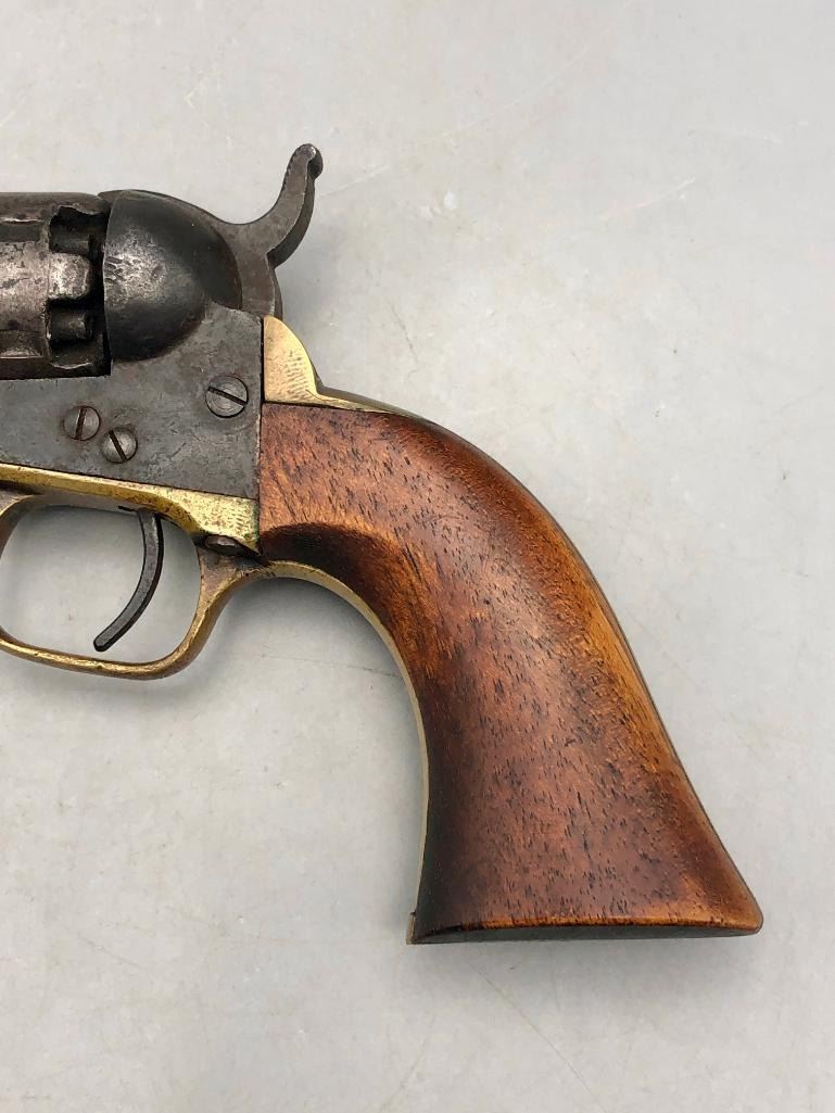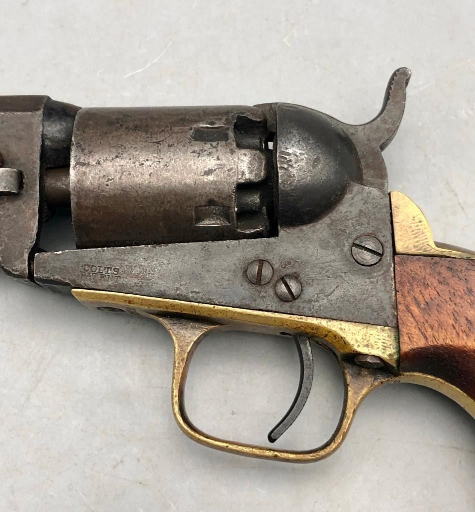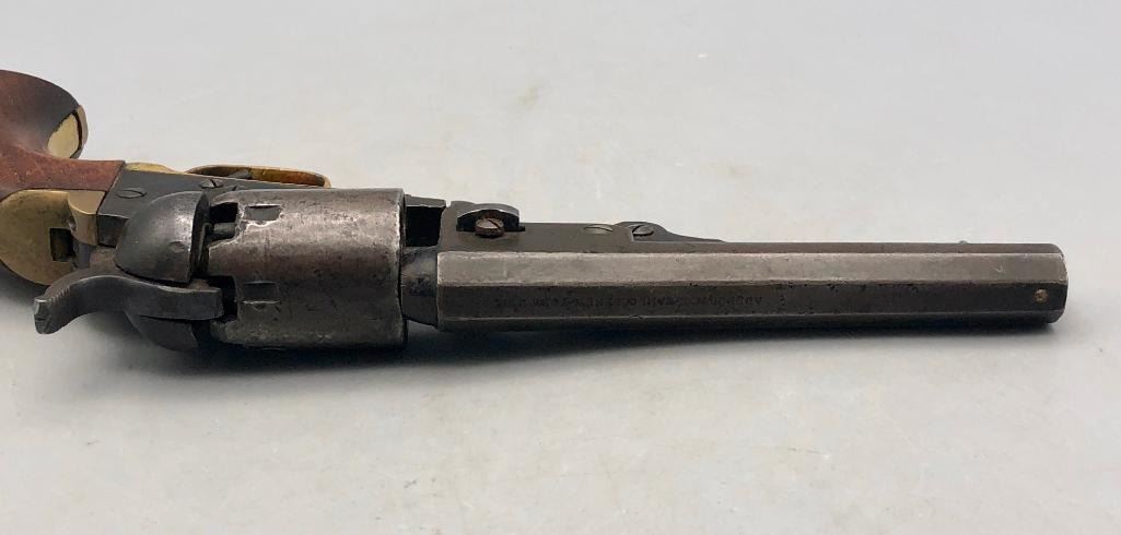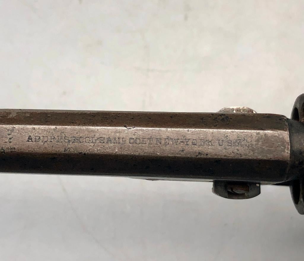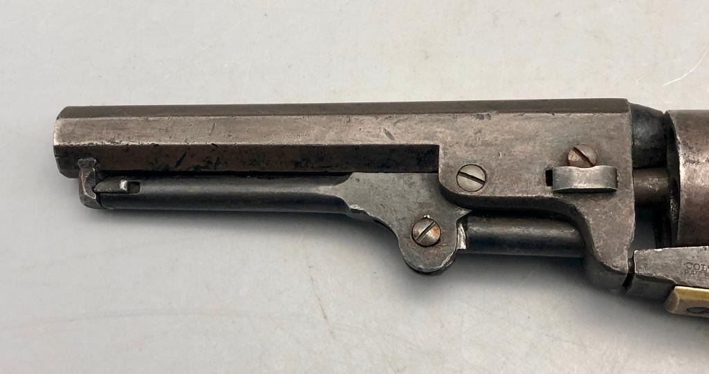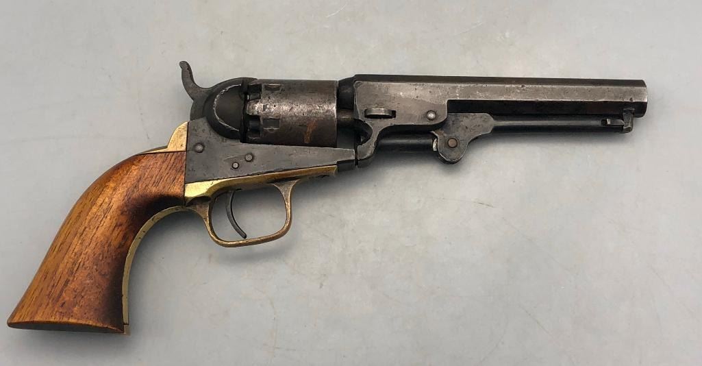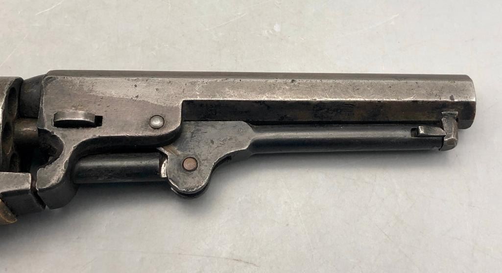 For your consideration is an antique model 1849 Colt pocket pistol. This revolver is in fair condition, showing signs of wear, with a dark patina. There are dings throughout the metal, some pitting and the finish is nearly gone. It has the one-line New York barrel address, original wood grips and matching serial numbers on the trigger guard and frame. It cycles properly, however we have not fired it. Keep in mind this is an antique, and not warranted safe to shoot, and it should not be attempted without the aid of an expert. Maker: Colt. Serial No. 220958. Approx. Age: 1862. Size: Barrel measures 5 inches long. 31 Caliber. Condition: Fair to poor for its age, wear expected. Please look closely at the pictures - they are an important part of our description. Shipping: There will be a $15 handling / packaging fee for shipping this lot. The actual cost of postage will be added on top of that. BUY IT NOW: If you would like to buy this item now without waiting for the auction to end (this option is only available up to 48 hours before the auction starts to close), the “Buy it Now” price is the high estimate of this lot. If you would like to end the auction early and pay the high estimate (plus applicable fees), please contact us by phone or email and reference this lot number. *****ANTIQUE - This firearm DOES NOT REQUIRE an FFL Transfer*****