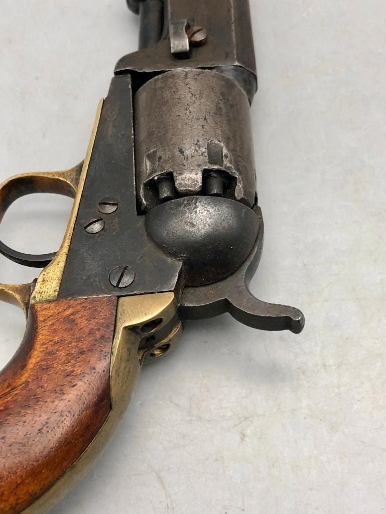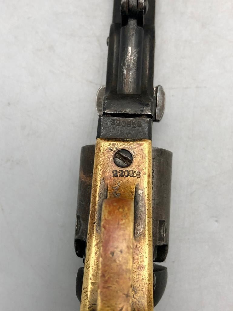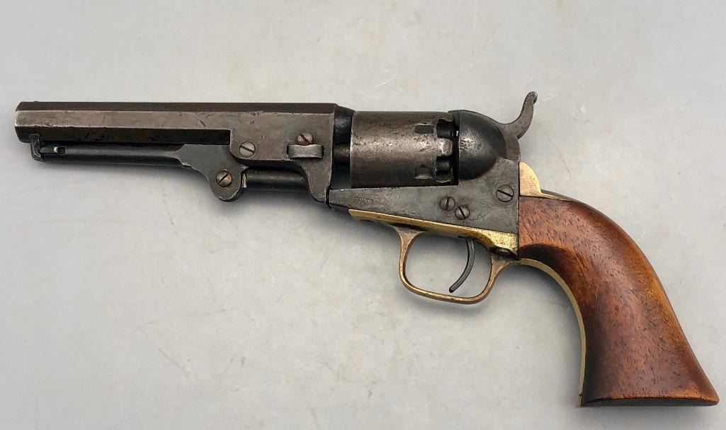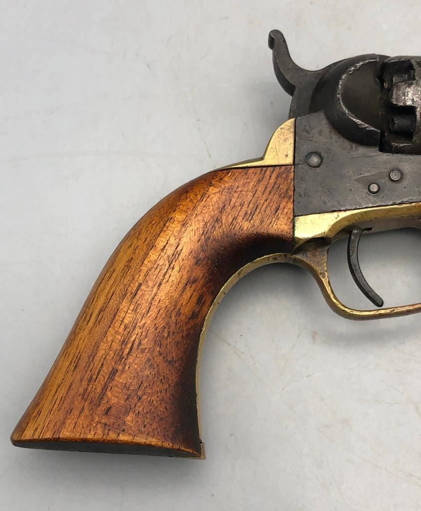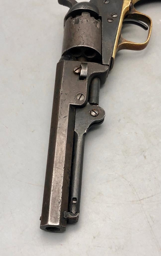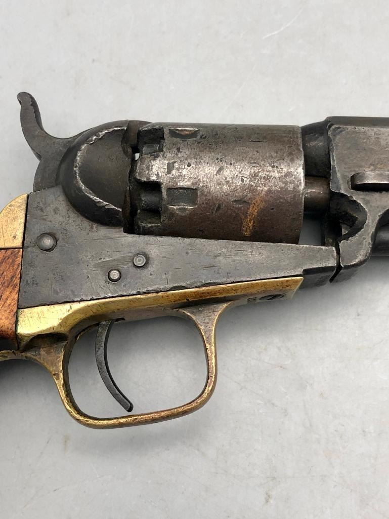 For your consideration is an antique model 1849 Colt pocket pistol. This revolver is in fair condition, showing signs of wear, with a dark patina. There are dings throughout the metal, some pitting and the finish is nearly gone. It has the one-line New York barrel address, original wood grips and matching serial numbers on the trigger guard and frame. It cycles properly, however we have not fired it. Keep in mind this is an antique, and not warranted safe to shoot, and it should not be attempted without the aid of an expert. Maker: Colt. Serial No. 220958. Approx. Age: 1862. Size: Barrel measures 5 inches long. 31 Caliber. Condition: Fair to poor for its age, wear expected. Please look closely at the pictures - they are an important part of our description. Shipping: There will be a $15 handling / packaging fee for shipping this lot. The actual cost of postage will be added on top of that. BUY IT NOW: If you would like to buy this item now without waiting for the auction to end (this option is only available up to 48 hours before the auction starts to close), the “Buy it Now” price is the high estimate of this lot. If you would like to end the auction early and pay the high estimate (plus applicable fees), please contact us by phone or email and reference this lot number. *****ANTIQUE - This firearm DOES NOT REQUIRE an FFL Transfer*****