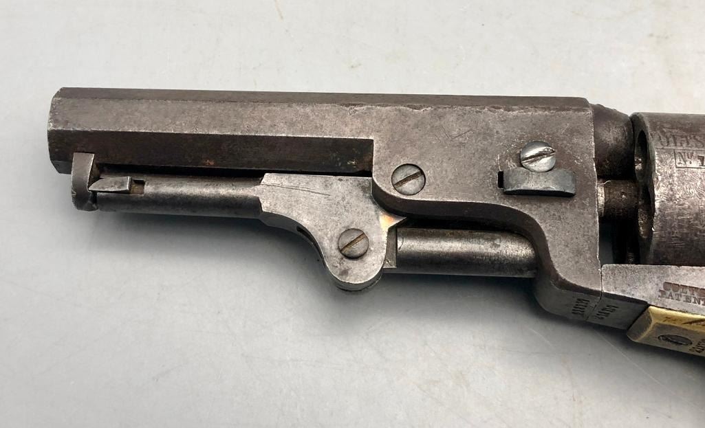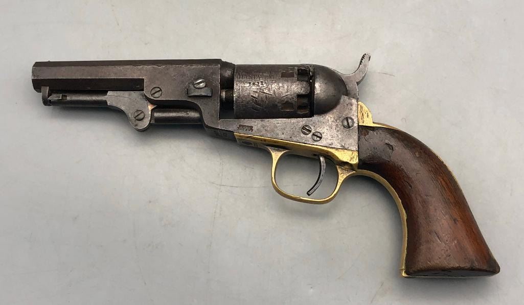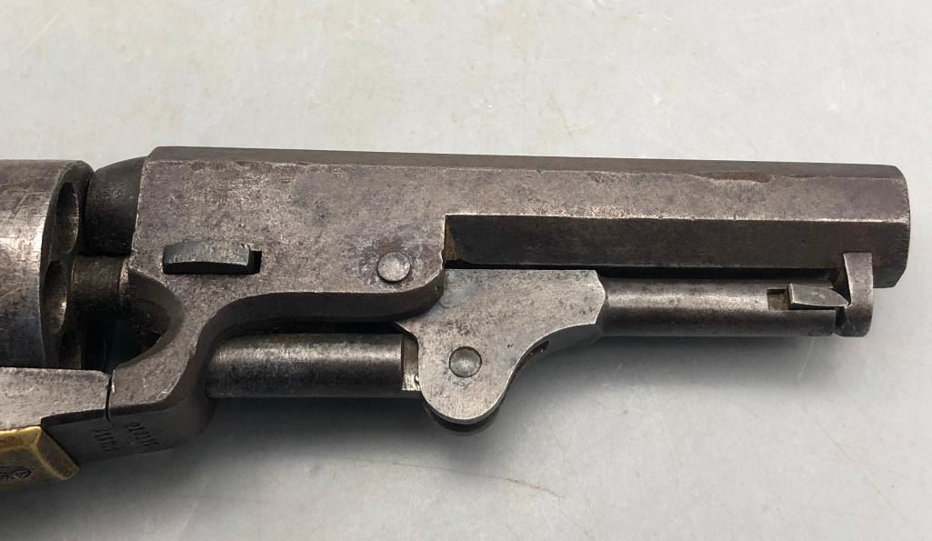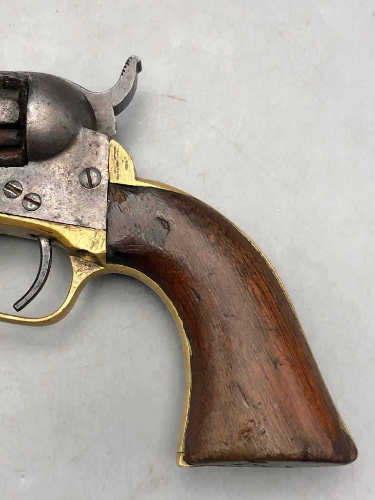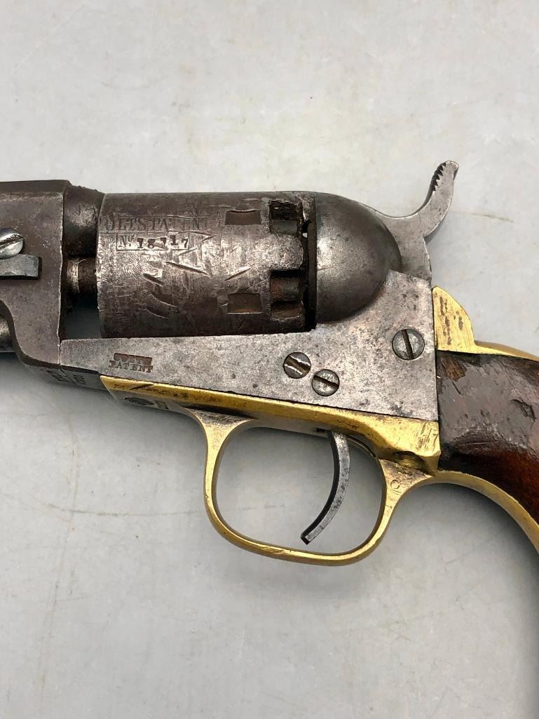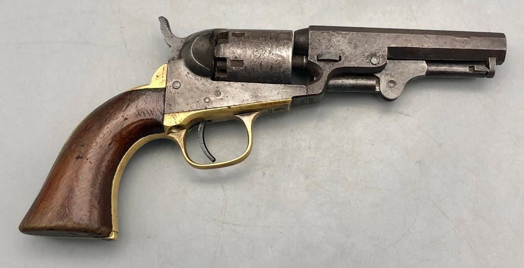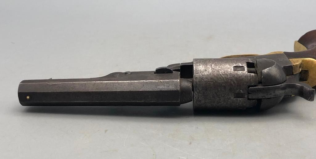 Presented for sale in this lot is an antique model 1849 Colt pocket pistol. This revolver is in fair condition, showing signs of wear, typical for a pistol of this age. It has matching serial numbers, some of the original engraving still present on the cylinder and the original wood grips. It has the one line New York address, on the barrel. It has dings throughout, some pitting, the finish is nearly gone, and some wear to the corners of the wood grips. It cycles properly, however we have not fired it. Keep in mind this is an antique, and not warranted safe to shoot, and should not be attempted without the aid of an expert. Maker: Colt. Serial No. 218117. Approx. Age: 1862. Size: Barrel measures 4 inches long. 31 Caliber. Condition: Fair to poor for its age, wear expected. Please look closely at the pictures - they are an important part of our description. Shipping: There will be a $15 handling / packaging fee for shipping this lot. The actual cost of postage will be added on top of that. BUY IT NOW: If you would like to buy this item now without waiting for the auction to end (this option is only available up to 48 hours before the auction starts to close), the “Buy it Now” price is the high estimate of this lot. If you would like to end the auction early and pay the high estimate (plus applicable fees), please contact us by phone or email and reference this lot number. *****ANTIQUE - This firearm DOES NOT REQUIRE an FFL Transfer*****