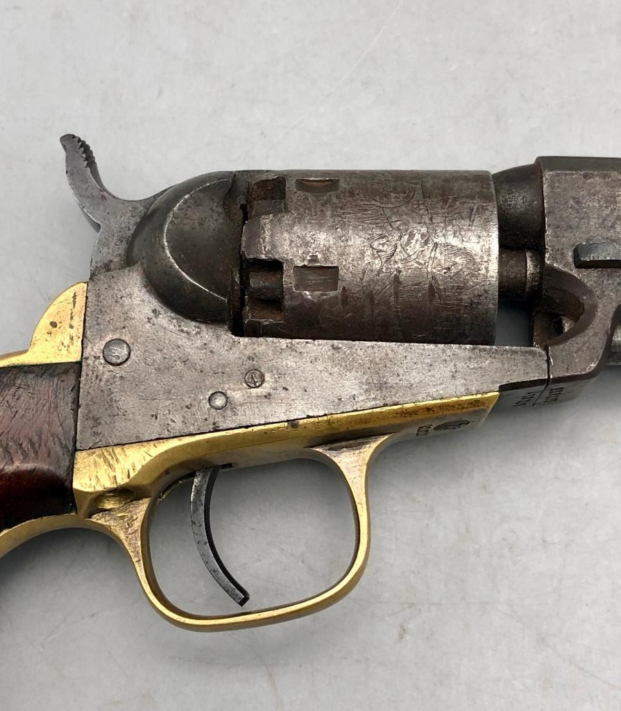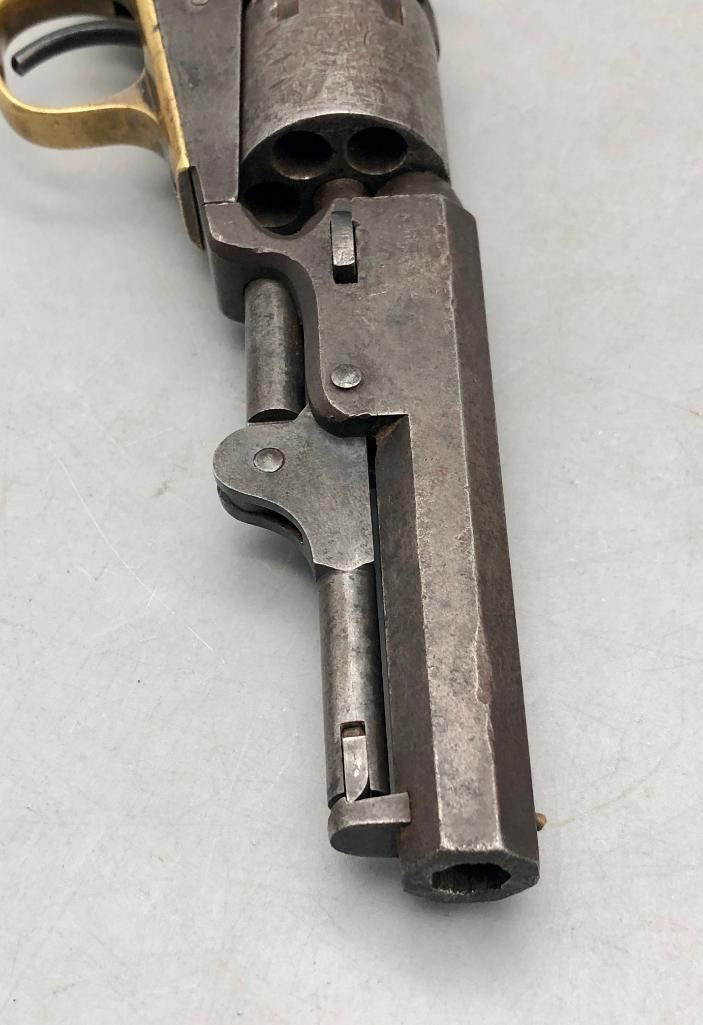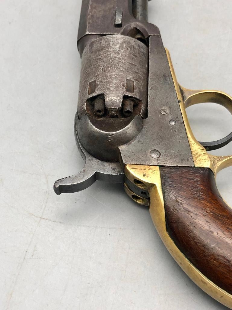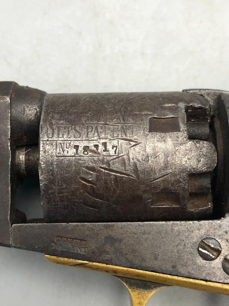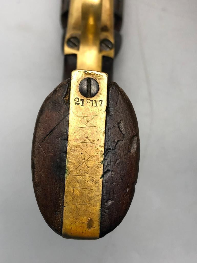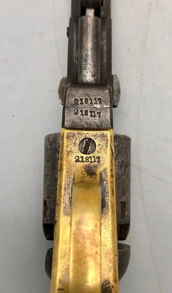 Presented for sale in this lot is an antique model 1849 Colt pocket pistol. This revolver is in fair condition, showing signs of wear, typical for a pistol of this age. It has matching serial numbers, some of the original engraving still present on the cylinder and the original wood grips. It has the one line New York address, on the barrel. It has dings throughout, some pitting, the finish is nearly gone, and some wear to the corners of the wood grips. It cycles properly, however we have not fired it. Keep in mind this is an antique, and not warranted safe to shoot, and should not be attempted without the aid of an expert. Maker: Colt. Serial No. 218117. Approx. Age: 1862. Size: Barrel measures 4 inches long. 31 Caliber. Condition: Fair to poor for its age, wear expected. Please look closely at the pictures - they are an important part of our description. Shipping: There will be a $15 handling / packaging fee for shipping this lot. The actual cost of postage will be added on top of that. BUY IT NOW: If you would like to buy this item now without waiting for the auction to end (this option is only available up to 48 hours before the auction starts to close), the “Buy it Now” price is the high estimate of this lot. If you would like to end the auction early and pay the high estimate (plus applicable fees), please contact us by phone or email and reference this lot number. *****ANTIQUE - This firearm DOES NOT REQUIRE an FFL Transfer*****