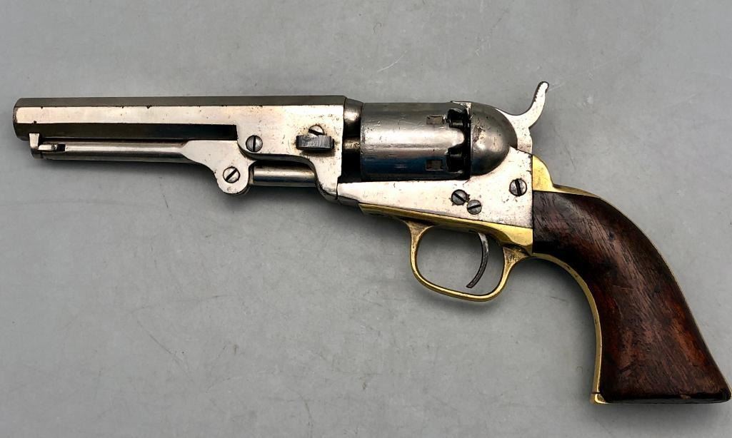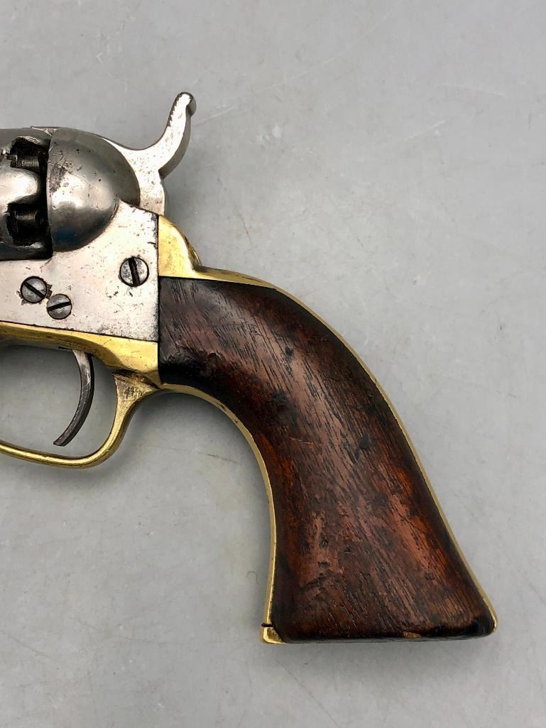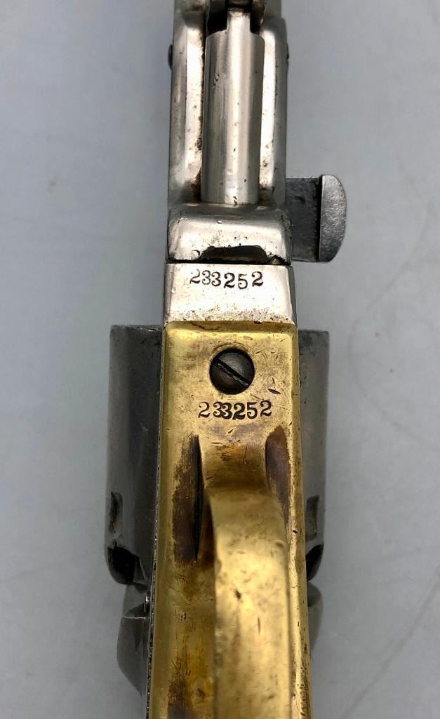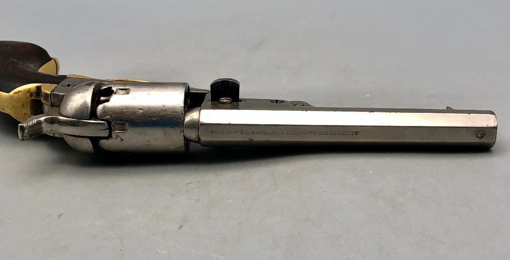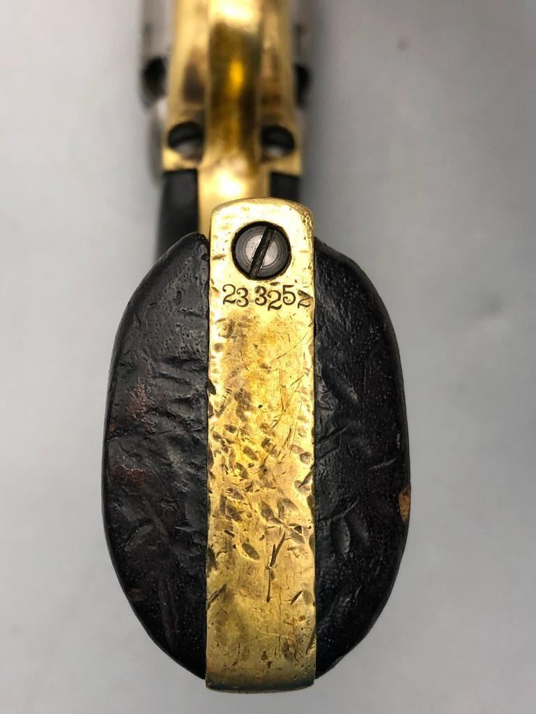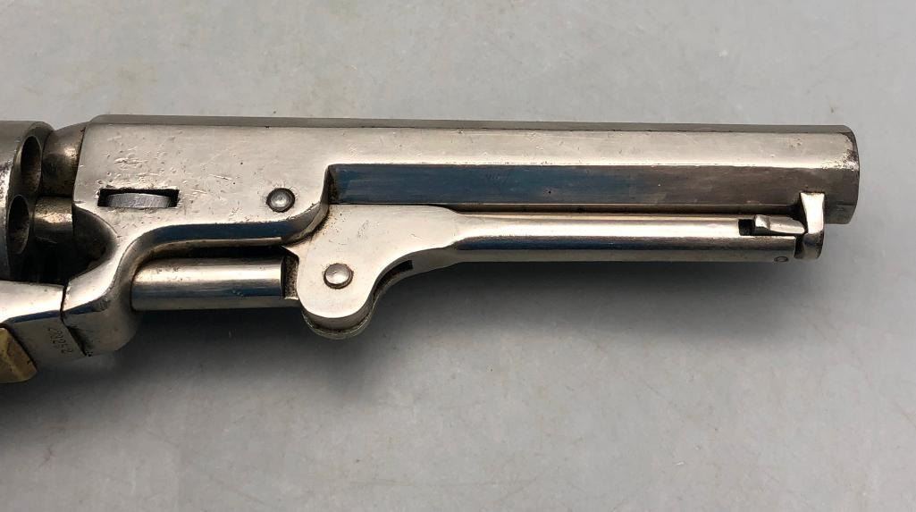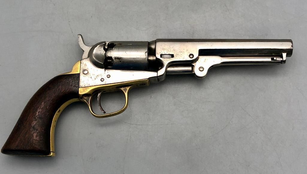 Offered for sale in this lot is an antique model 1849 Colt pocket pistol. This revolver is in decent condition, showing signs of wear, with a nice patina. It is nickel plated and there are some dings on the metal, especially on the butt of the pistol, on the brass and some wear to the wood grips. All the serial numbers are matching and it has the original wood grips. It has the one line New York address. It cycles properly, however we have not fired it. Keep in mind this is an antique, and not warranted safe to shoot, and should not be attempted without the aid of an expert. A nice addition to your collection! Maker: Serial No. 233252. Approx. Age: 1863. Size: Barrel measures 5 inches long. 31 Caliber. Condition: Fair for its age, wear expected. Please look closely at the pictures - they are an important part of our description. Shipping: There will be a $15 handling / packaging fee for shipping this lot. The actual cost of postage will be added on top of that. BUY IT NOW: If you would like to buy this item now without waiting for the auction to end (this option is only available up to 48 hours before the auction starts to close), the “Buy it Now” price is the high estimate of this lot. If you would like to end the auction early and pay the high estimate (plus applicable fees), please contact us by phone or email and reference this lot number. *****ANTIQUE - This firearm DOES NOT REQUIRE an FFL Transfer*****