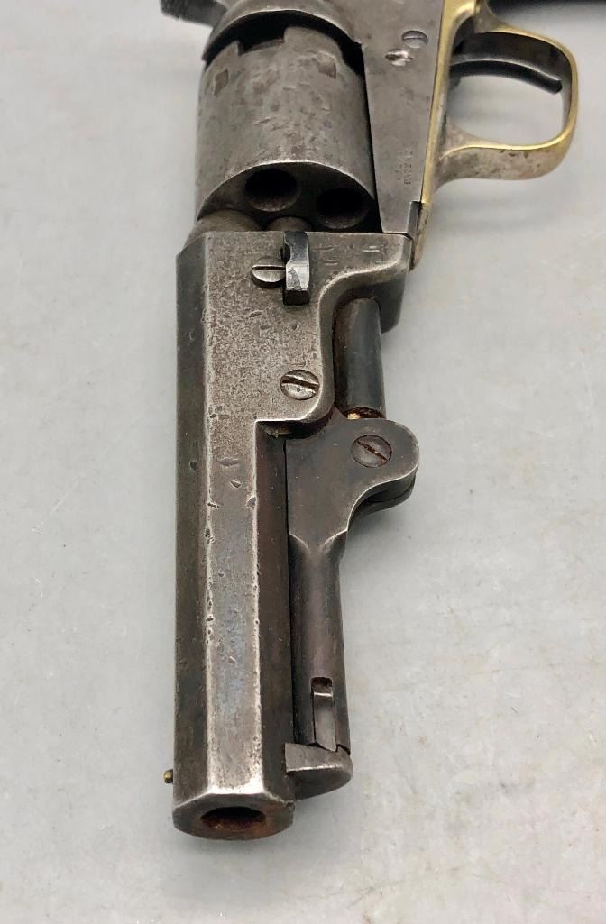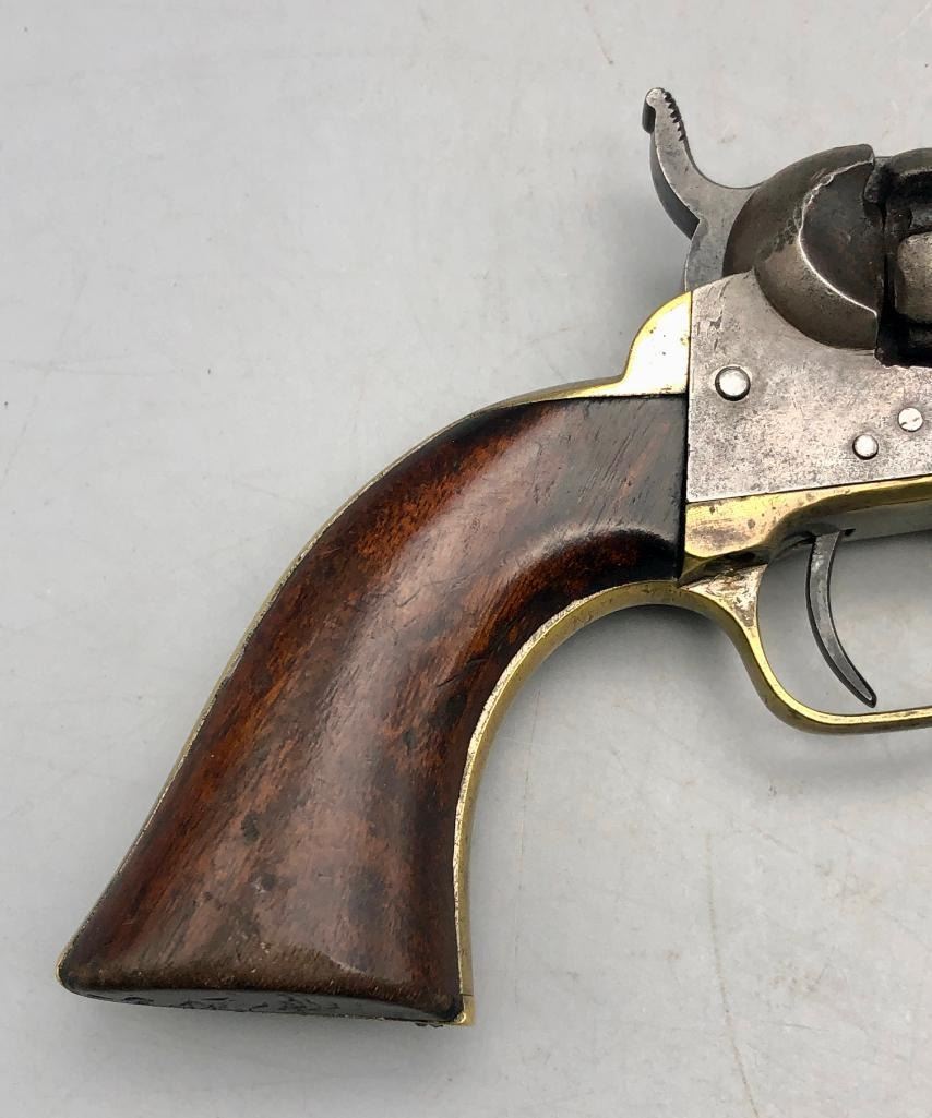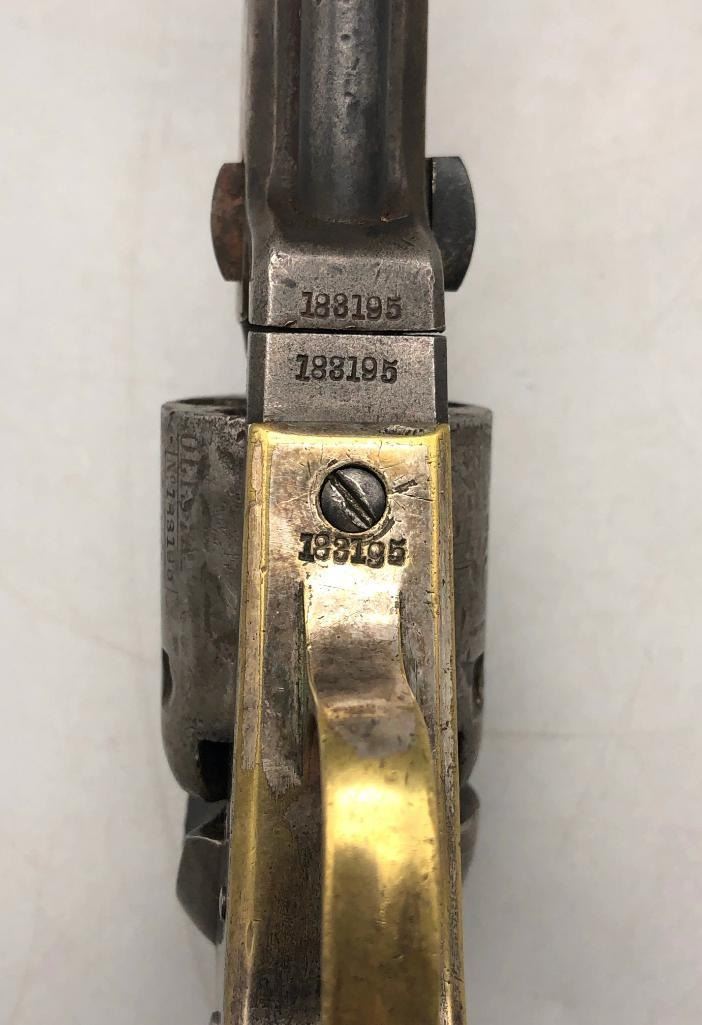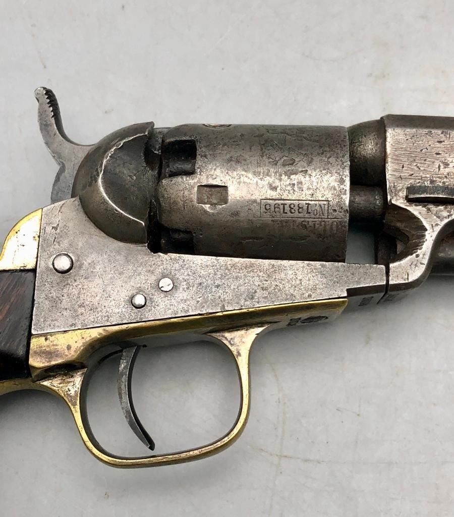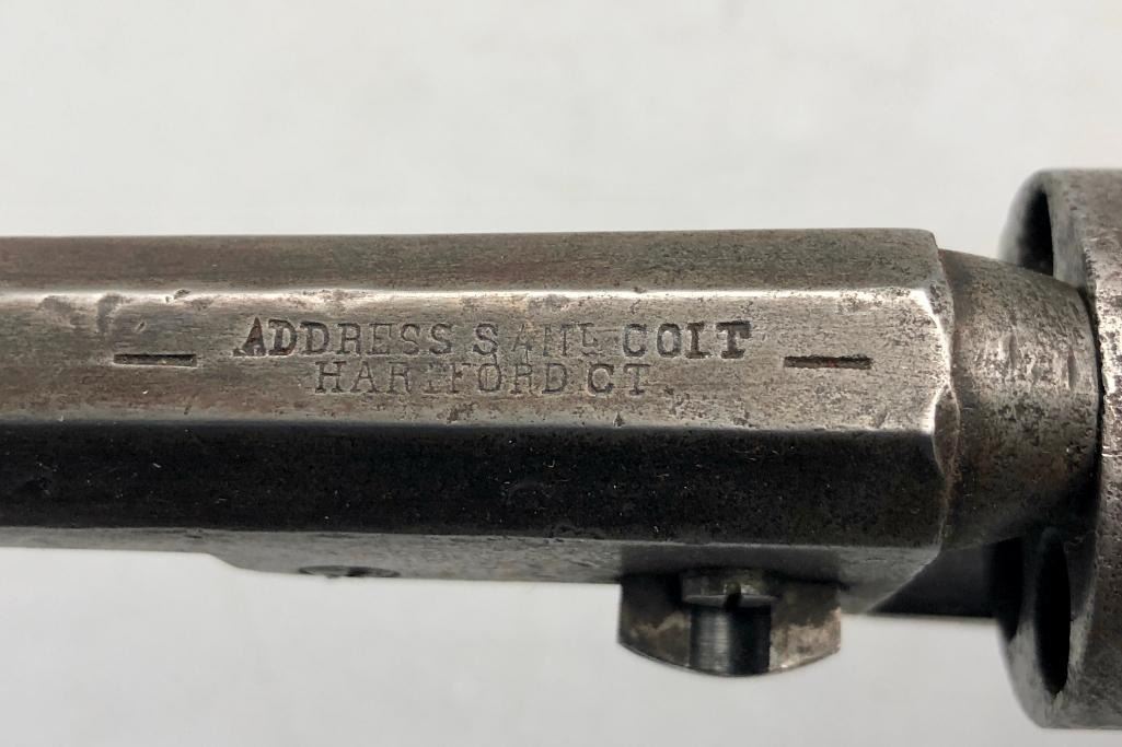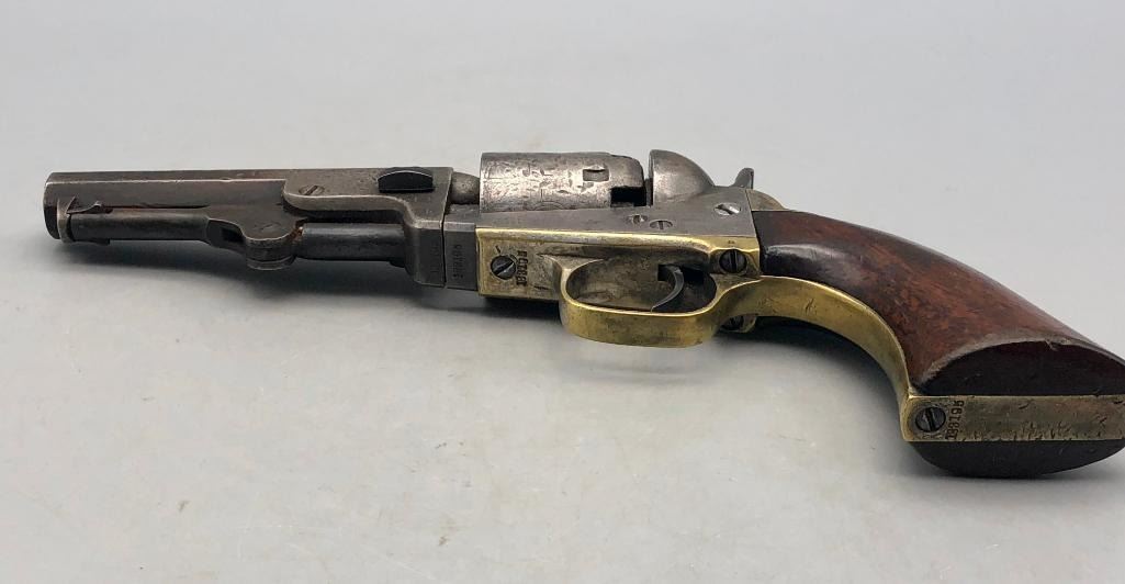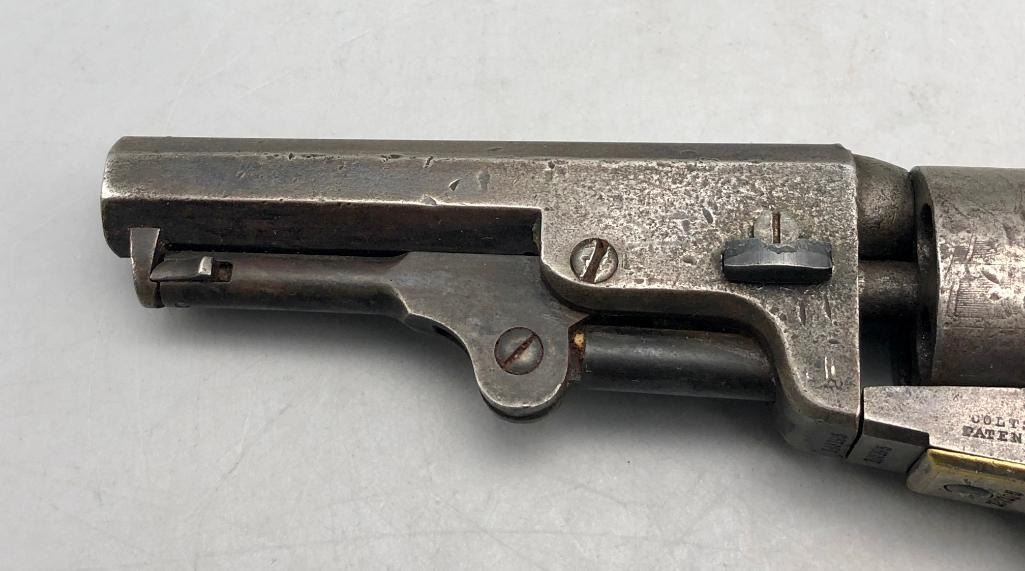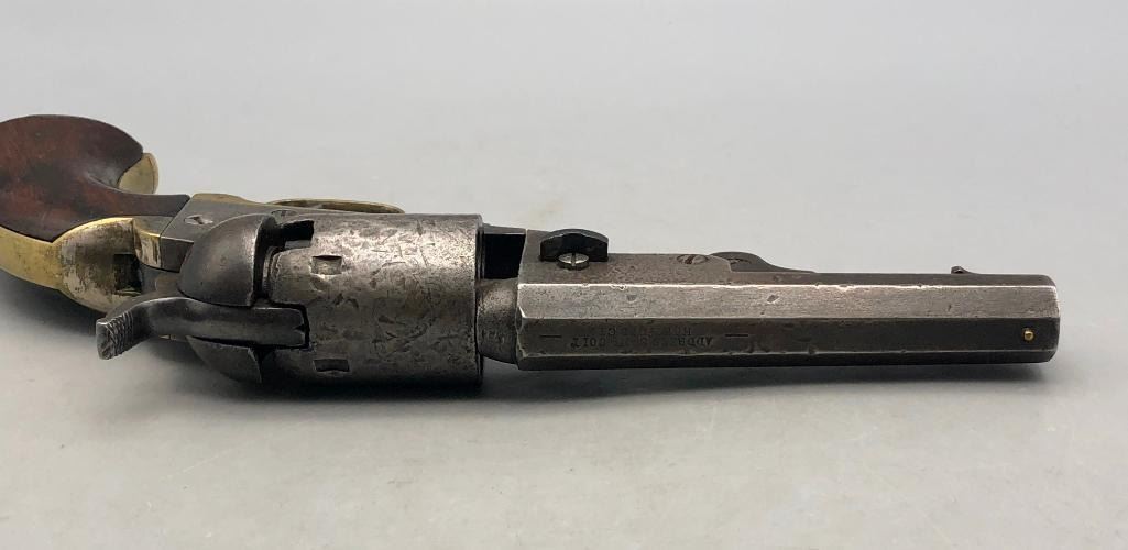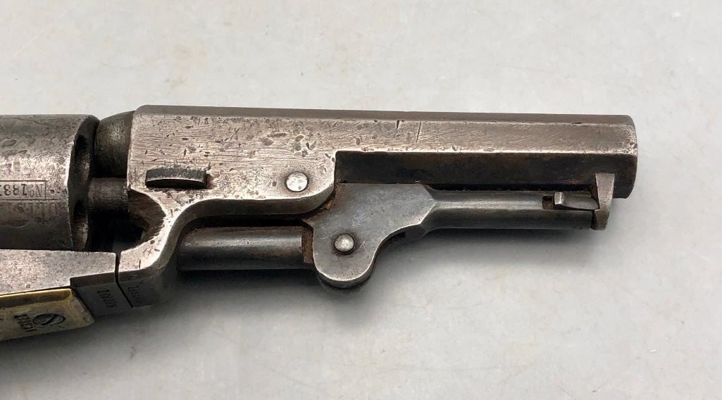 Presented for sale in this lot is an antique model 1849 Colt pocket pistol. This revolver is in fair condition, showing signs of wear, typical for a pistol of this age. It has matching serial numbers, some of the original engraving still present on the cylinder and original wood grips. It has the two line Hartford address, on the barrel. It has dings throughout, some pitting, the finish is mostly gone and some wear to the corners of the wood grips. It cycles properly, however we have not fired it. Keep in mind this is an antique, and not warranted safe to shoot, and should not be attempted without the aid of an expert. Maker: Colt. Serial No. 188195. Approx. Age: 1861. Size: Barrel length is 4 inches. .31 cal.. Condition: Fair to poor for its age, wear expected. Please look closely at the pictures - they are an important part of our description. Shipping: There will be a $15 handling / packaging fee for shipping this lot. The actual cost of postage will be added on top of that. BUY IT NOW: If you would like to buy this item now without waiting for the auction to end (this option is only available up to 48 hours before the auction starts to close), the “Buy it Now” price is the high estimate of this lot. If you would like to end the auction early and pay the high estimate (plus applicable fees), please contact us by phone or email and reference this lot number. *****ANTIQUE - This firearm DOES NOT REQUIRE an FFL Transfer*****