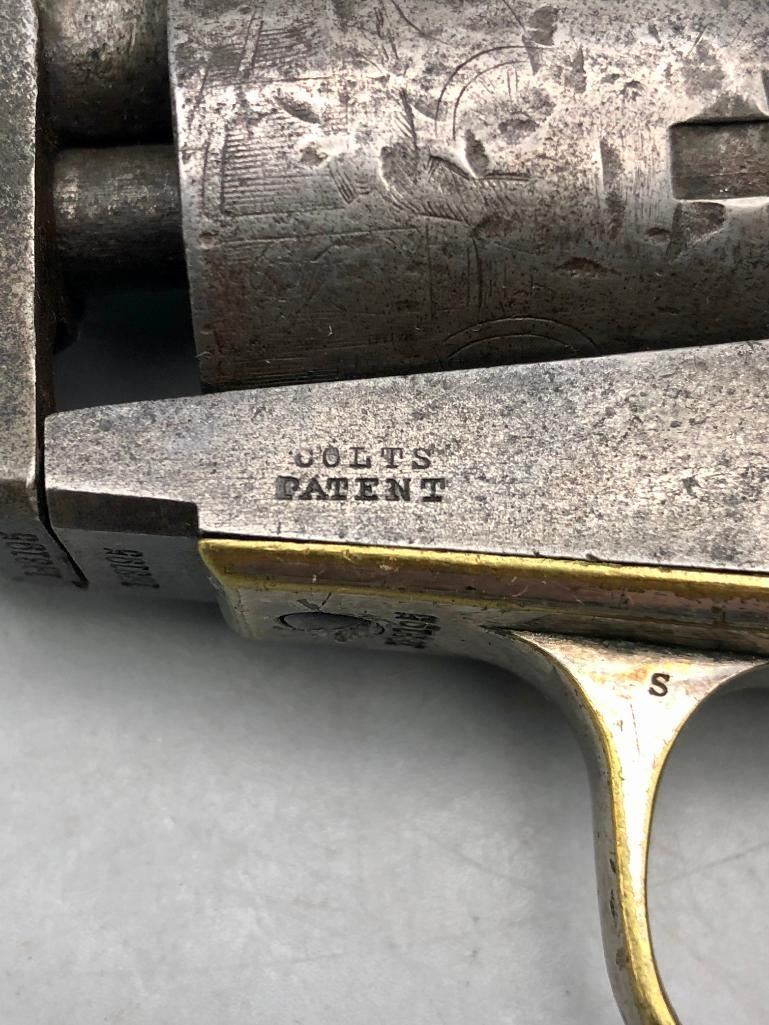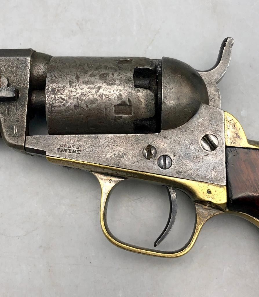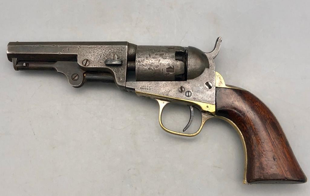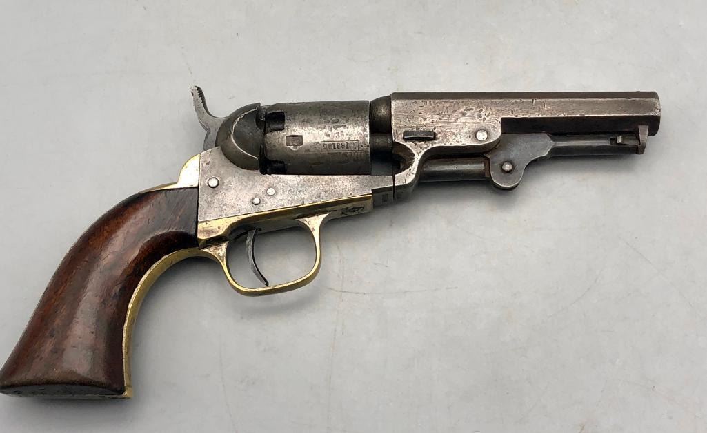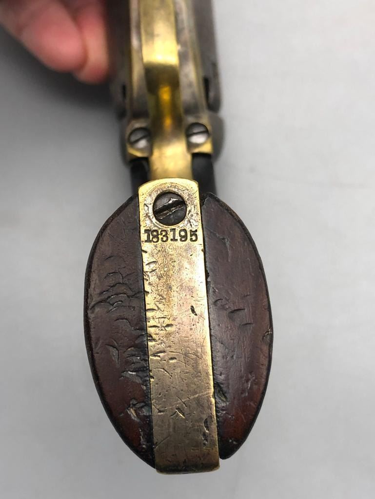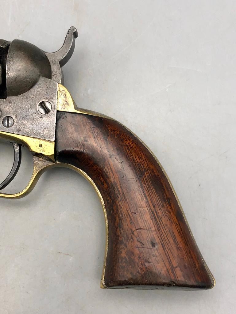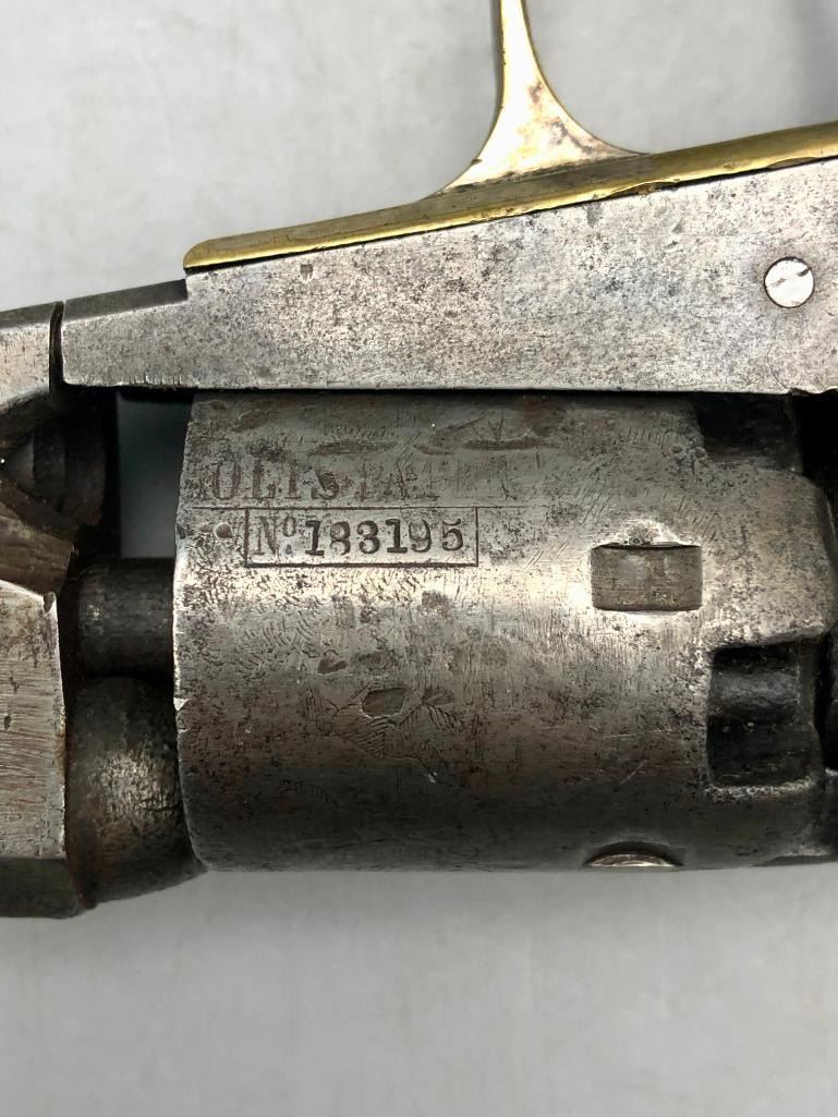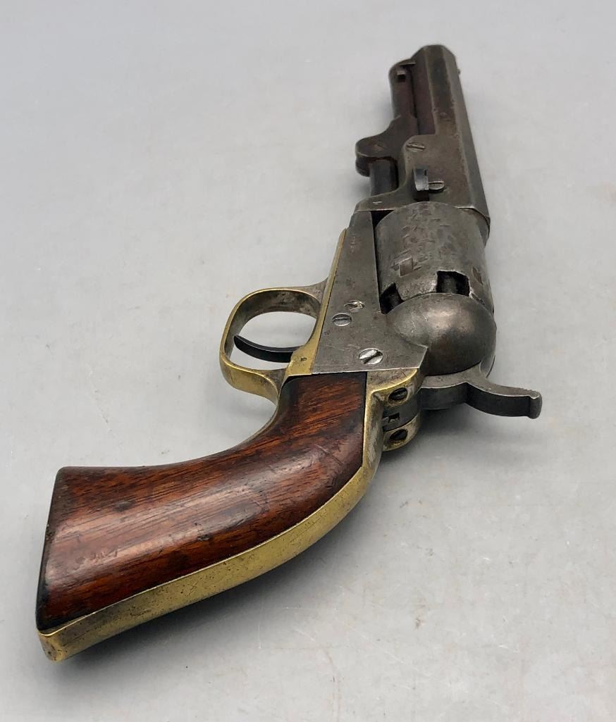 Presented for sale in this lot is an antique model 1849 Colt pocket pistol. This revolver is in fair condition, showing signs of wear, typical for a pistol of this age. It has matching serial numbers, some of the original engraving still present on the cylinder and original wood grips. It has the two line Hartford address, on the barrel. It has dings throughout, some pitting, the finish is mostly gone and some wear to the corners of the wood grips. It cycles properly, however we have not fired it. Keep in mind this is an antique, and not warranted safe to shoot, and should not be attempted without the aid of an expert. Maker: Colt. Serial No. 188195. Approx. Age: 1861. Size: Barrel length is 4 inches. .31 cal.. Condition: Fair to poor for its age, wear expected. Please look closely at the pictures - they are an important part of our description. Shipping: There will be a $15 handling / packaging fee for shipping this lot. The actual cost of postage will be added on top of that. BUY IT NOW: If you would like to buy this item now without waiting for the auction to end (this option is only available up to 48 hours before the auction starts to close), the “Buy it Now” price is the high estimate of this lot. If you would like to end the auction early and pay the high estimate (plus applicable fees), please contact us by phone or email and reference this lot number. *****ANTIQUE - This firearm DOES NOT REQUIRE an FFL Transfer*****