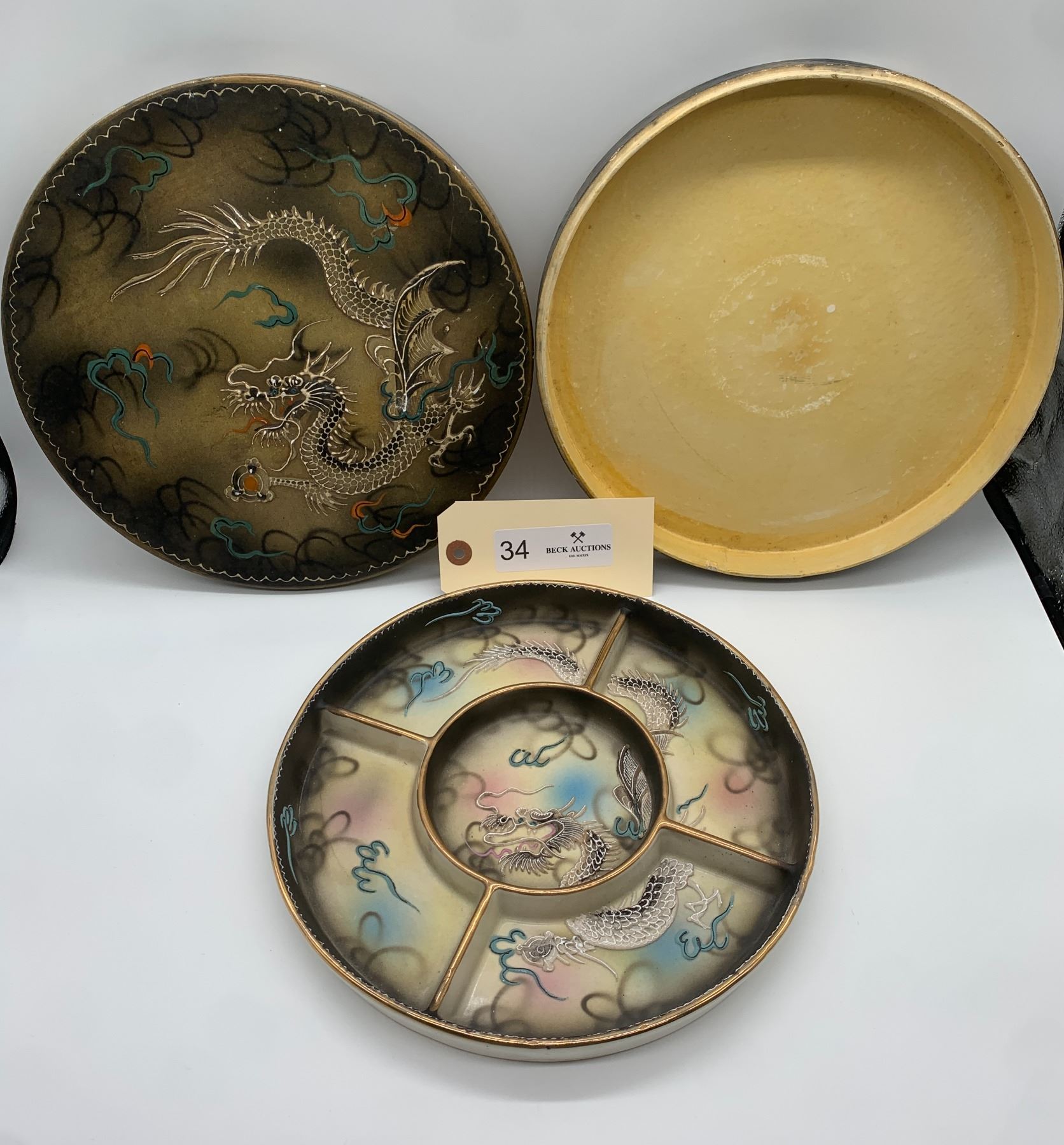 Antique Moriage Raised Dragonware Cheese and Cracker Plate With Ornate Case 10.75" Diameter