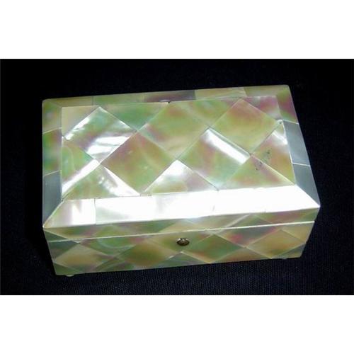 Absolutely exquisite mother-of-pearl box with diamond pearl design. Beautifully matched. The colors are exquisite, the matching and installation of the pearl shows great craftsmanship. Silk-lined. The lid is only .75 inch high. Total height is 2.25 inches. In pristine original condition. Rare and wonderful! </td></tr><tr> <td> </td></tr><tr> <td>Reference #: JBEC53</td></tr><tr><td>Condition:Pristine</td></tr><tr><td>Year:1860</td></tr><tr><td>Country:England</td></tr><tr><td>Height:2.25</td></tr><tr><td>Depth:3.0</td></tr><tr><td>Width:5.0</td></tr><tr><td>Title:Antique Mother-of-Pearl Footed Box</td></tr><tr><td>Location:New York USA</td></tr></table>