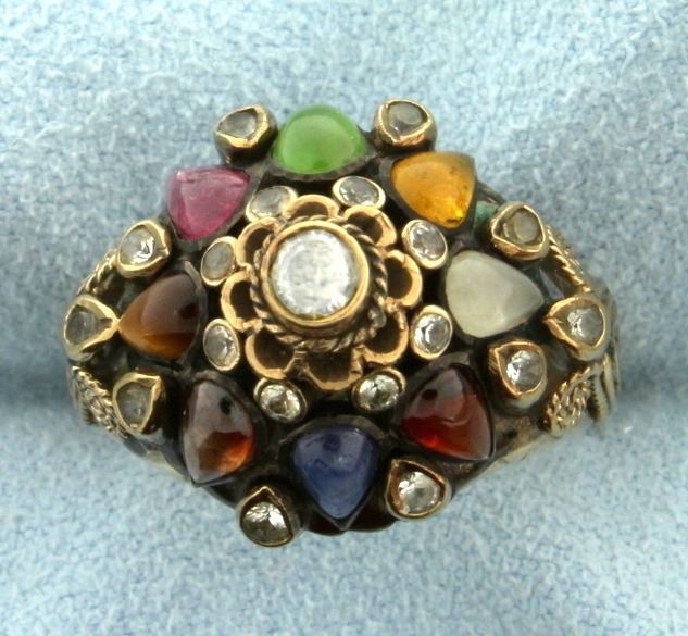 In 14k yellow gold. Contains a variety of high quality cabochon cut precious and semi precious stones including emerald, sapphire, ruby, citrine, amethyst, and chrysoberyl. Size 6 1/4. 5.5g.