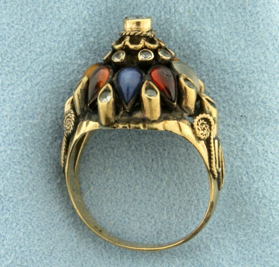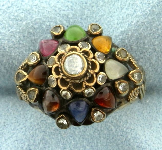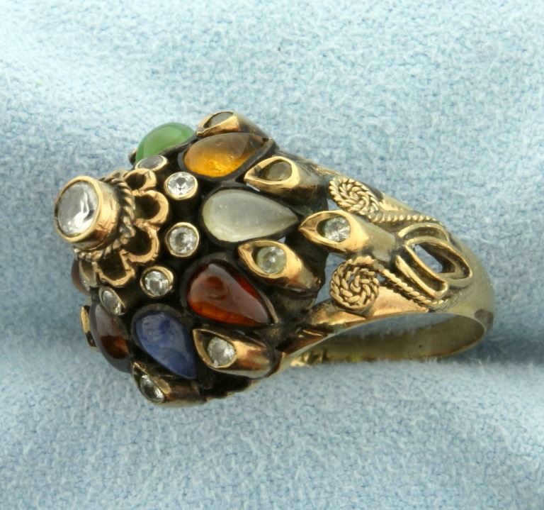In 14k yellow gold. Contains a variety of high quality cabochon cut precious and semi precious stones including emerald, sapphire, ruby, citrine, amethyst, and chrysoberyl. Size 6 1/4. 5.5g.