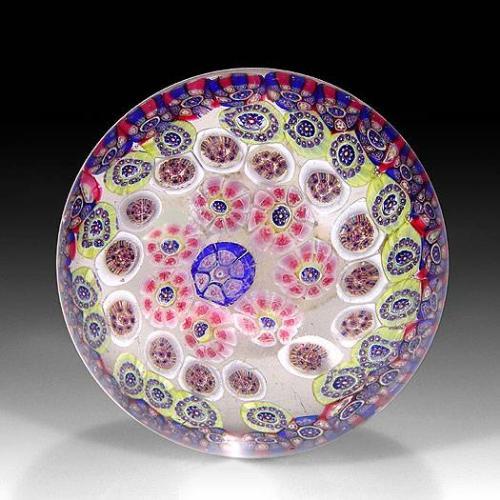 Antique New England Glass Company concentric millefiori paperweight. A blue complex star cane is encircled by four concentric rings of assorted complex canes, in pink, blue, chartreuse, and white. Surface wear. Diameter 2 11/16".