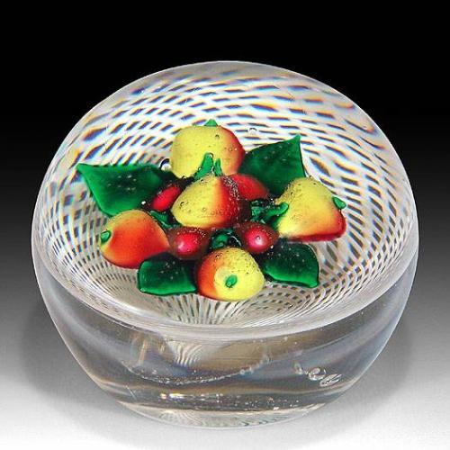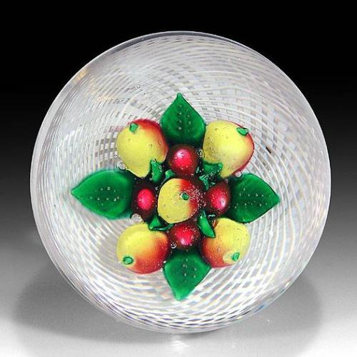 Antique New England Glass Company fruit paperweight. Fruit bouquet of yellow pears and cherries with green leaves on swirling white latticinio ground. Diameter 2 13/16". Donated by: John B. Walsh.<p>Proceeds from the auction will go to benefit Santa Cruz, California glass artist Steven Lundberg, who, after 30 years of blowing glass locally, was diagnosed with amyotrophic lateral sclerosis, or ALS (Lou Gehrig's disease). This auction is a fundraising effort to help Steve meet the challenges of this disease.<p>Costs of treating ALS over a period of time can be exorbitant. In the short-term, Steve needs basic equipment such as an electric scooter and pointing devices to help him read and write.<p>Please join us for this auction, and help support a friend. Check out our other auctions to see the 150 paperweights, vessels, and glass sculptures from internationally known glass artists, donated by generous artists, galleries, and glass collectors from all over the country. Please contact us at 1-800-538-0766 or (831) 427-1177 for more information, or see <a href=http://www.selman.com/press target=_blank>www.selman.com/press</a>.