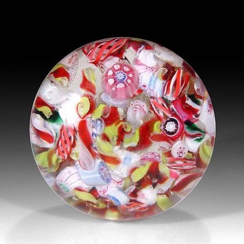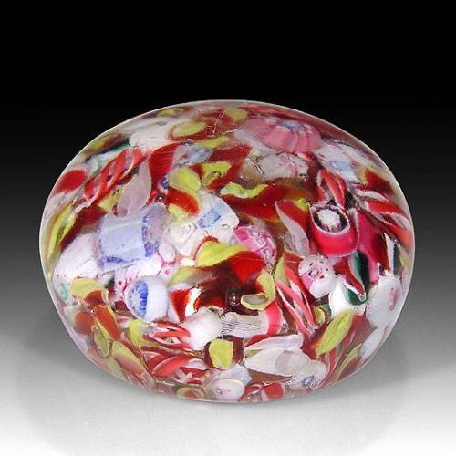 Antique New England Glass Company scrambled millefiori paperweight, with several whole and partial complex canes, colored filigree, twists, and white latticinio. Unpolished base. Surface wear. Diameter 2 5/8".